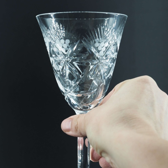 Plono krištolo taurės su Mid Century stiliaus raižiniais