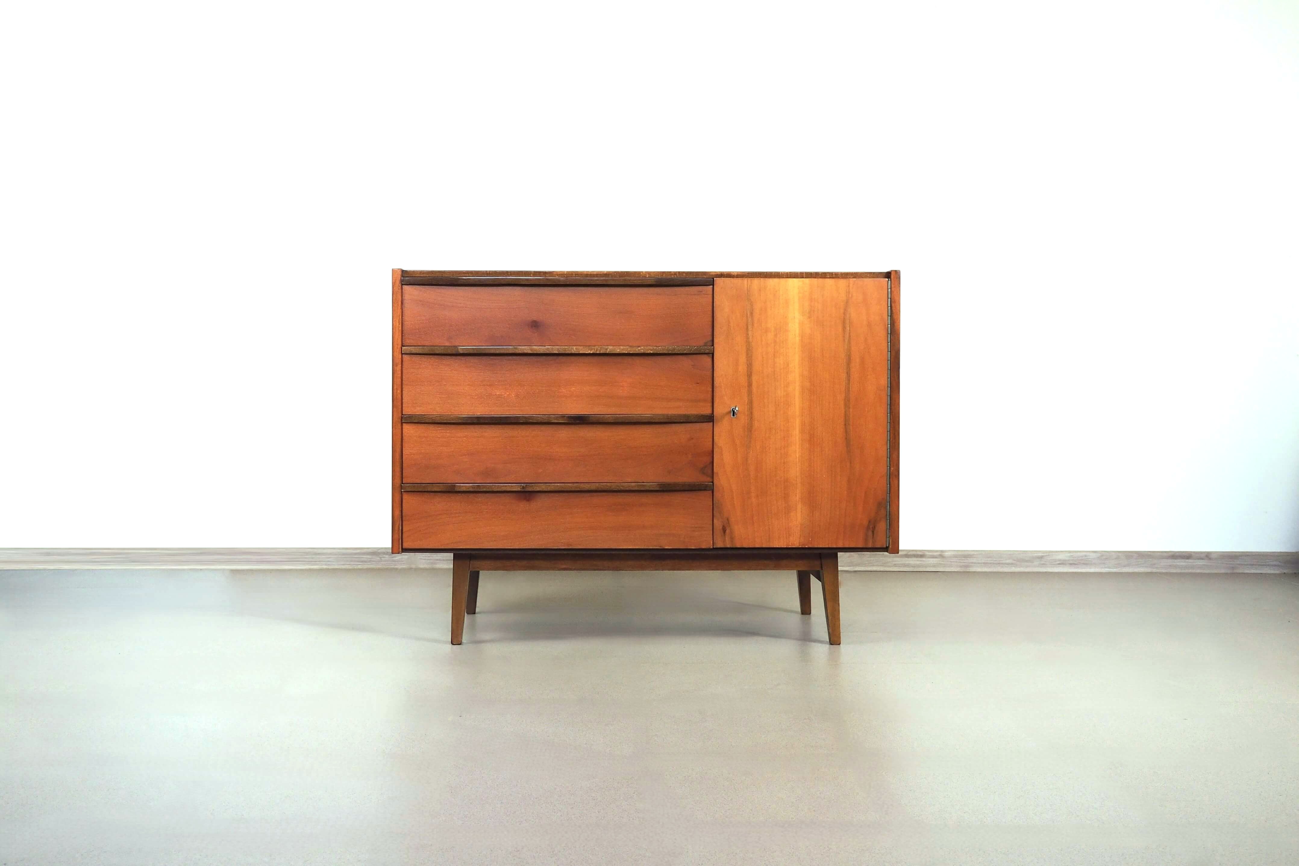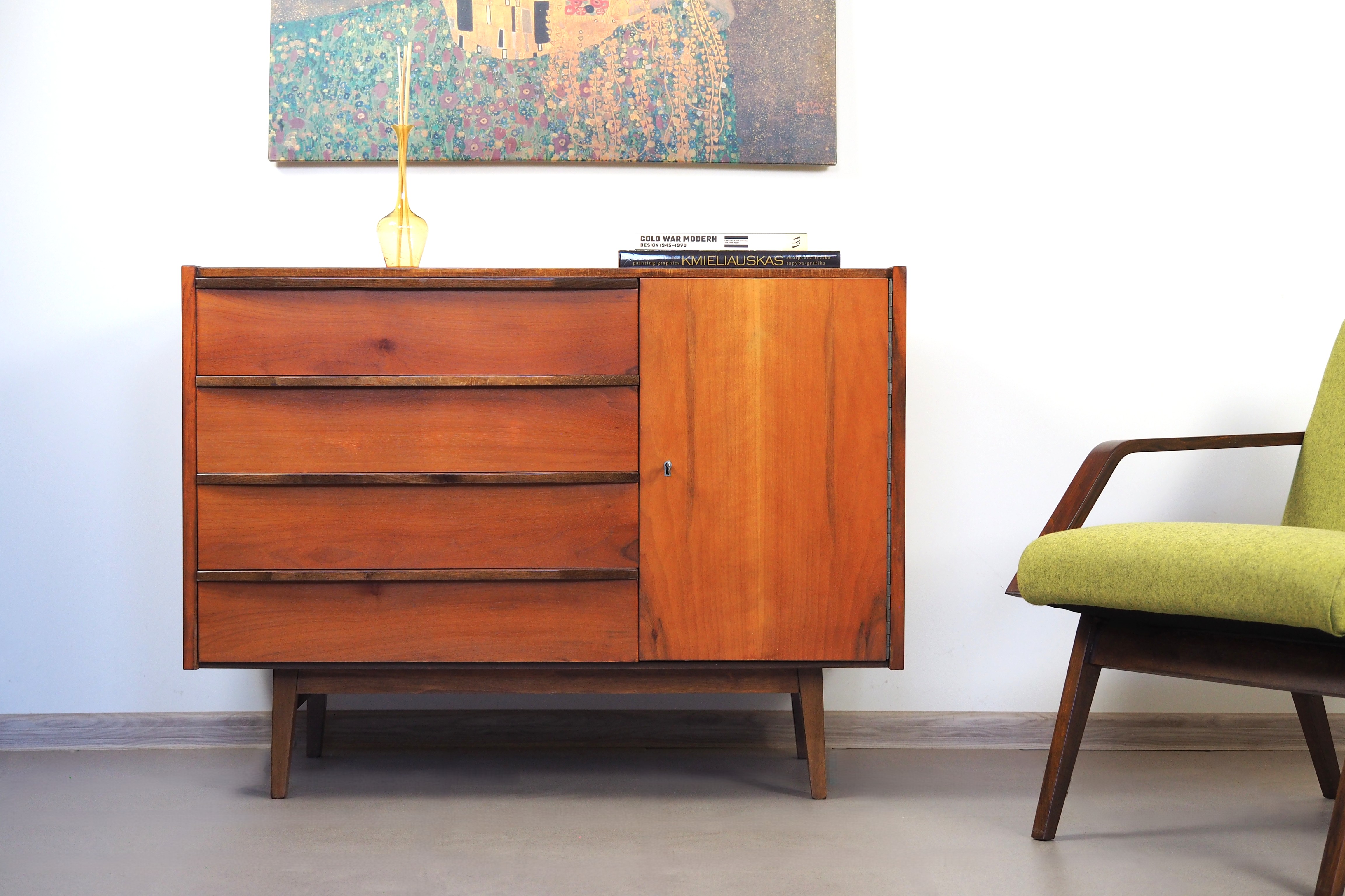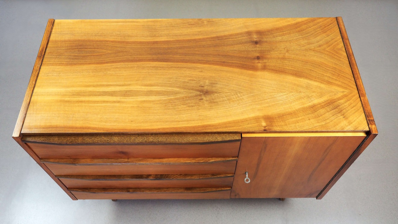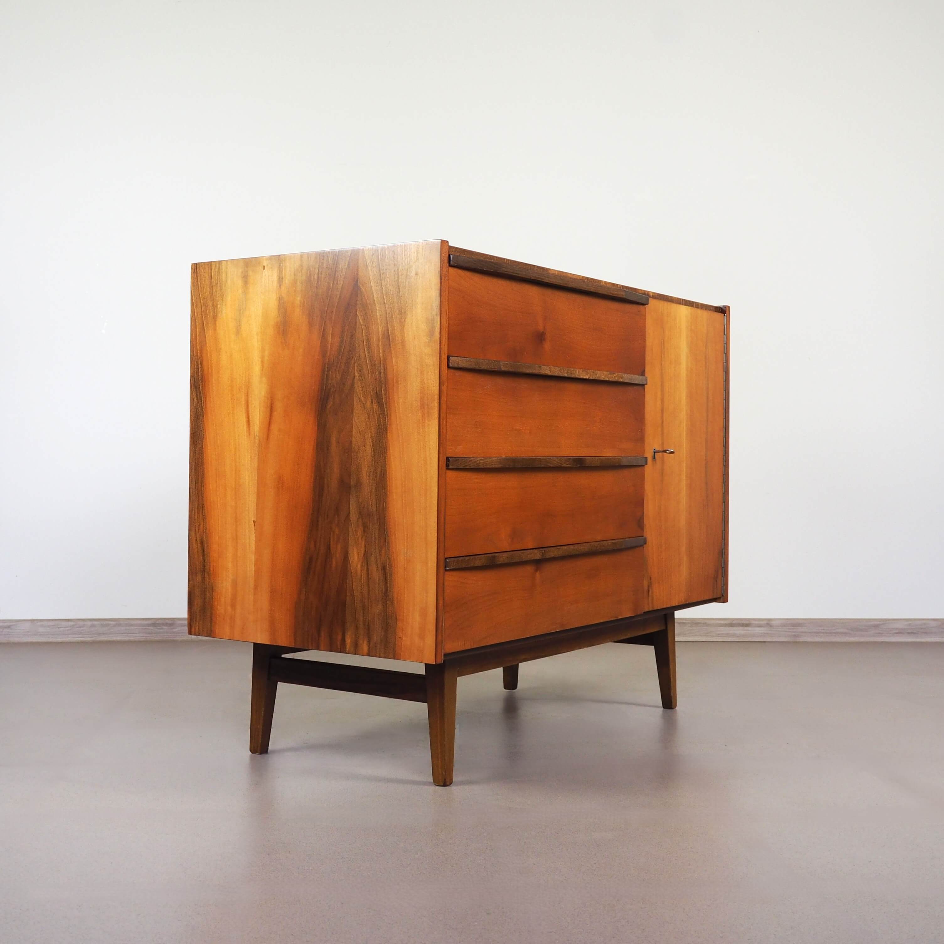 Nedidelė čekoslovakiška riešutmedžio komodėlė su stalčiais. Atpažįstamas garsaus dizainerio Františeko Mezulániko braižas - ilgos stalčių rankenėlės ir subtilus spalvų žaismas. Komoda pagaminta "Interier Praha" baldų fabrike. F.Mezulániko projektuoti baldai eksponuojami parodose ir muziejuose kaip pavyzdiniai Mid Century Modern laikmečio kūriniai.