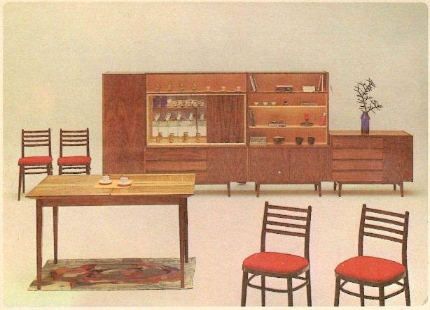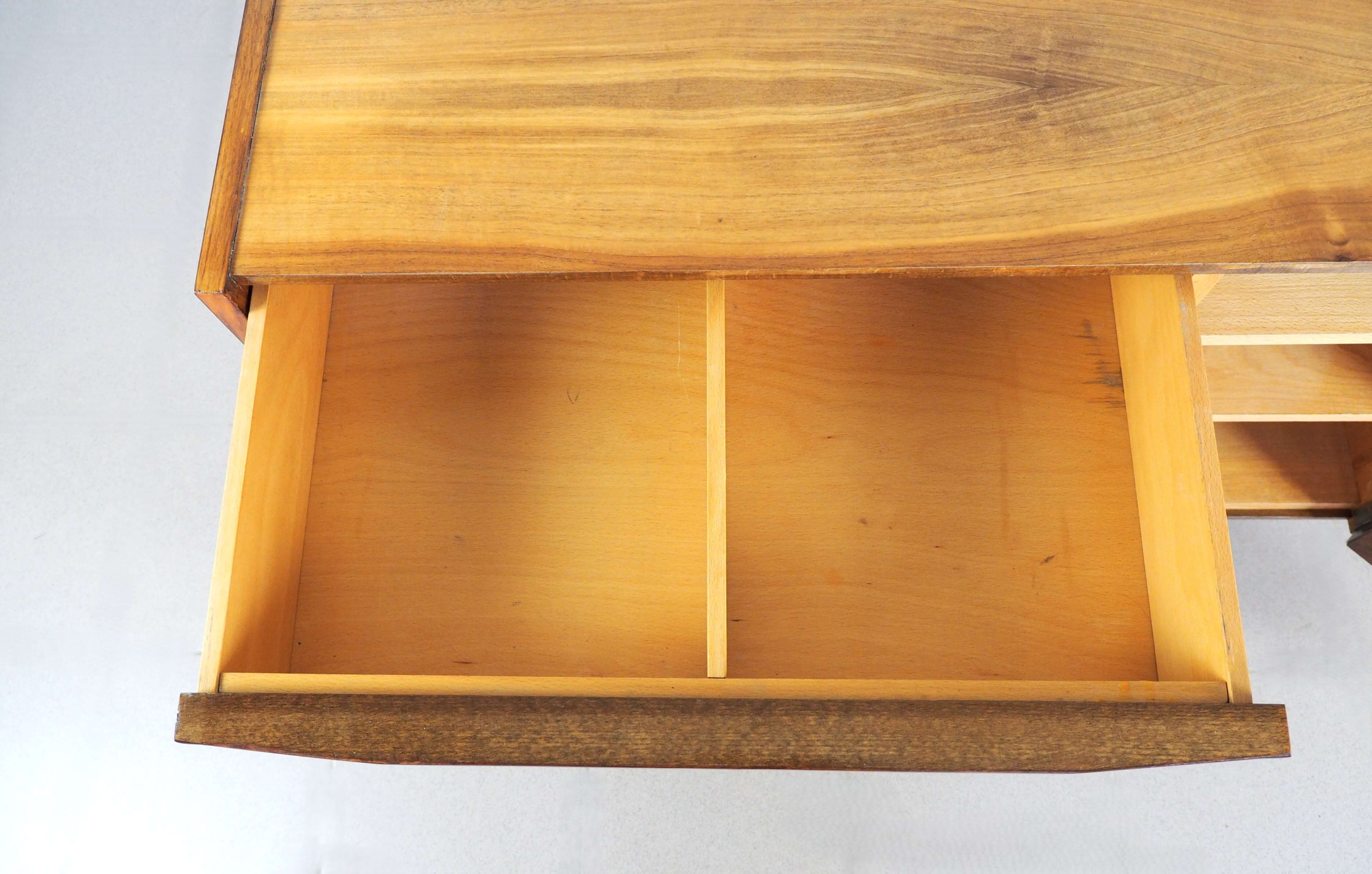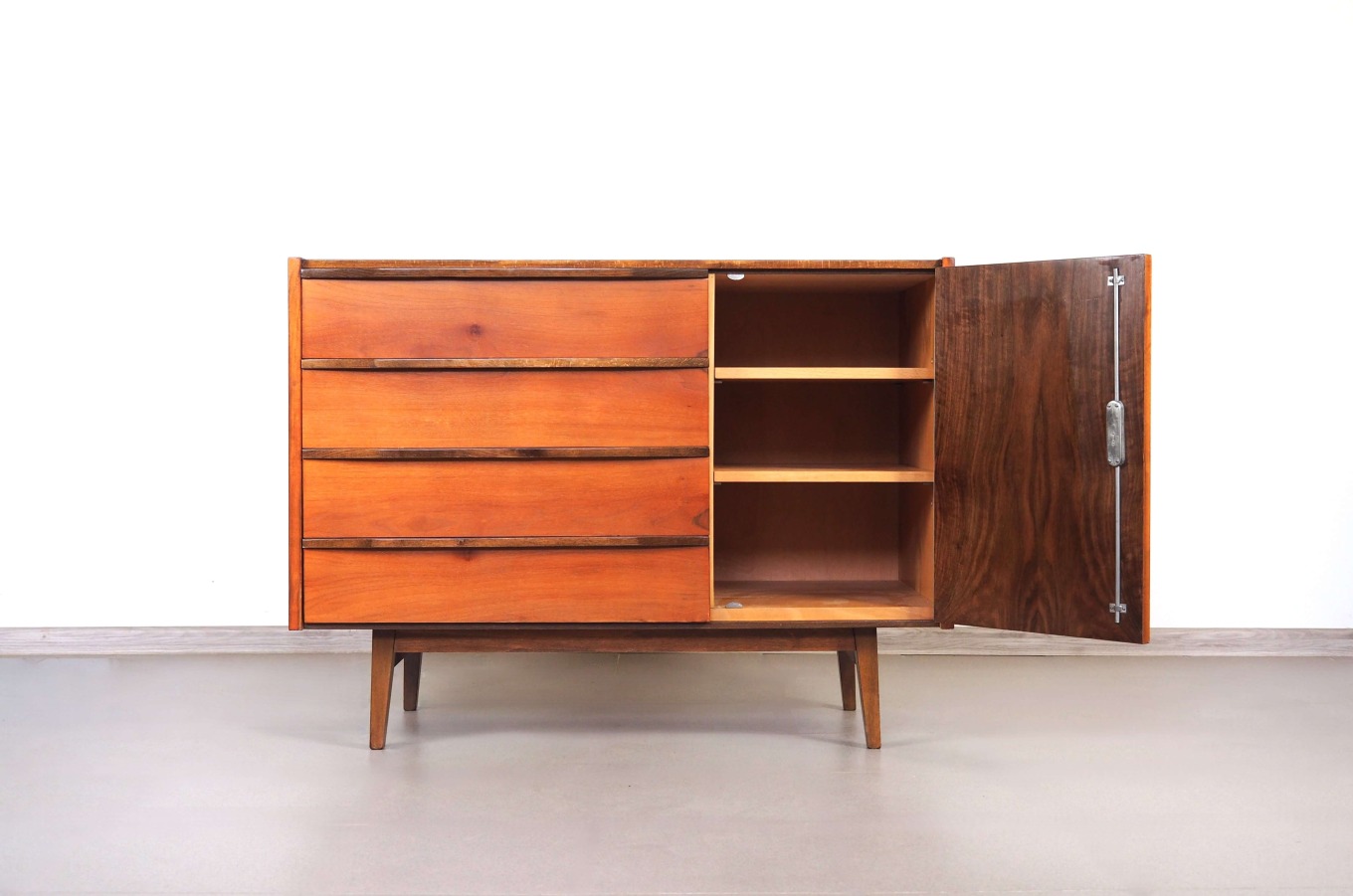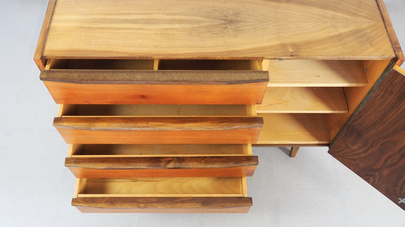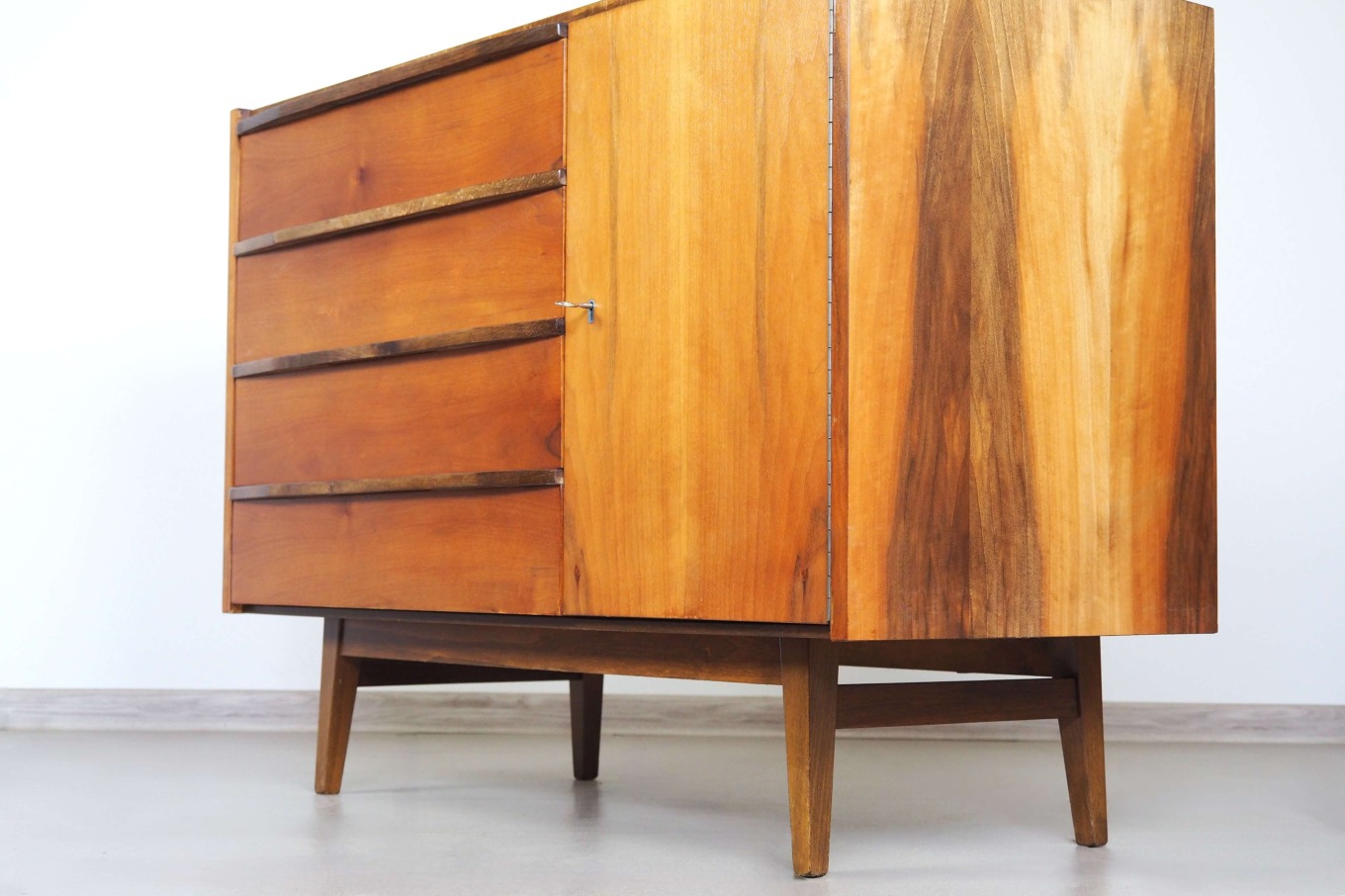 Nedidelė čekoslovakiška riešutmedžio komodėlė su stalčiais. Atpažįstamas garsaus dizainerio Františeko Mezulániko braižas - ilgos stalčių rankenėlės ir subtilus spalvų žaismas. Komoda pagaminta "Interier Praha" baldų fabrike. F.Mezulániko projektuoti baldai eksponuojami parodose ir muziejuose kaip pavyzdiniai Mid Century Modern laikmečio kūriniai.