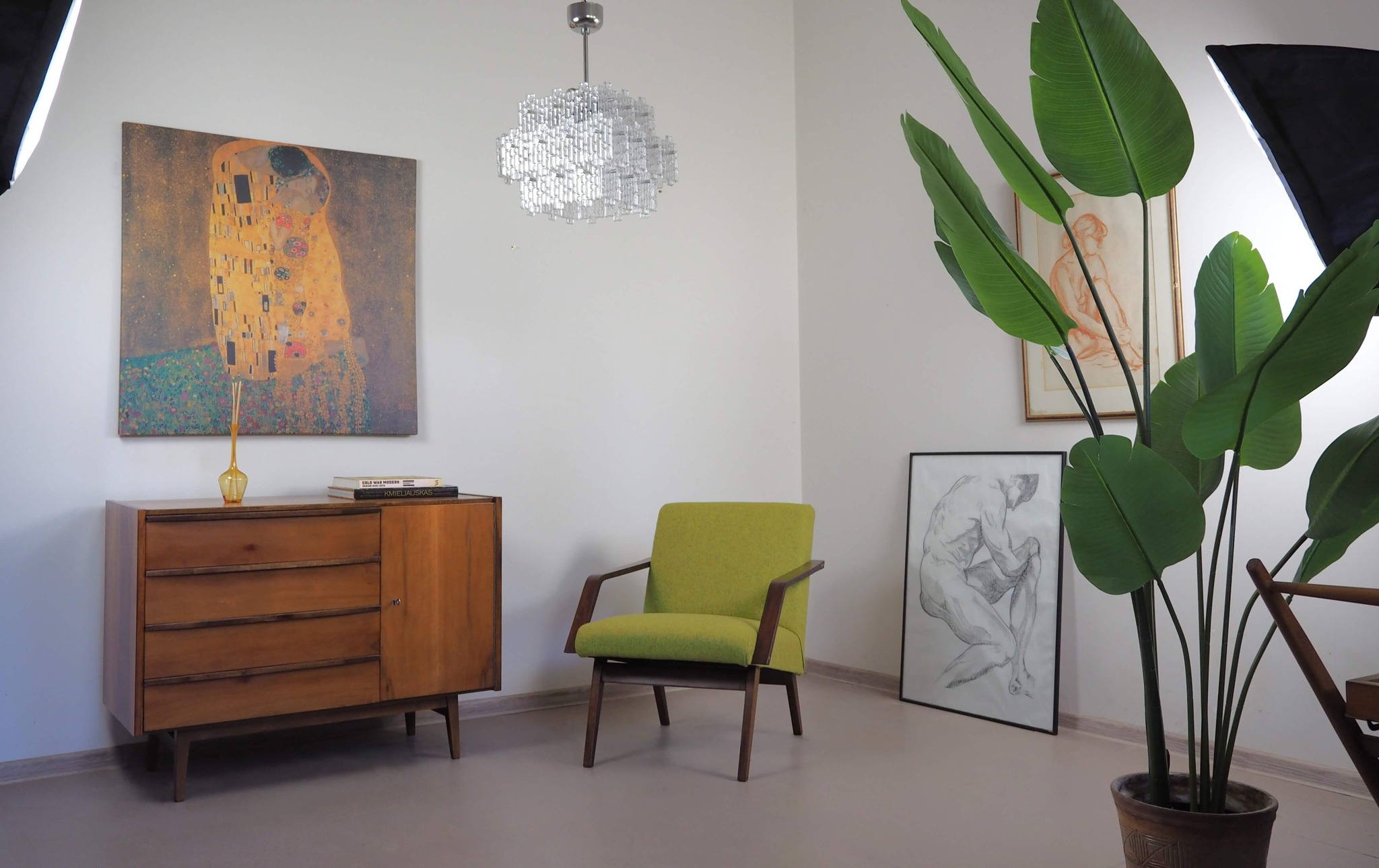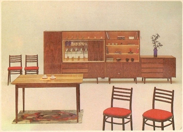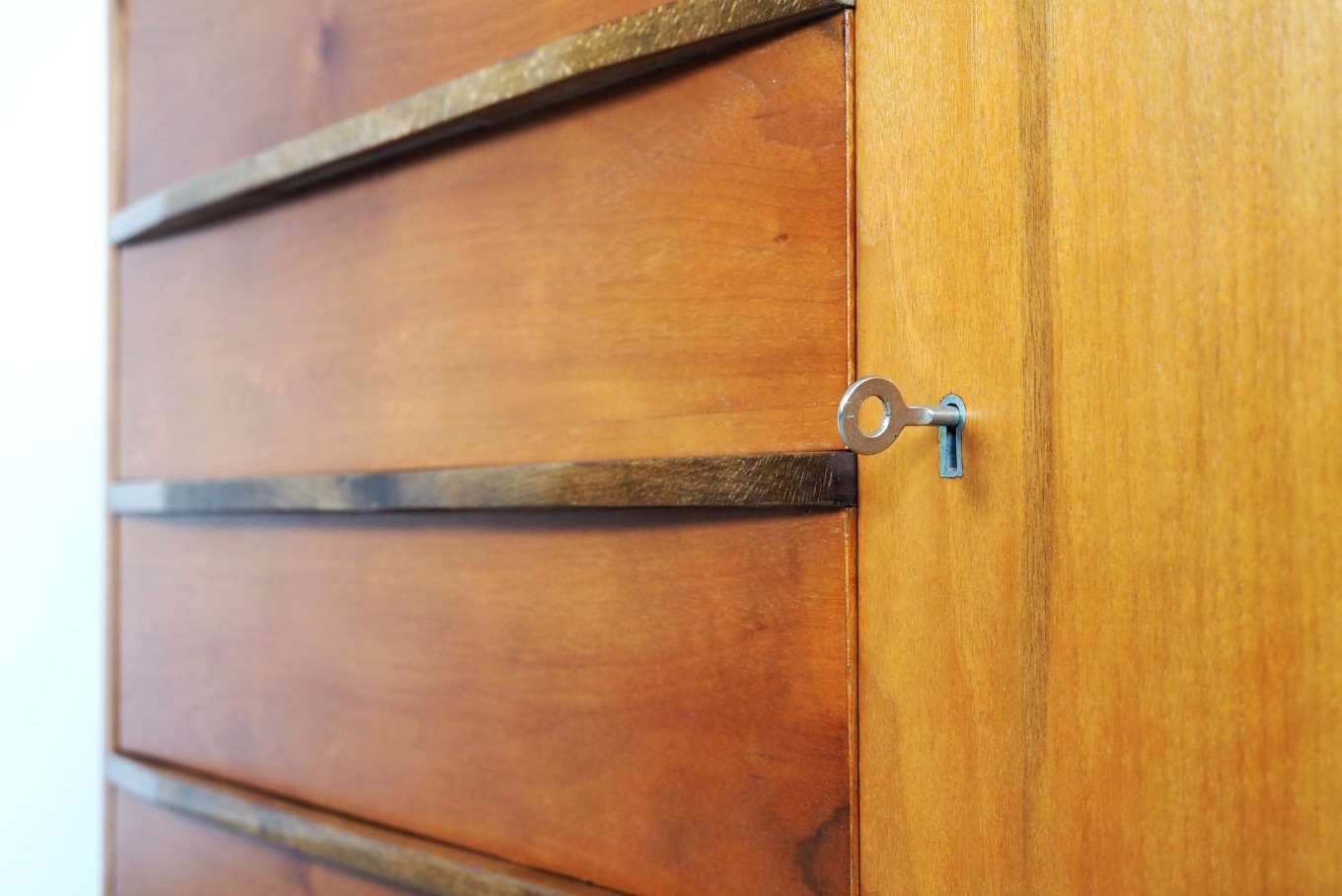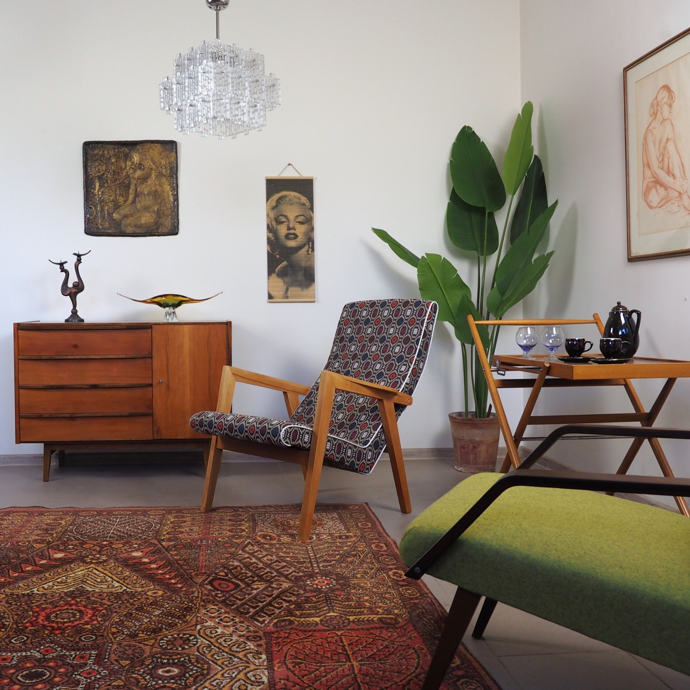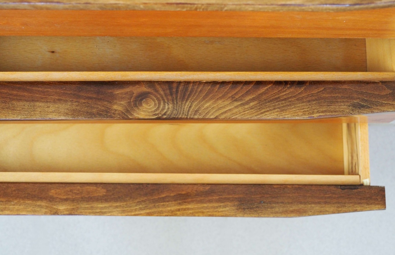 Nedidelė čekoslovakiška riešutmedžio komodėlė su stalčiais. Atpažįstamas garsaus dizainerio Františeko Mezulániko braižas - ilgos stalčių rankenėlės ir subtilus spalvų žaismas. Komoda pagaminta "Interier Praha" baldų fabrike. F.Mezulániko projektuoti baldai eksponuojami parodose ir muziejuose kaip pavyzdiniai Mid Century Modern laikmečio kūriniai.