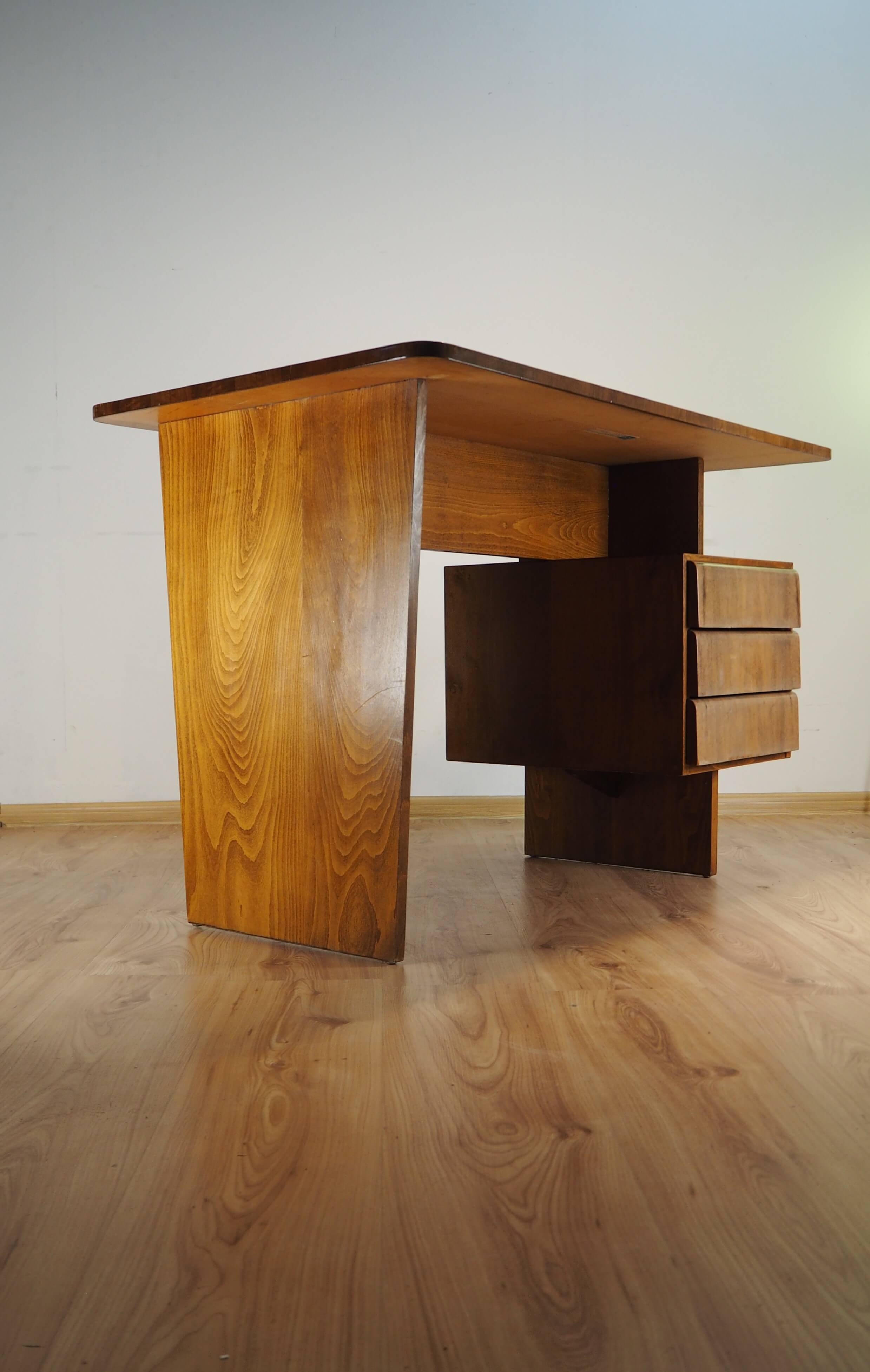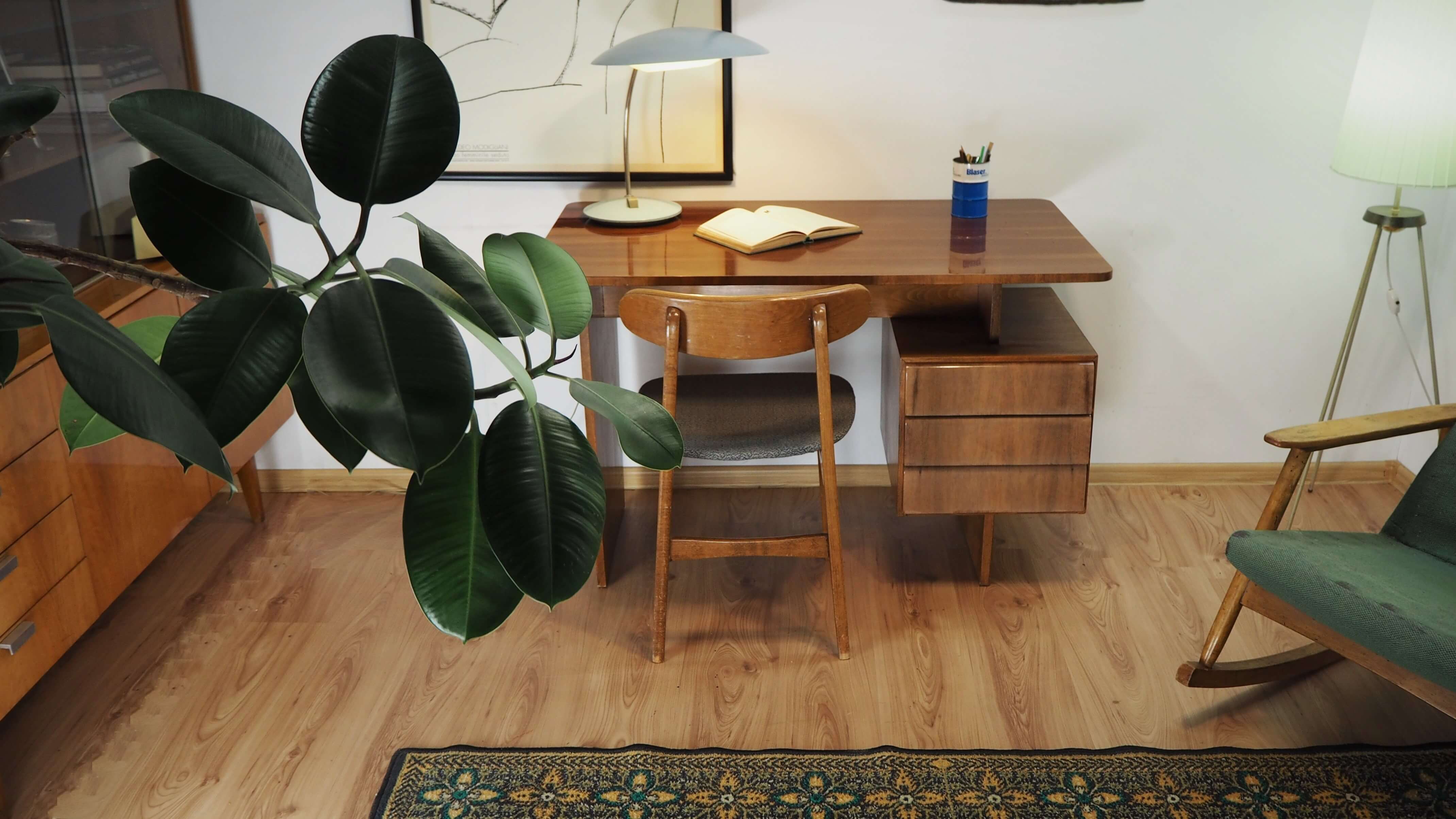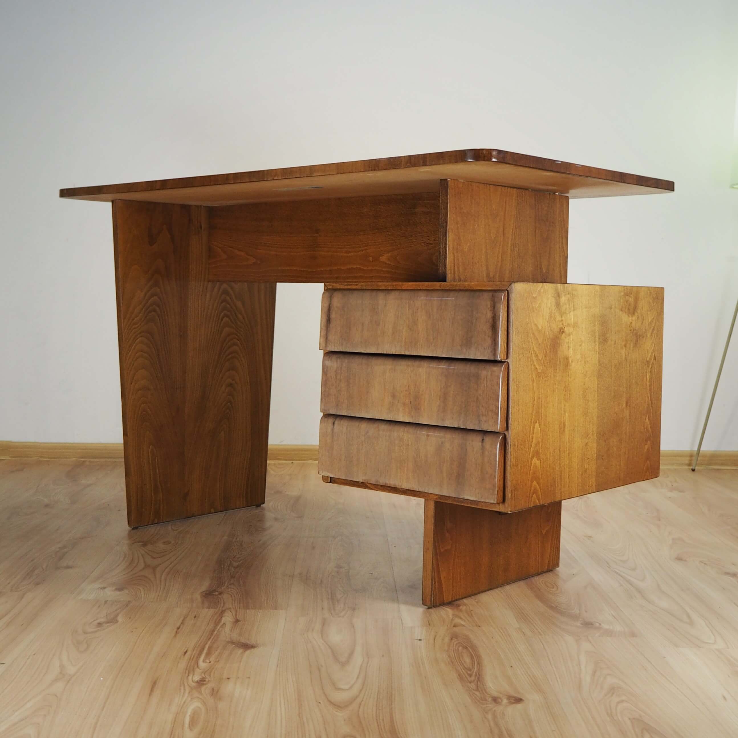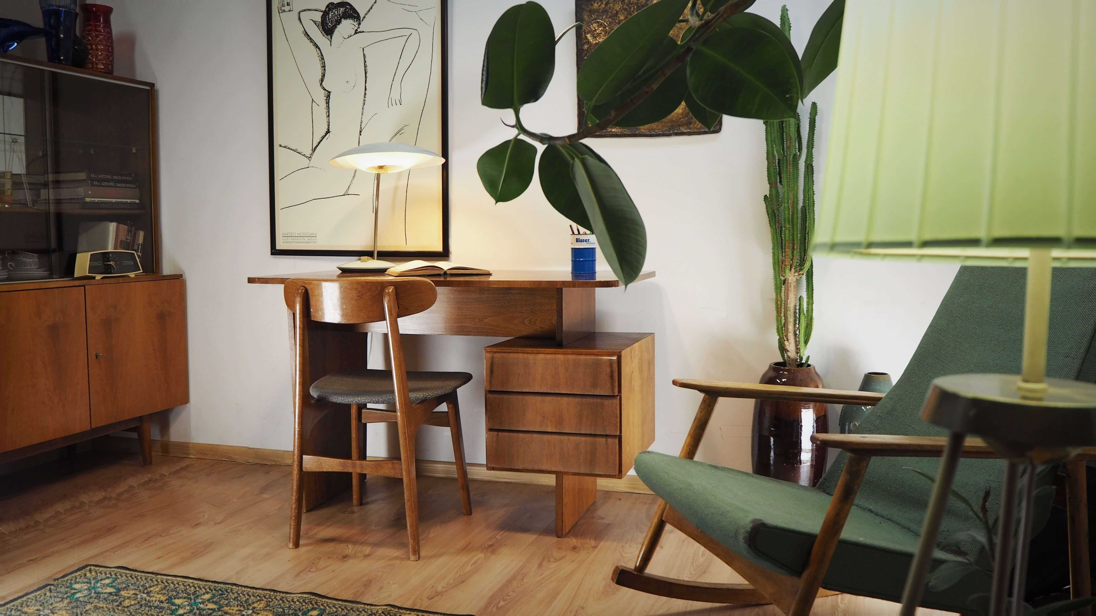 Čekoslovakiškas rašomasis stalas, sukurtas garsaus dizainerio Bohumilo Landsmano. Stalas palieka įspūdį dėl architektūriškai aiškios formos. Stalčių blokas tarsi pakibęs ore, vizualiai balansuoja ant vienos atramos, kas primena brutalistinio stiliaus pastatų struktūrą. Vaizdą sušildo jauki medienos spalva ir unikalūs raštai. Stalas itin lengvas, patogus, kompaktiškas.