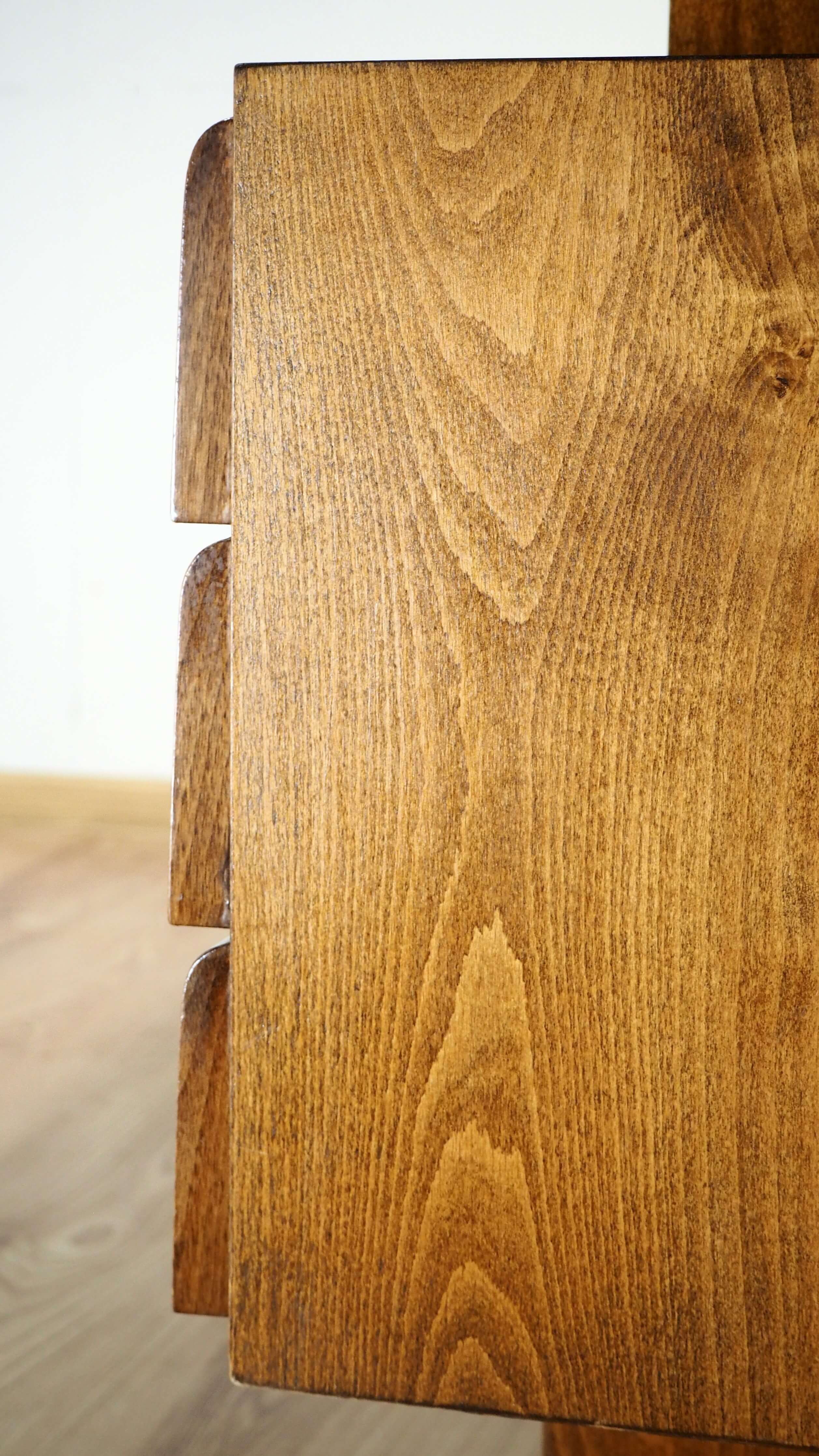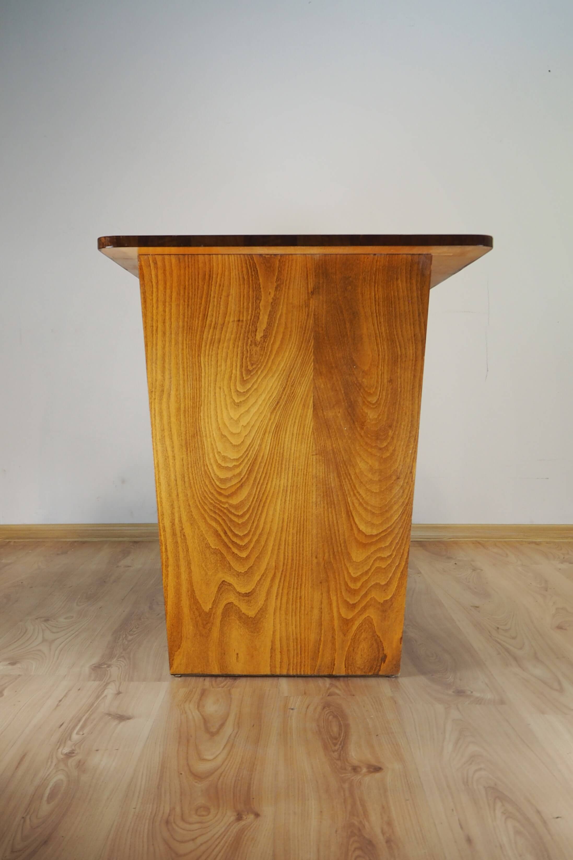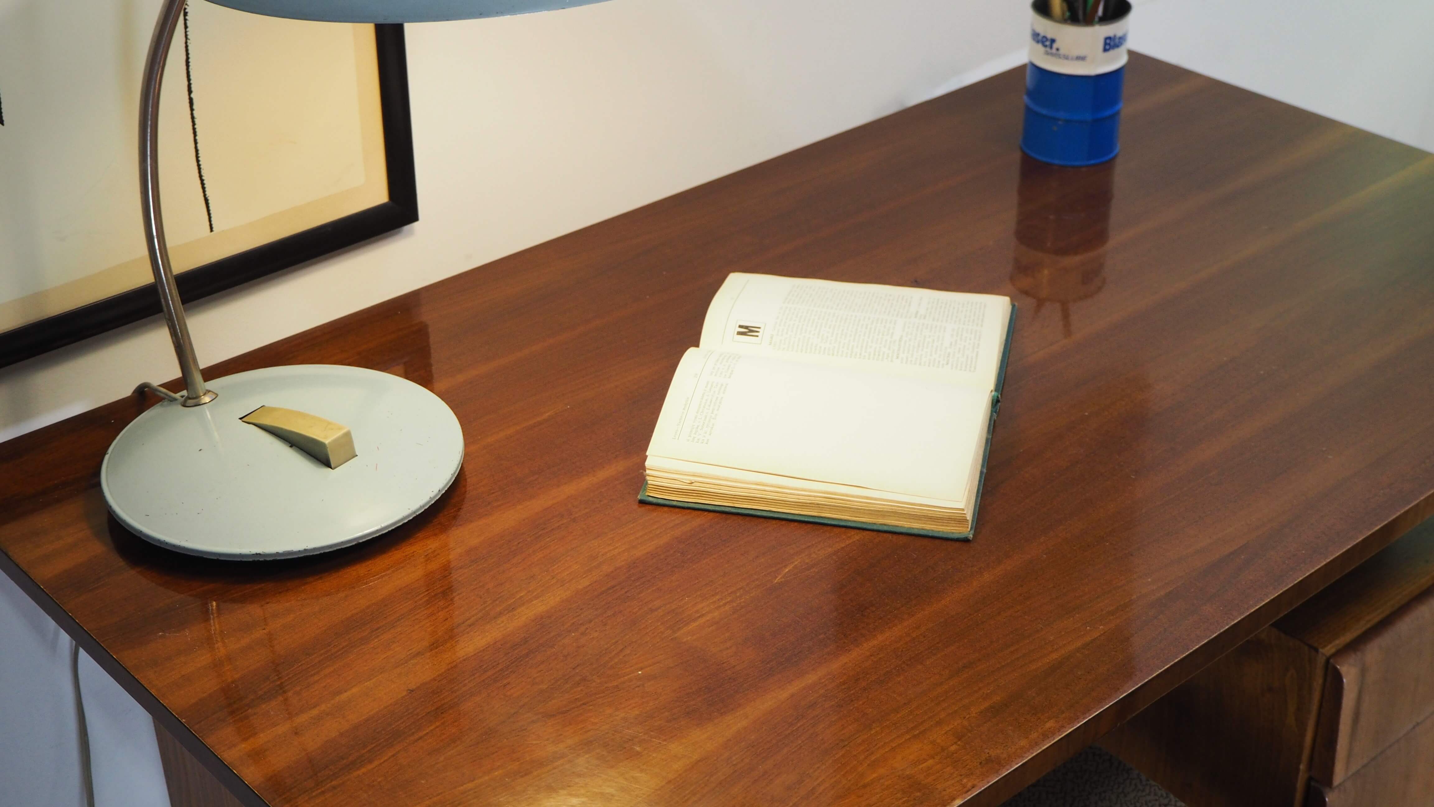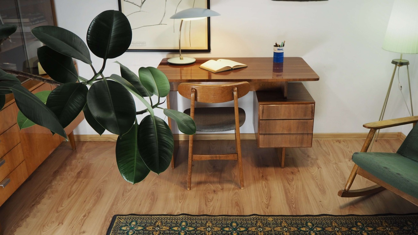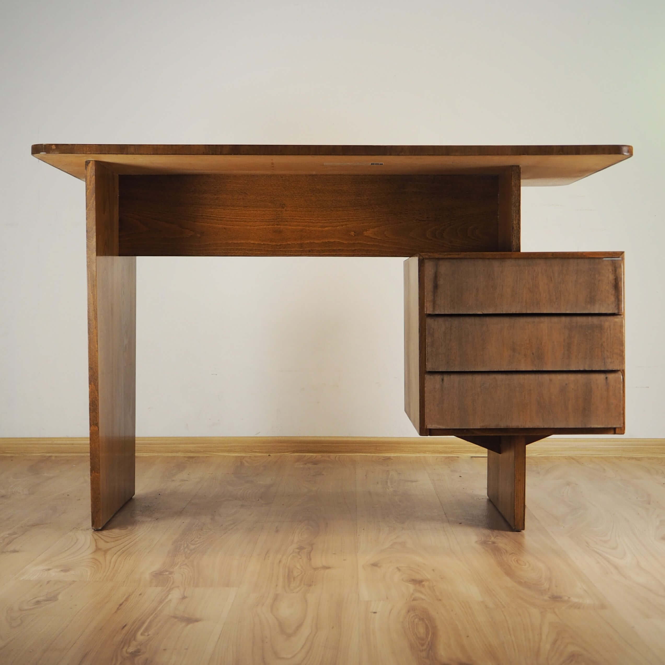 Čekoslovakiškas rašomasis stalas, sukurtas garsaus dizainerio Bohumilo Landsmano. Stalas palieka įspūdį dėl architektūriškai aiškios formos. Stalčių blokas tarsi pakibęs ore, vizualiai balansuoja ant vienos atramos, kas primena brutalistinio stiliaus pastatų struktūrą. Vaizdą sušildo jauki medienos spalva ir unikalūs raštai. Stalas itin lengvas, patogus, kompaktiškas.