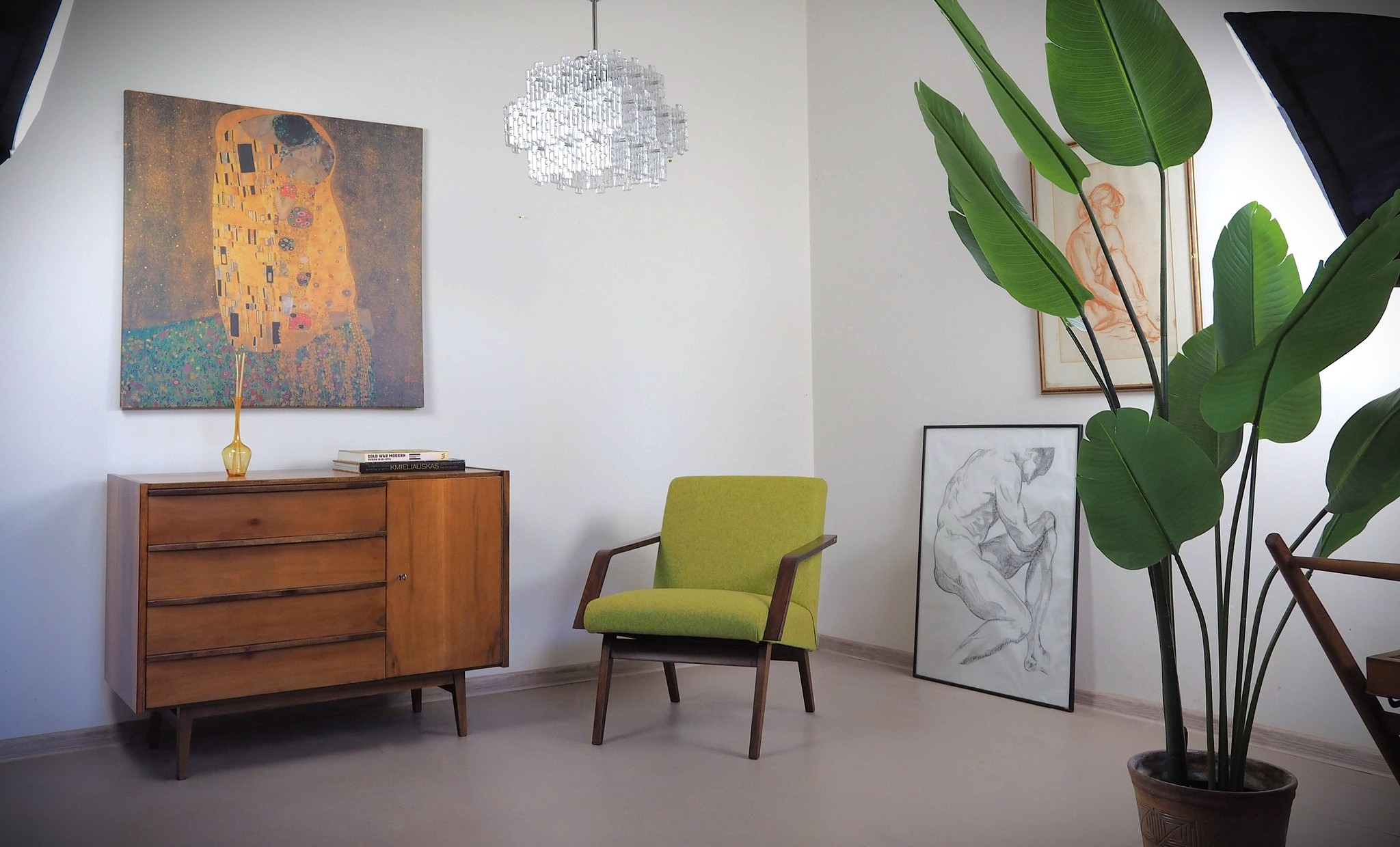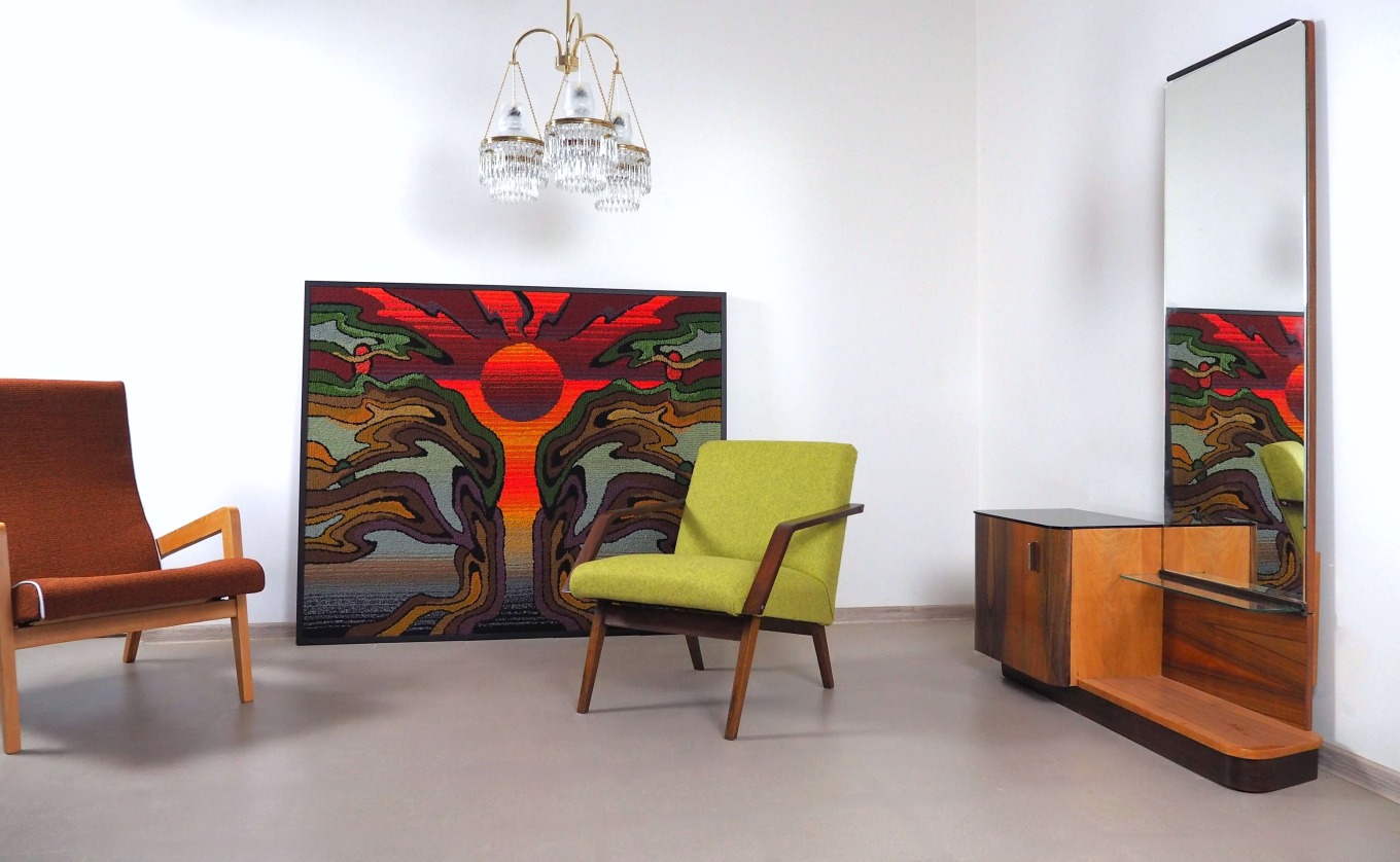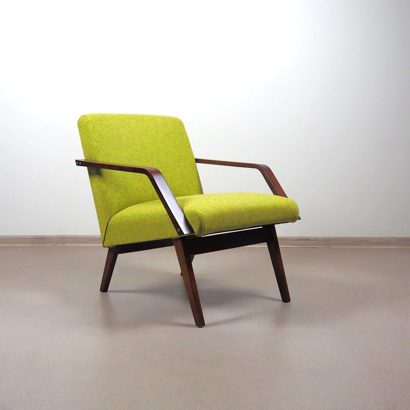 Unikalus kompaktiškas foteliukas, kuris neužims daug vietos net mažoje erdvėje. Minimalistinis Mid Century dizainas, sukurtas tuometinėje Čekoslovakijoje. Grakščios medinės kojos ir porankiai. Gražus, tvirtas ir patikimas baldas.