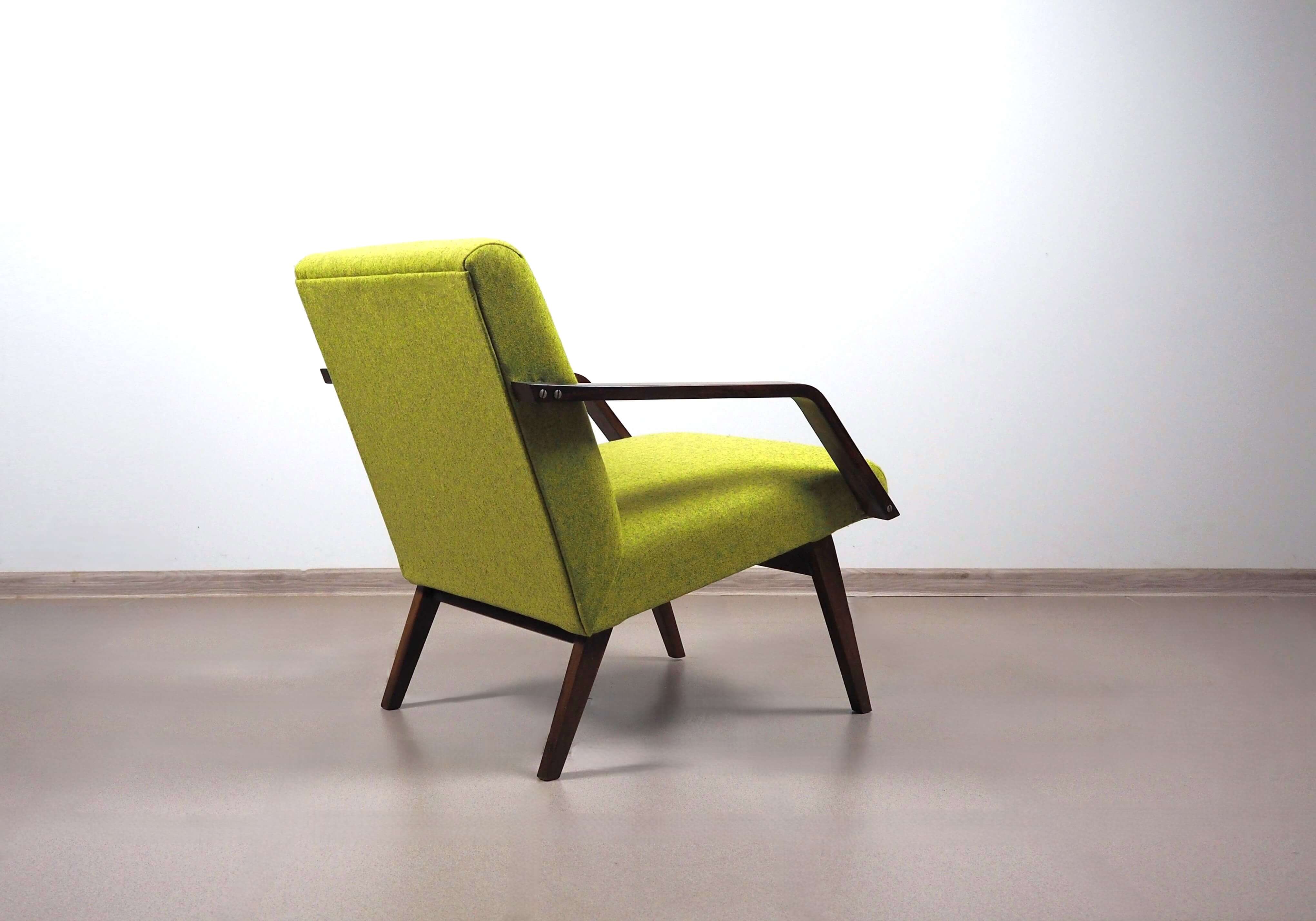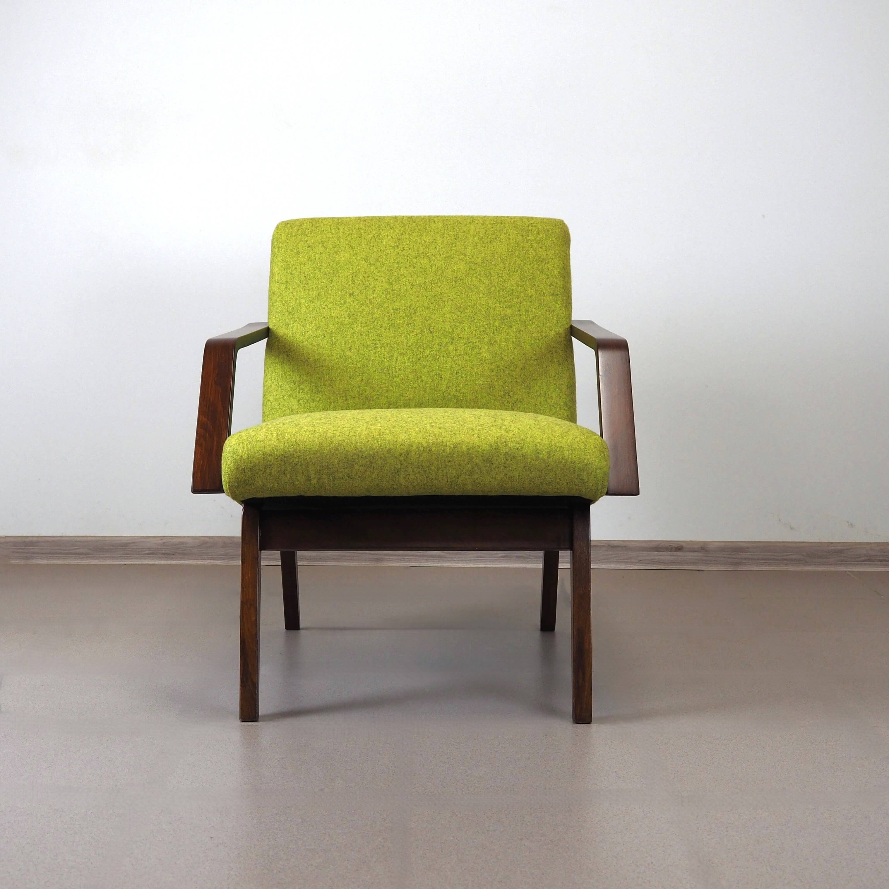 Foteliukas yra restauruotas, pervilktas laimo spalvos vilnoniu "Nevotex" gobelenu, galima įsigyti ir naudoti iškart.