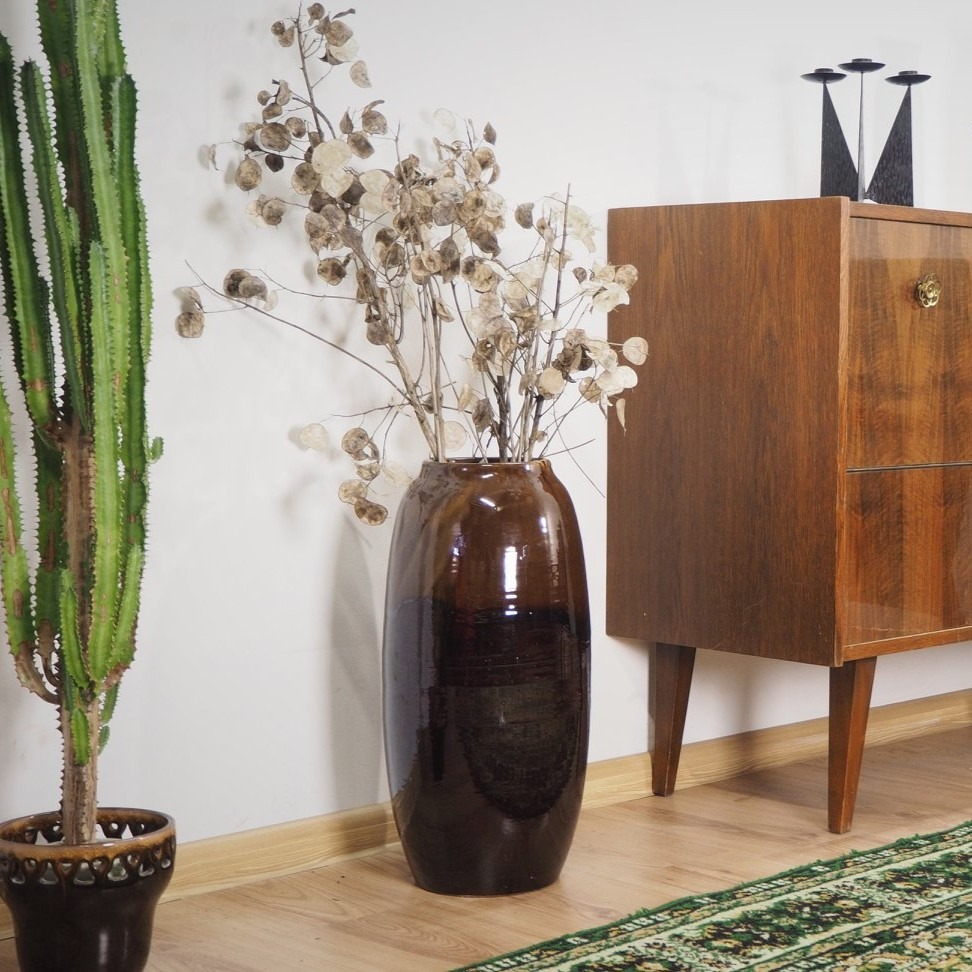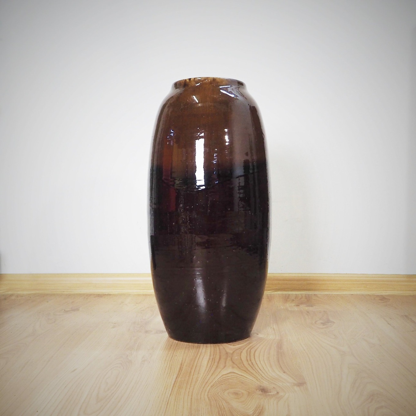 Lietuviška vintažinė ant grindų statoma glazūruotos keramikos vaza. Moderni minimalistinė verpstės forma ir neįkyrios natūralios spalvos subtiliai papuošia interjerą. Gražiai dera didesnėse vazų grupėse.