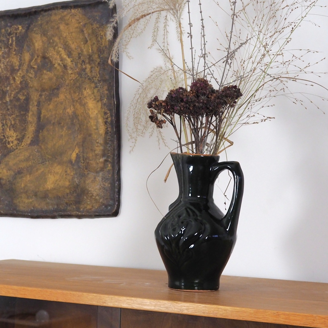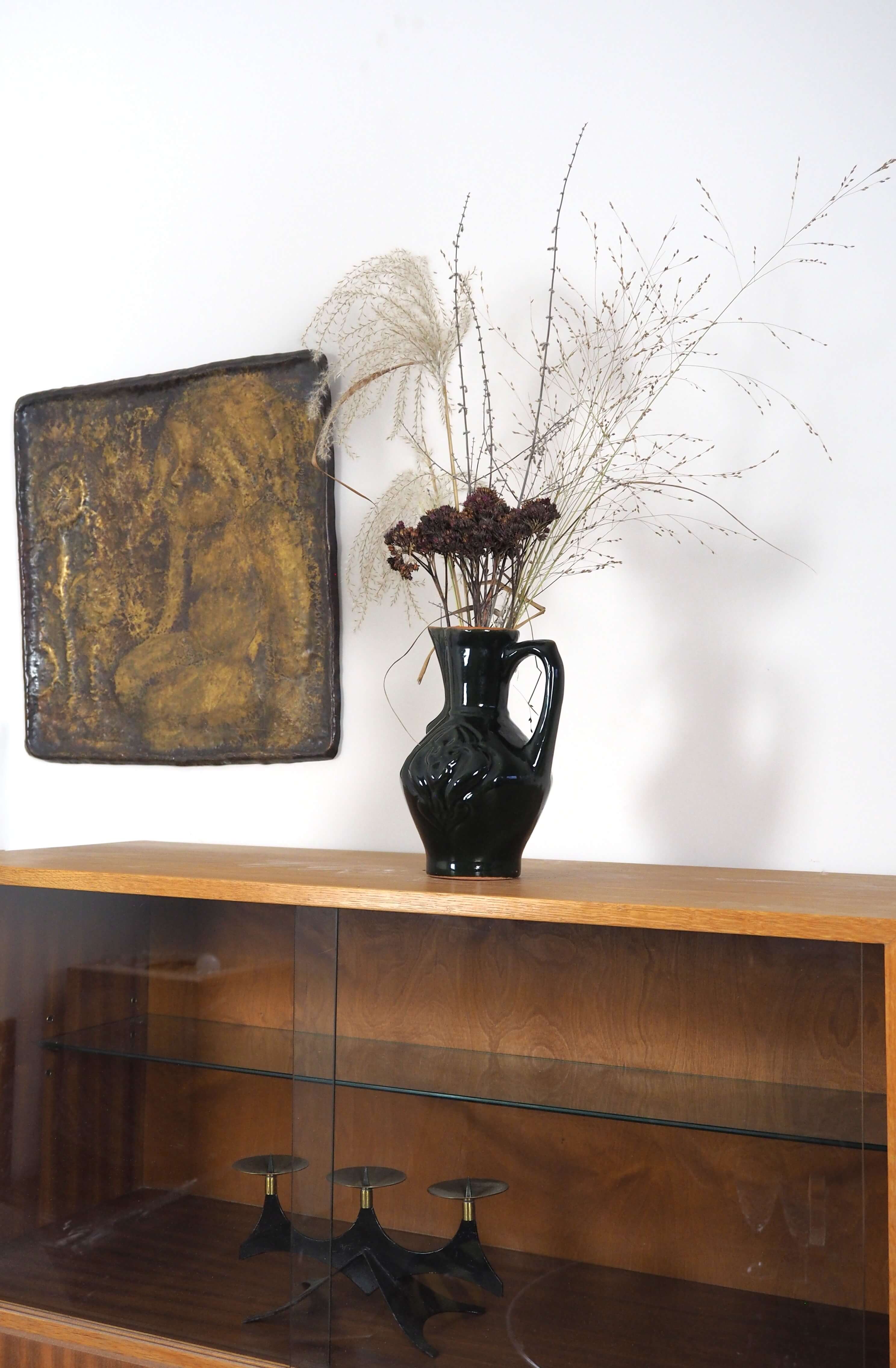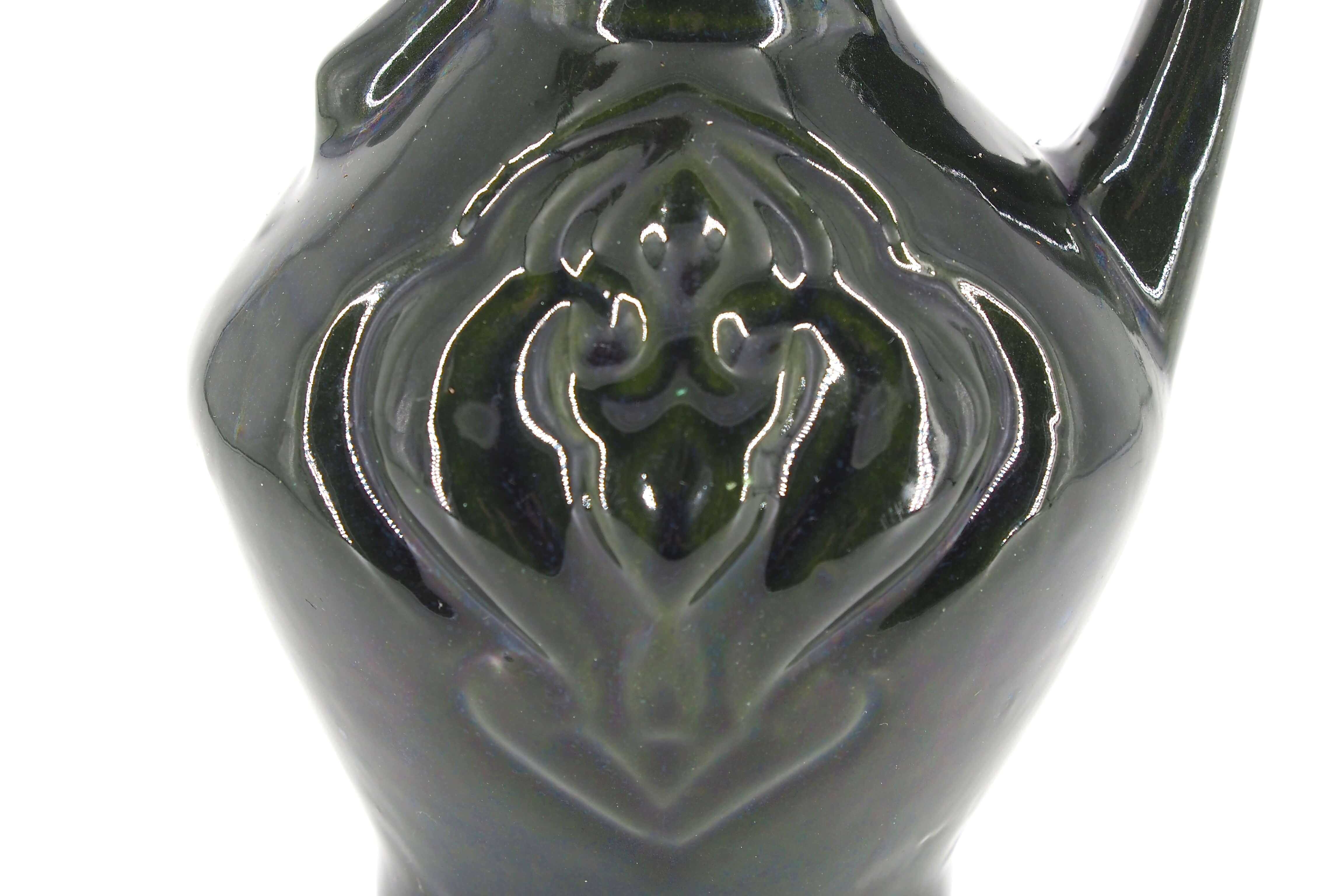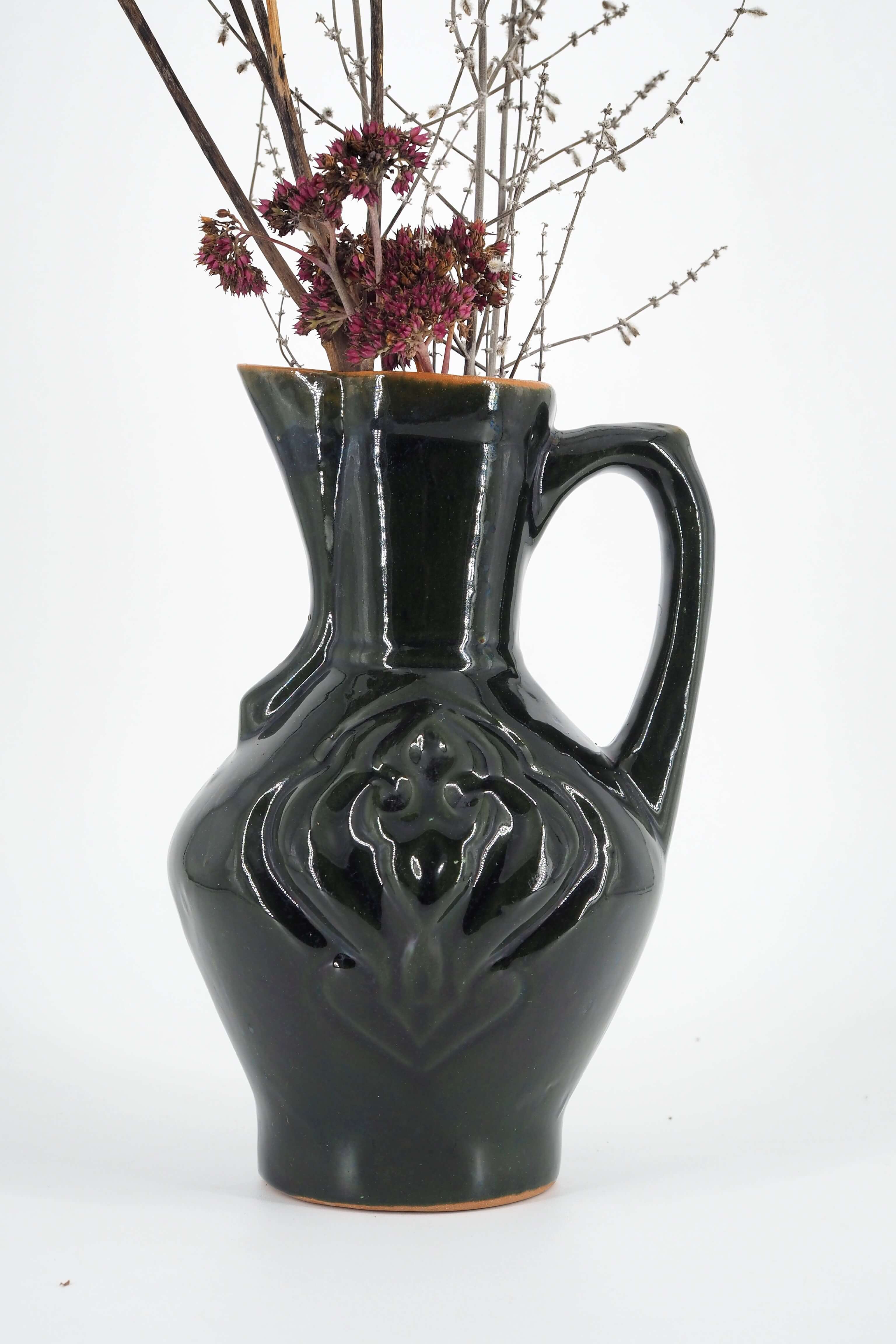 Kas šioje vazoje tautiška? Tai ąsočio forma ir tulpės ornamentas, kurie žadina senųjų Lietuvos sodybų nostalgiją. Kas modernu? Tai grakšti minimalistinė forma ir stilinga gilios žalios, beveik juodos spalvos glazūra.
