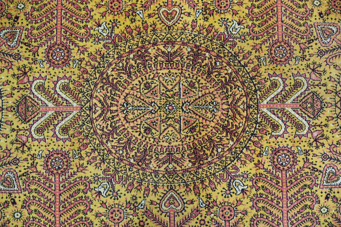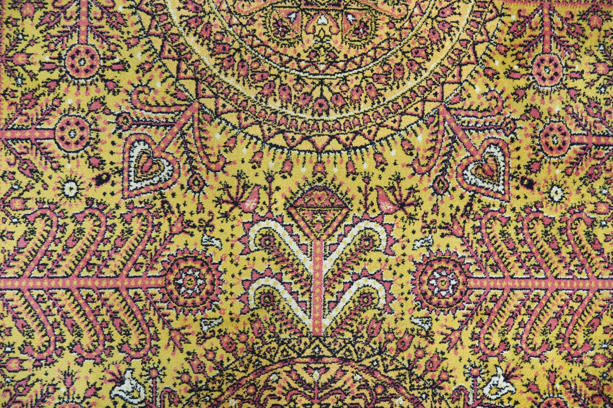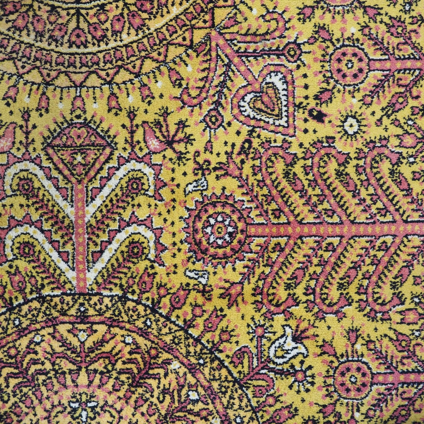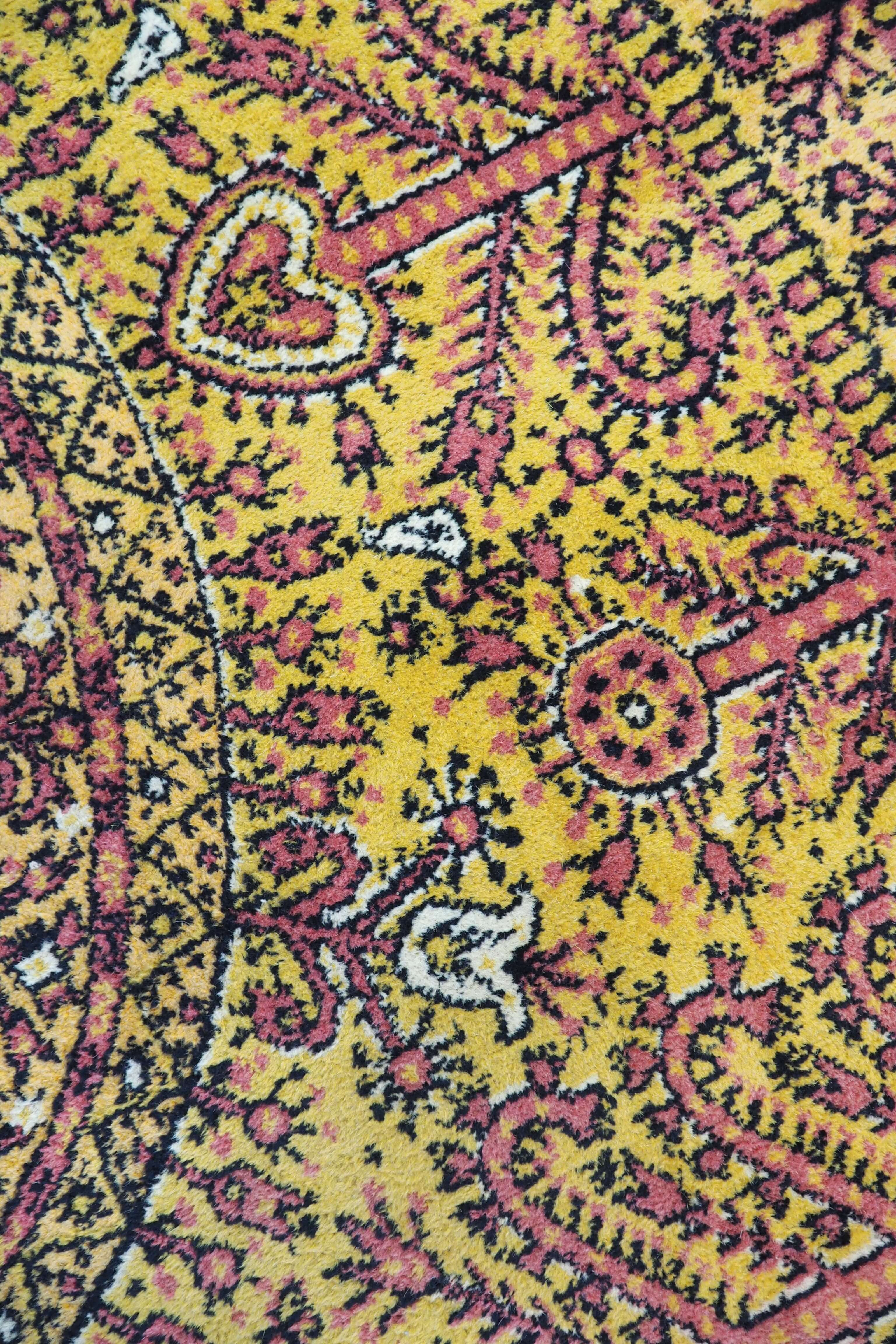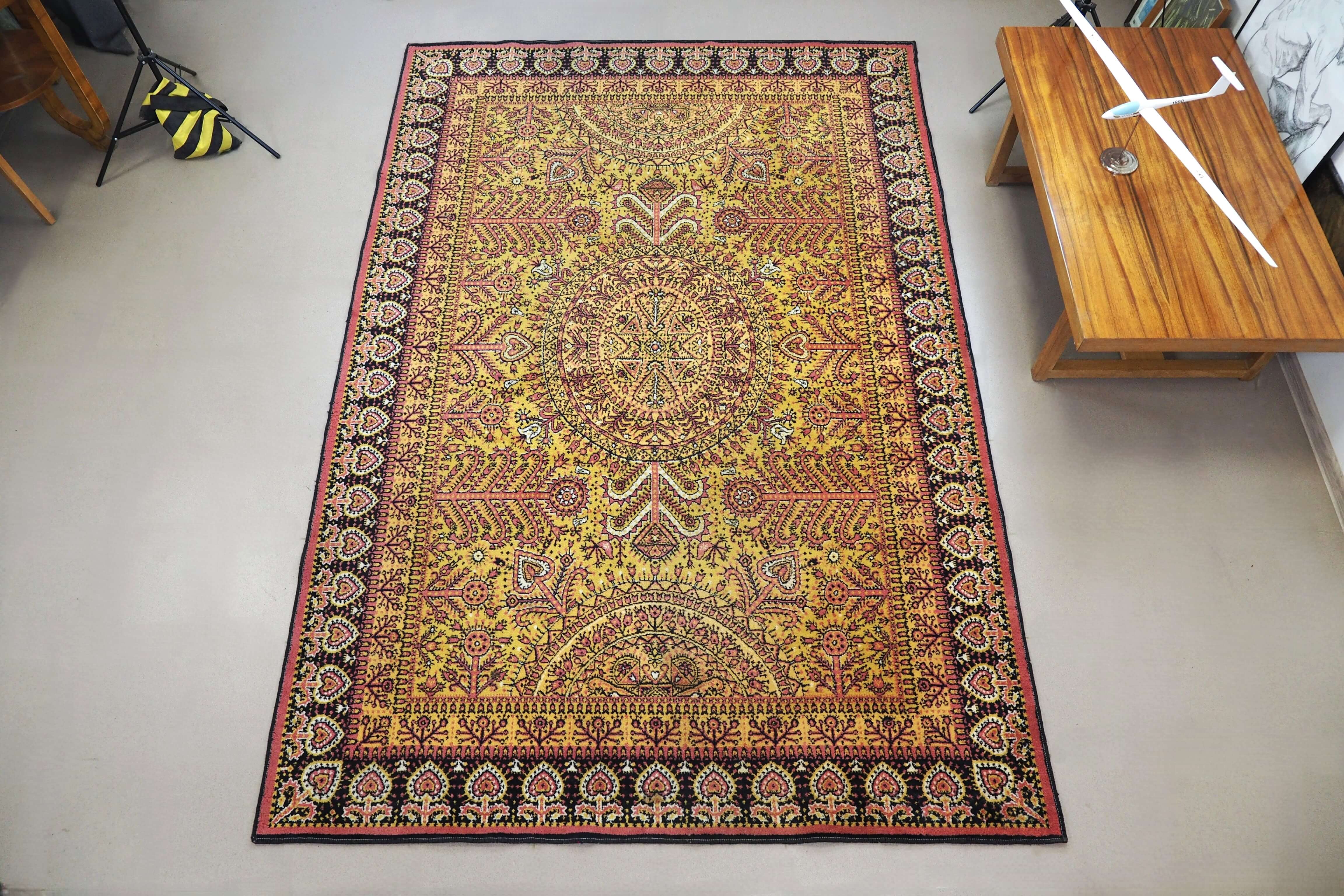 Retas vintažinis vilnonis kilimas iš „Lentvario kilimų“ fabriko – autentiškas lietuviškų motyvų ir modernumo derinys. Dominuojančios spalvos - garstyčių geltona ir pastelinė vyšninė, jas rėmina juodi kontūrai ir dramblio kaulo spalvos akcentai. Centrinis saulės formos medalionas, augaliniai motyvai ir aibė širdelių kuria išskirtinę estetiką – tarp rytietiškos prabangos ir lietuviško tautinio modernizmo. Toks kilimas ne tik šildo, bet ir kuria charakterį – loftui, studijai ar moderniam butui.