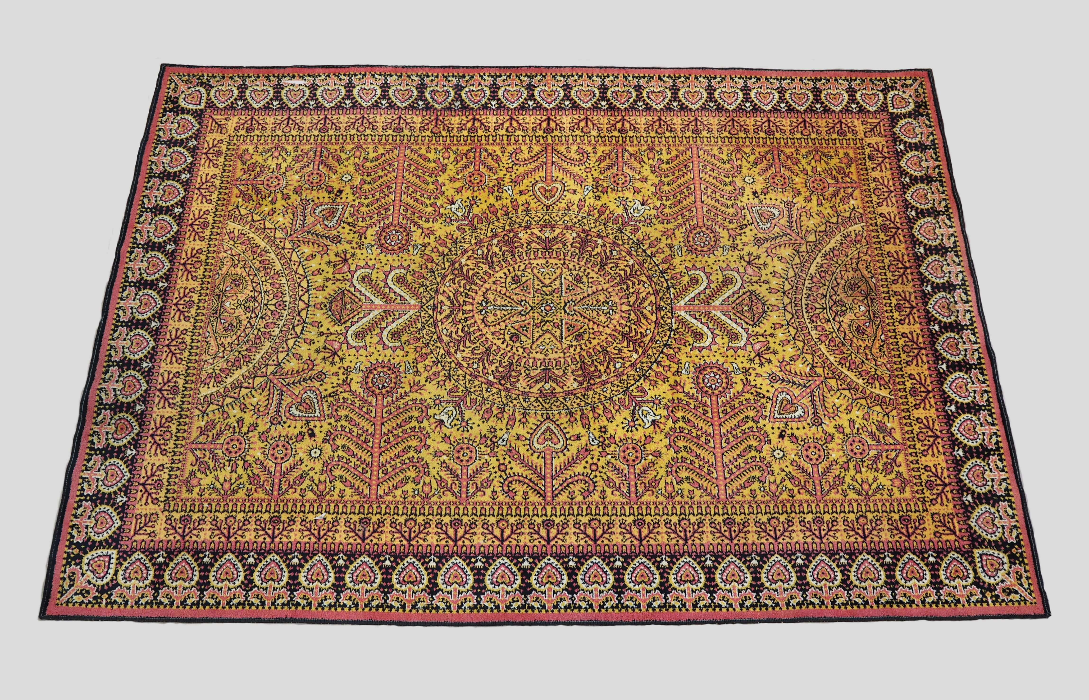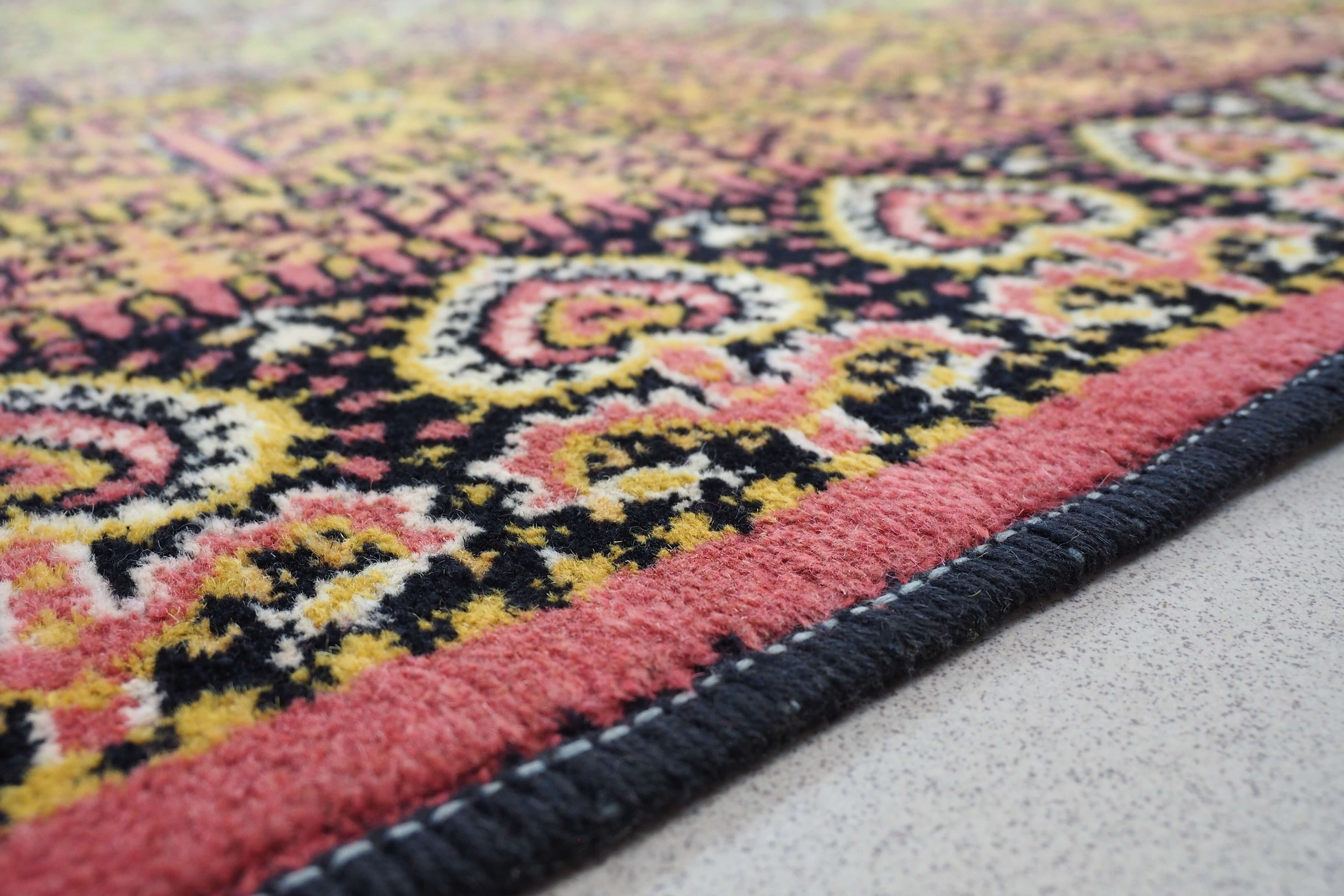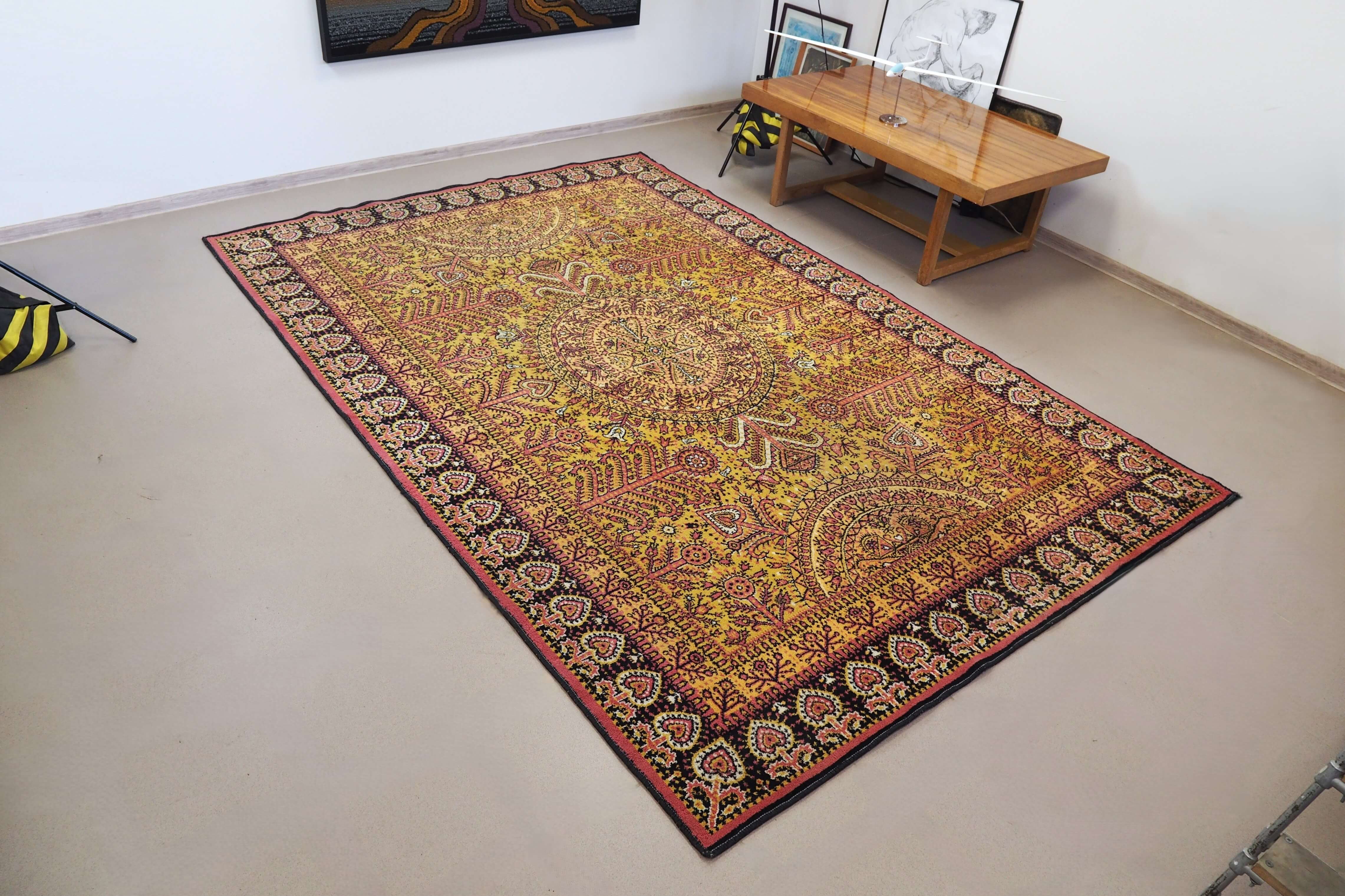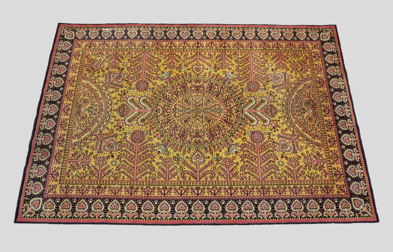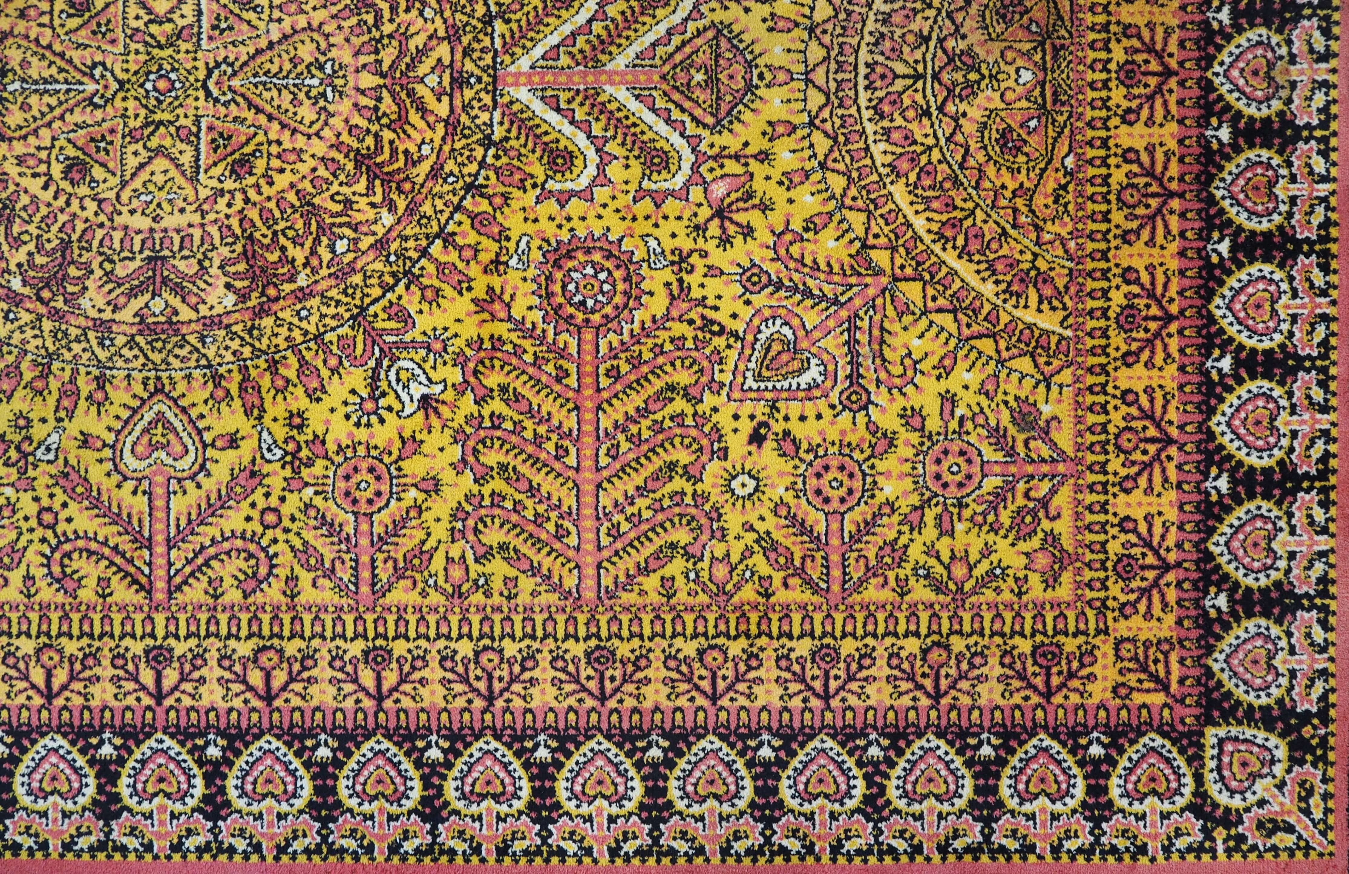 Retas vintažinis vilnonis kilimas iš „Lentvario kilimų“ fabriko – autentiškas lietuviškų motyvų ir modernumo derinys. Dominuojančios spalvos - garstyčių geltona ir pastelinė vyšninė, jas rėmina juodi kontūrai ir dramblio kaulo spalvos akcentai. Centrinis saulės formos medalionas, augaliniai motyvai ir aibė širdelių kuria išskirtinę estetiką – tarp rytietiškos prabangos ir lietuviško tautinio modernizmo. Toks kilimas ne tik šildo, bet ir kuria charakterį – loftui, studijai ar moderniam butui.