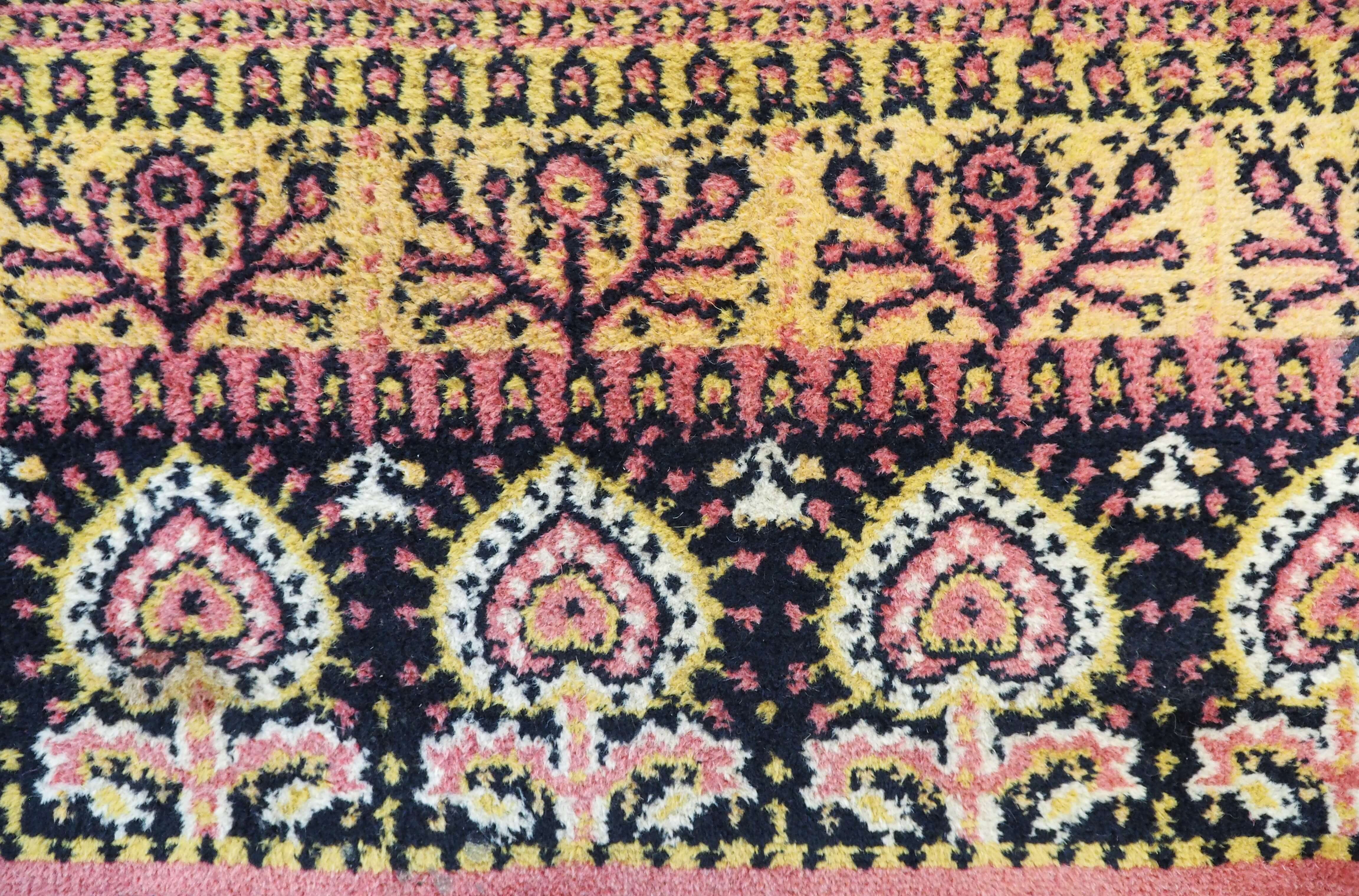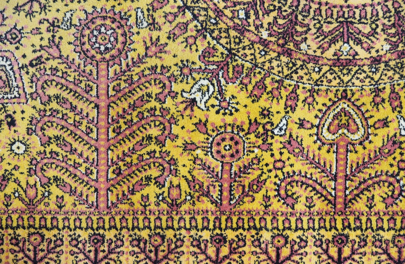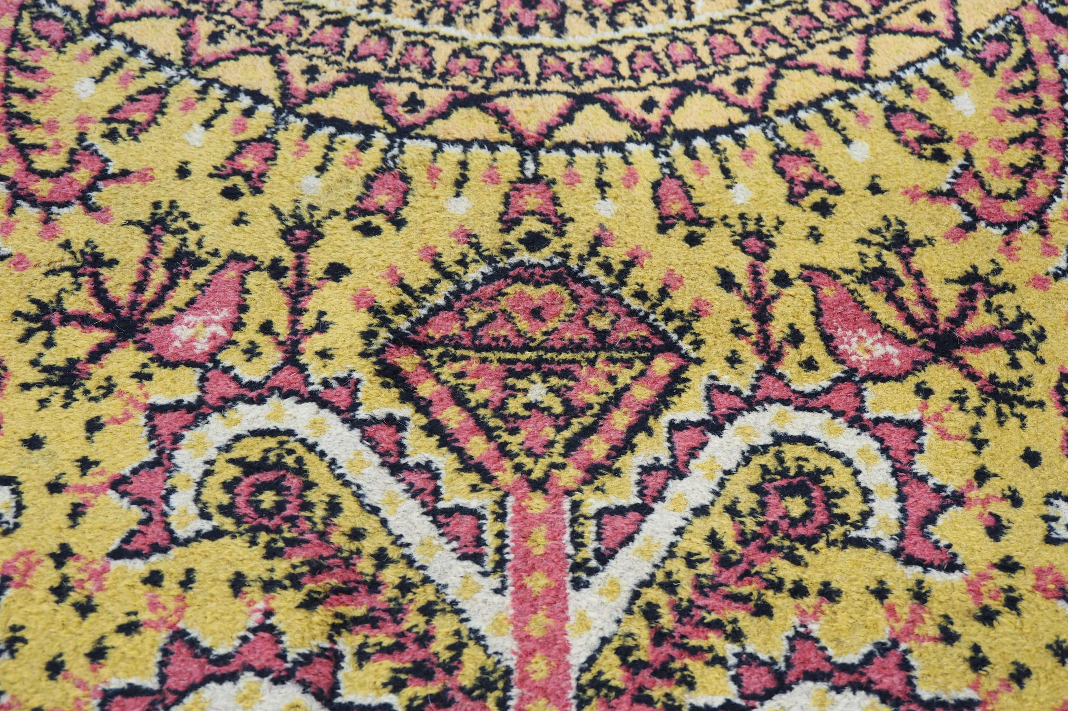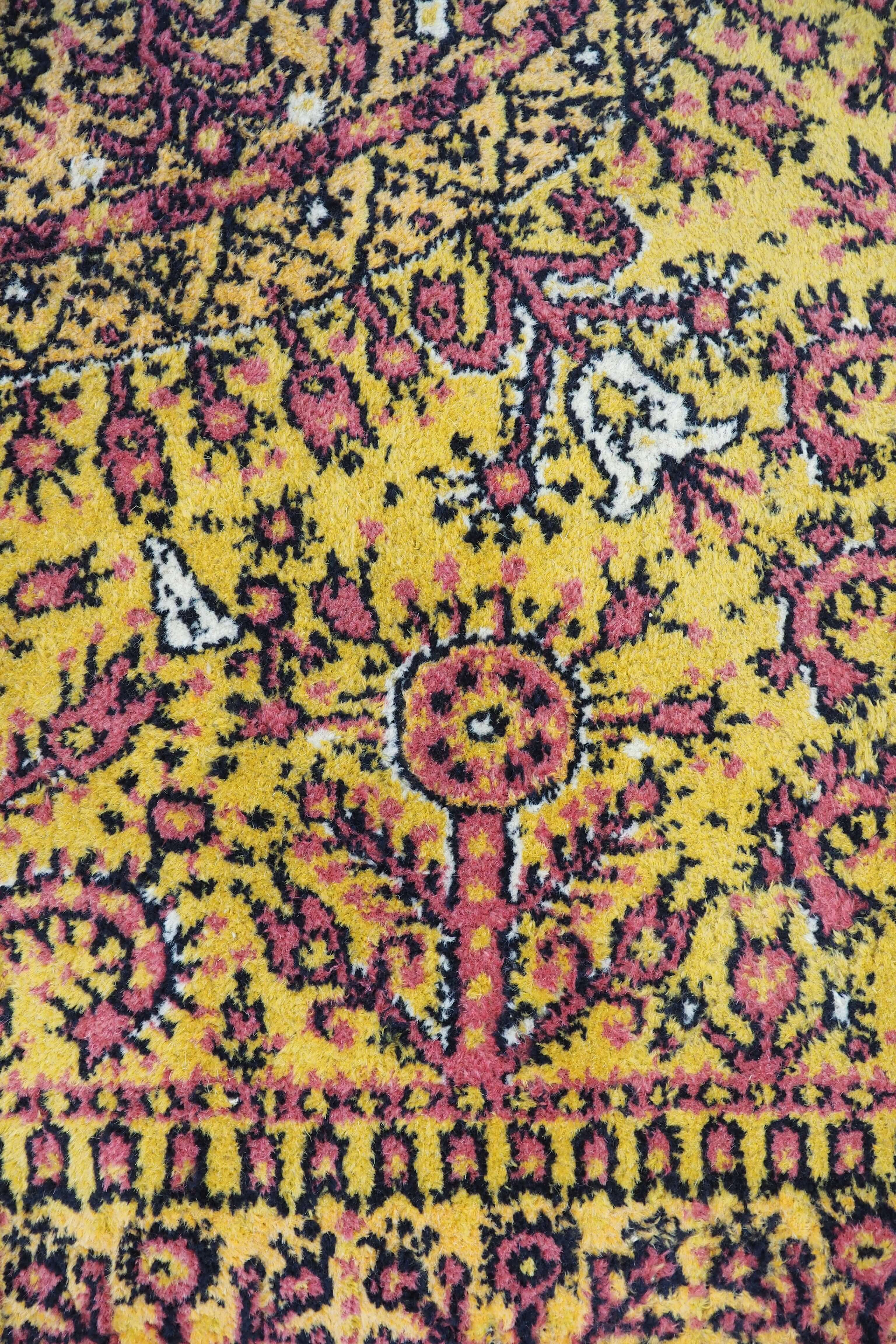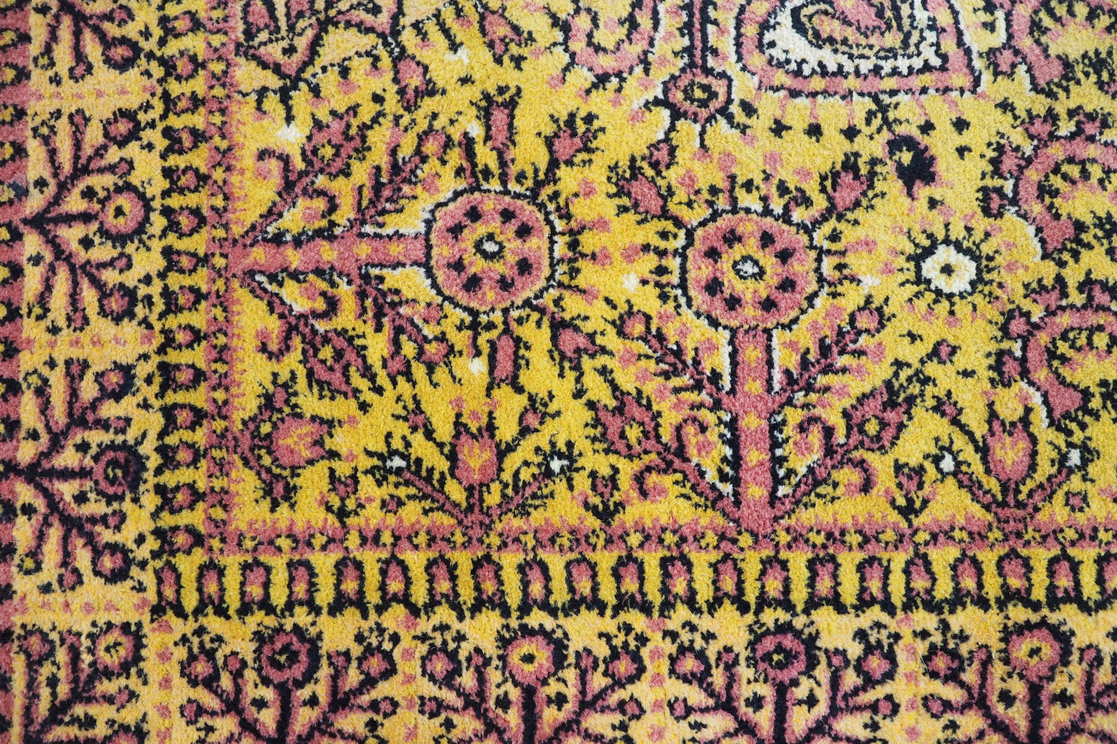Retas vintažinis vilnonis kilimas iš „Lentvario kilimų“ fabriko – autentiškas lietuviškų motyvų ir modernumo derinys. Dominuojančios spalvos - garstyčių geltona ir pastelinė vyšninė, jas rėmina juodi kontūrai ir dramblio kaulo spalvos akcentai. Centrinis saulės formos medalionas, augaliniai motyvai ir aibė širdelių kuria išskirtinę estetiką – tarp rytietiškos prabangos ir lietuviško tautinio modernizmo. Toks kilimas ne tik šildo, bet ir kuria charakterį – loftui, studijai ar moderniam butui.