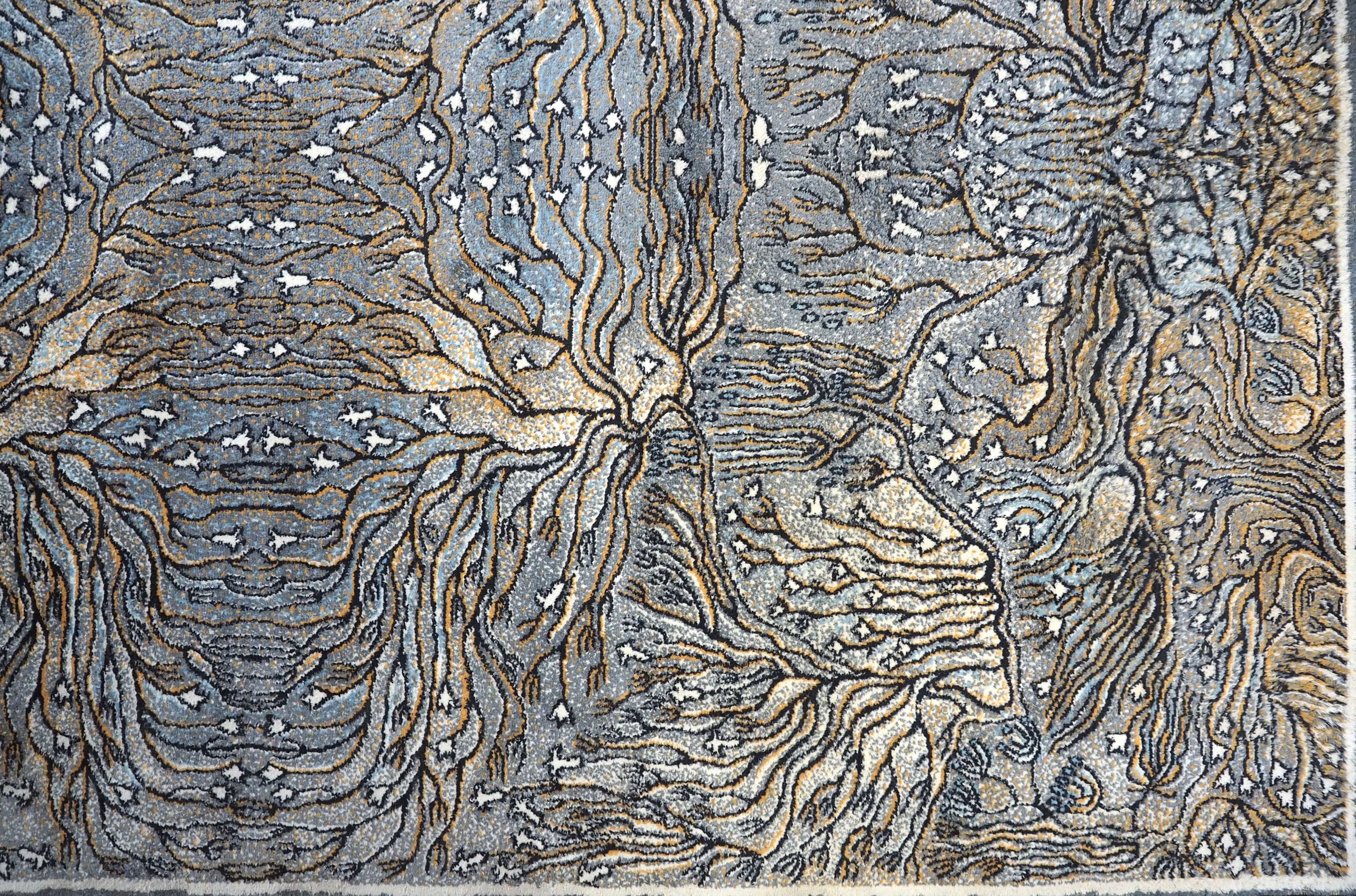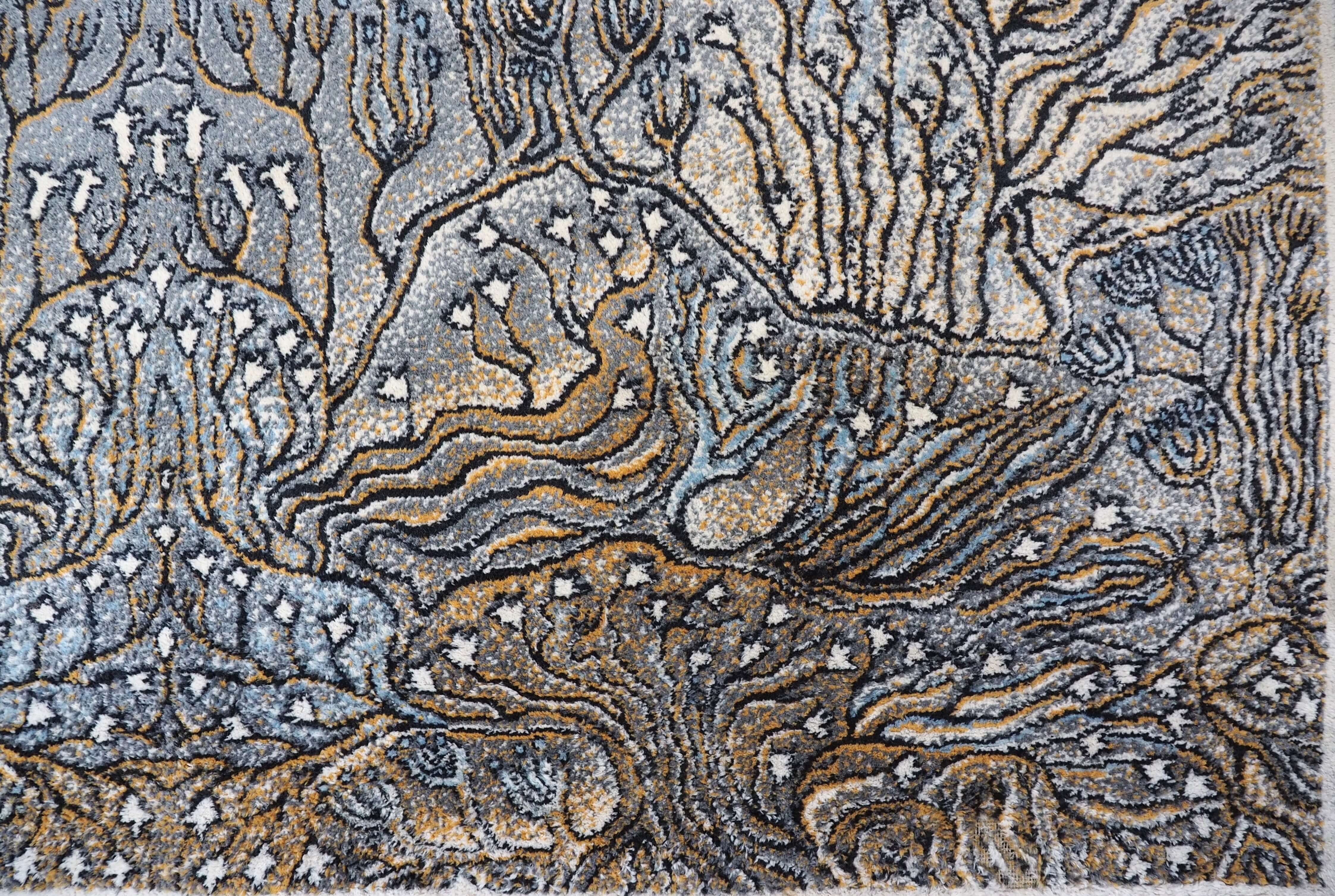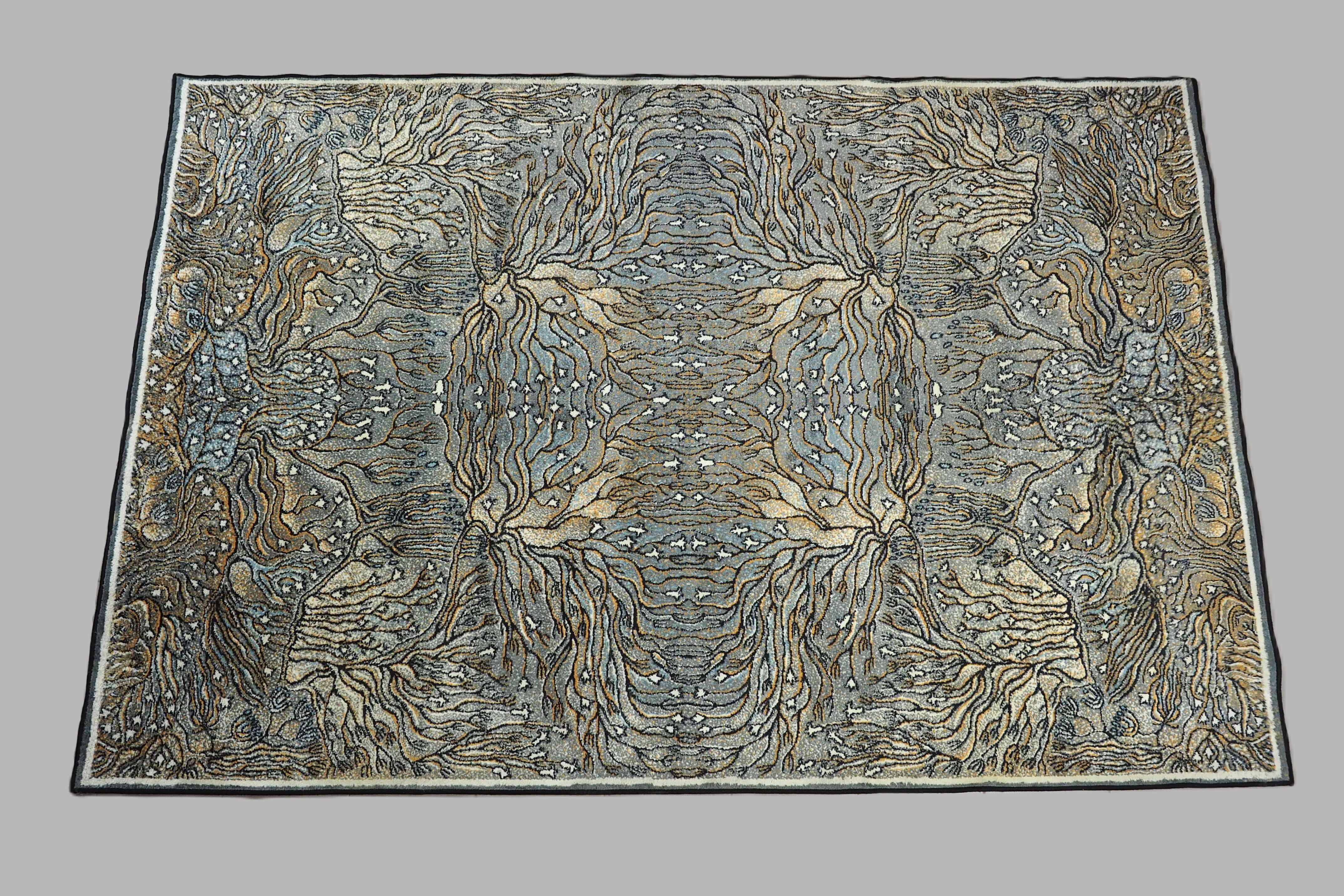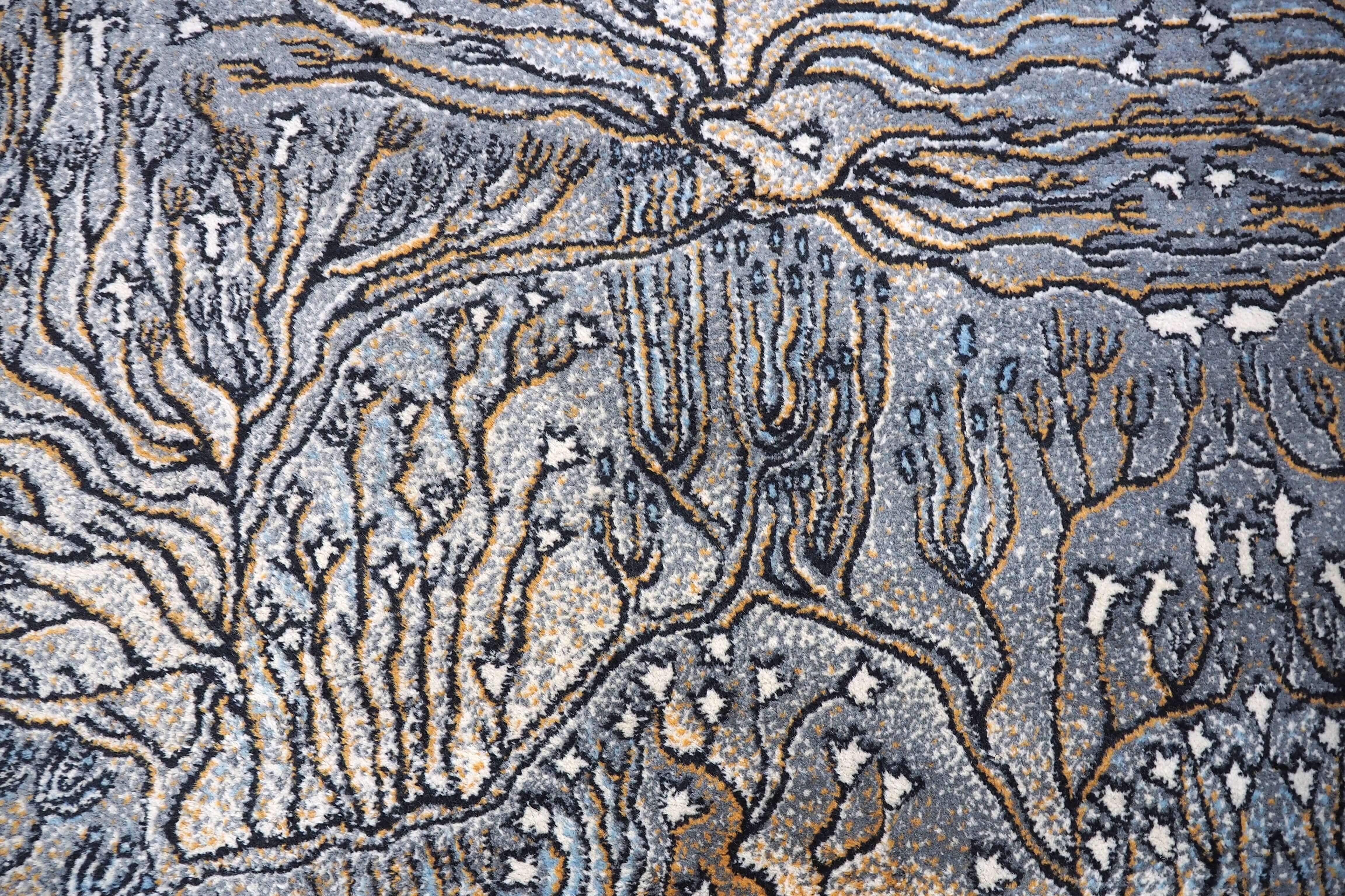 Kilimu galima gėrėtis kaip grafikos paveikslu: meniškas raibuliuojantis raštas, vaizduojantis povandeninius augalus ir koralus, kuriuos rėmina baltas apvadas ir juodas apsiuvimas.