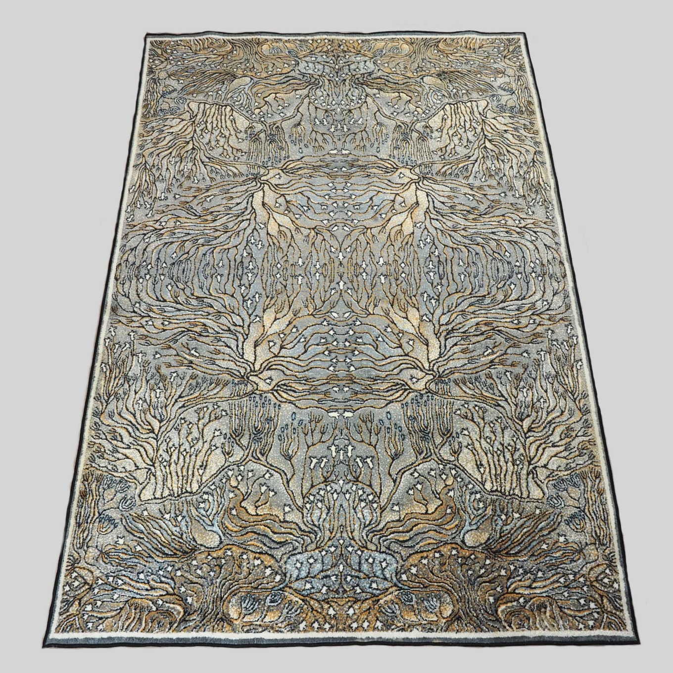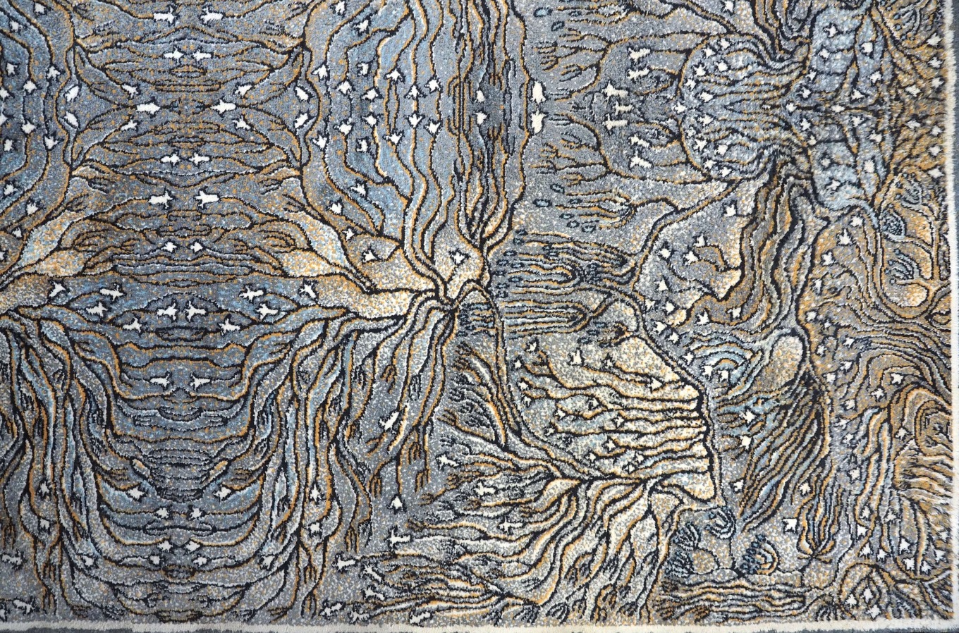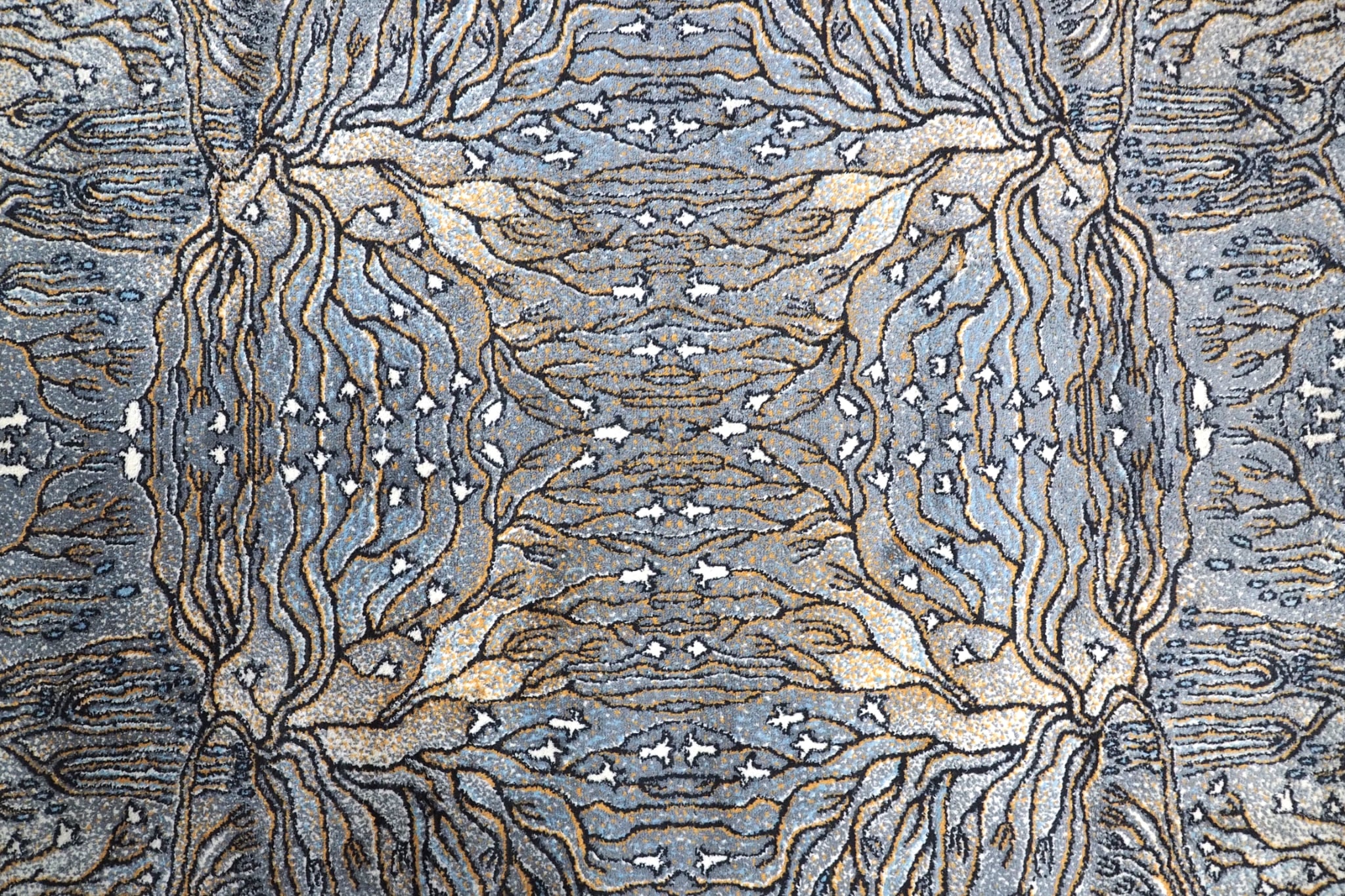 Kilimu galima gėrėtis kaip grafikos paveikslu: meniškas raibuliuojantis raštas, vaizduojantis povandeninius augalus ir koralus, kuriuos rėmina baltas apvadas ir juodas apsiuvimas.