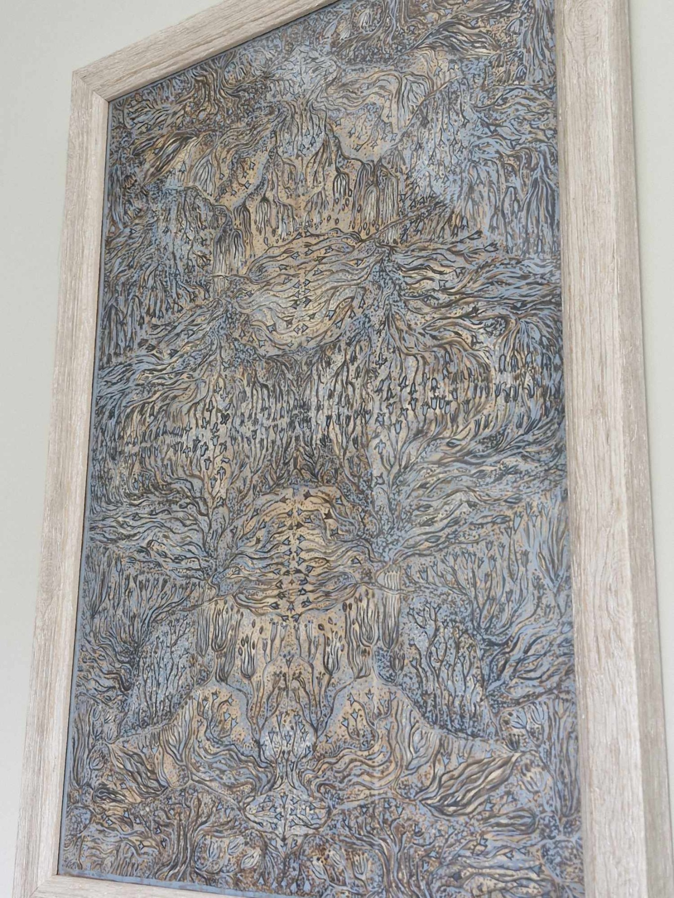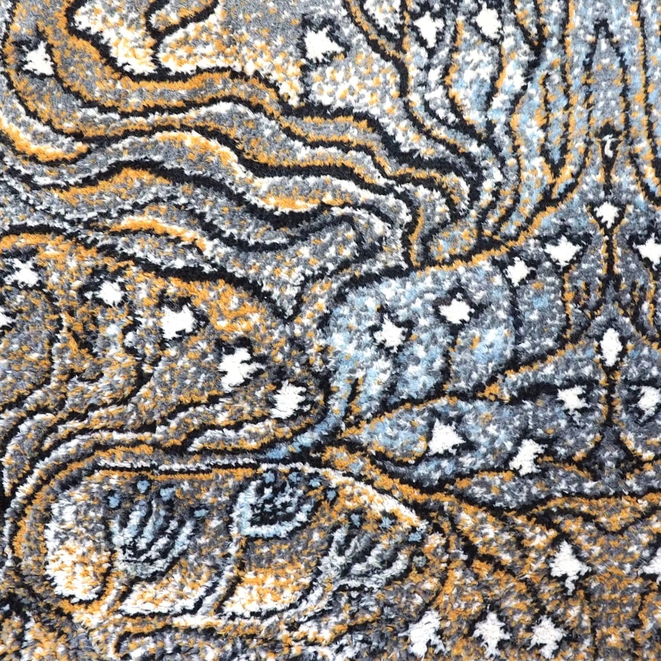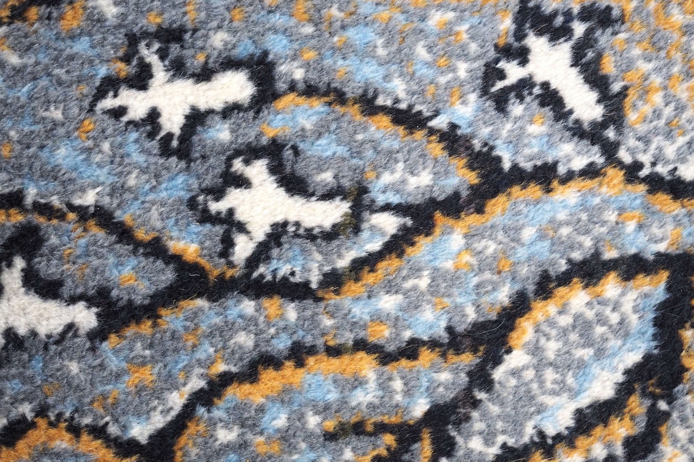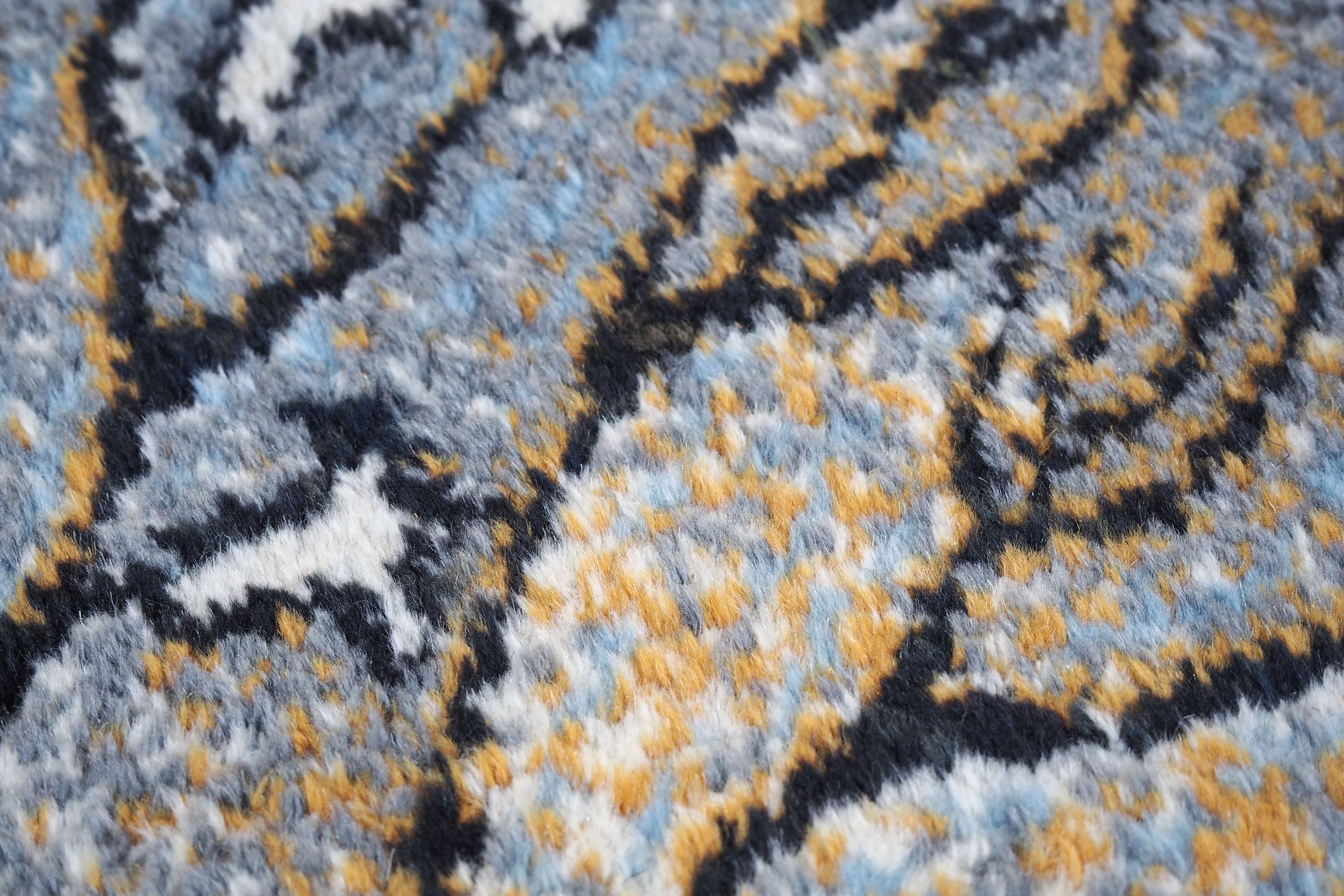 Kilimu galima gėrėtis kaip grafikos paveikslu: meniškas raibuliuojantis raštas, vaizduojantis povandeninius augalus ir koralus, kuriuos rėmina baltas apvadas ir juodas apsiuvimas.