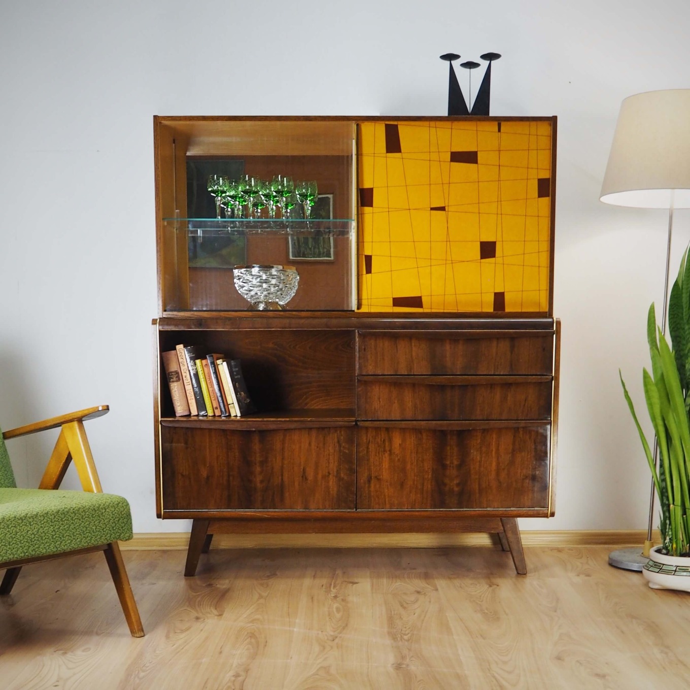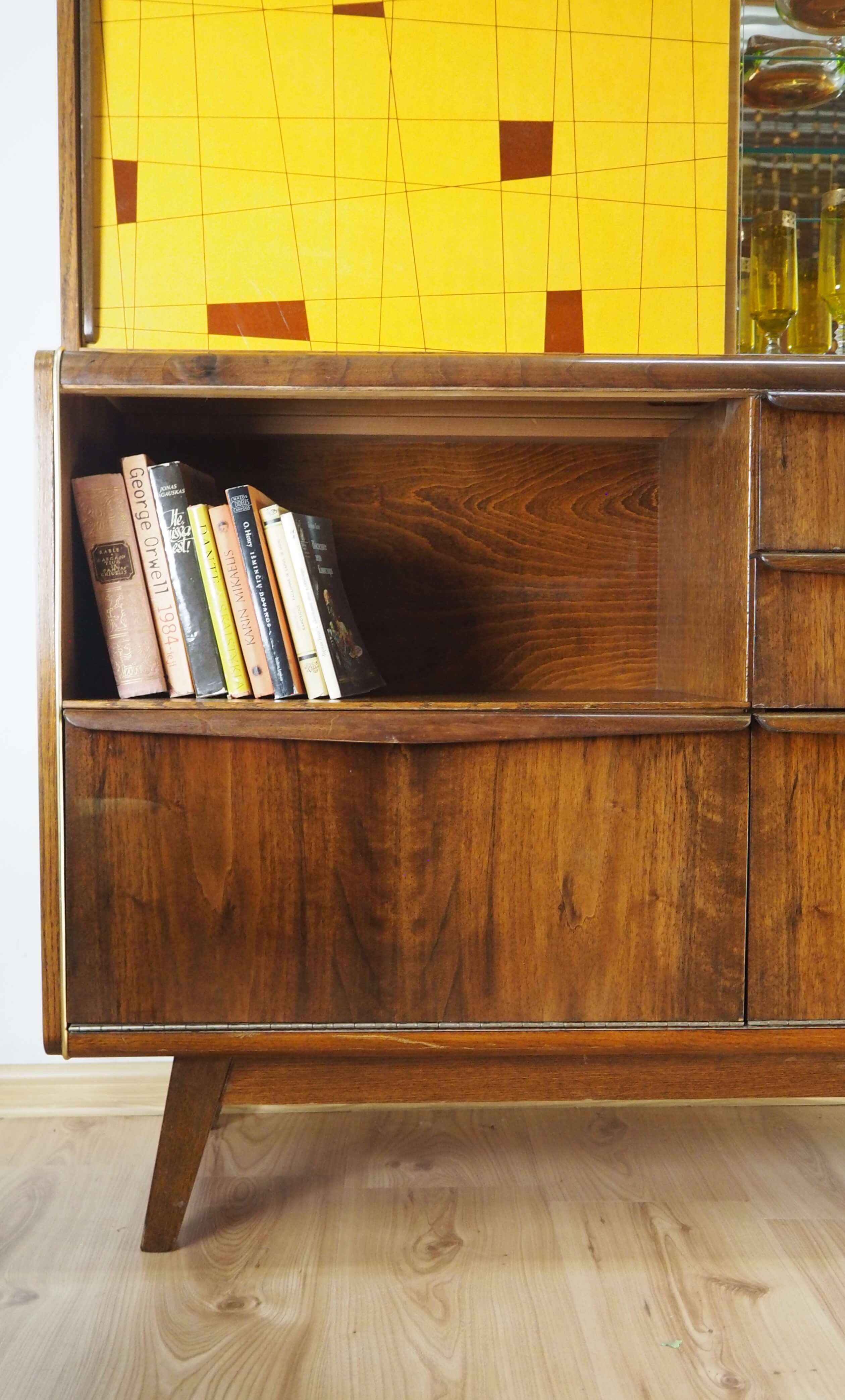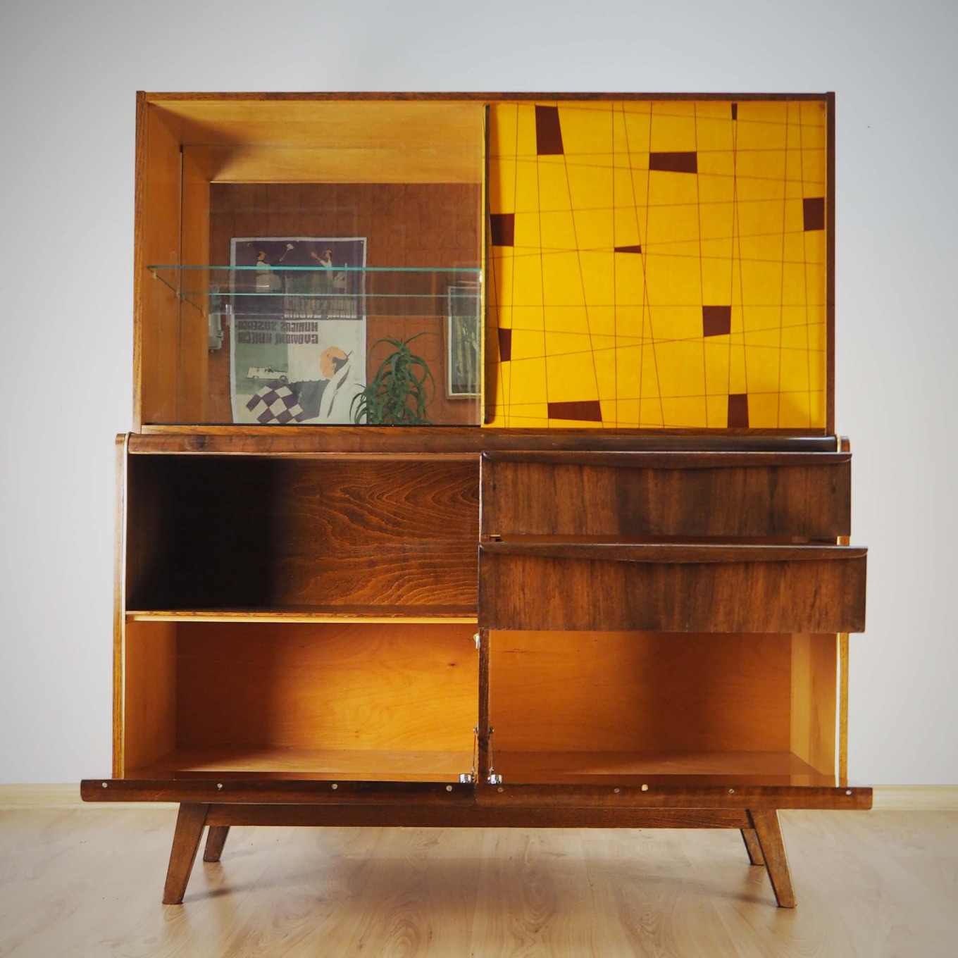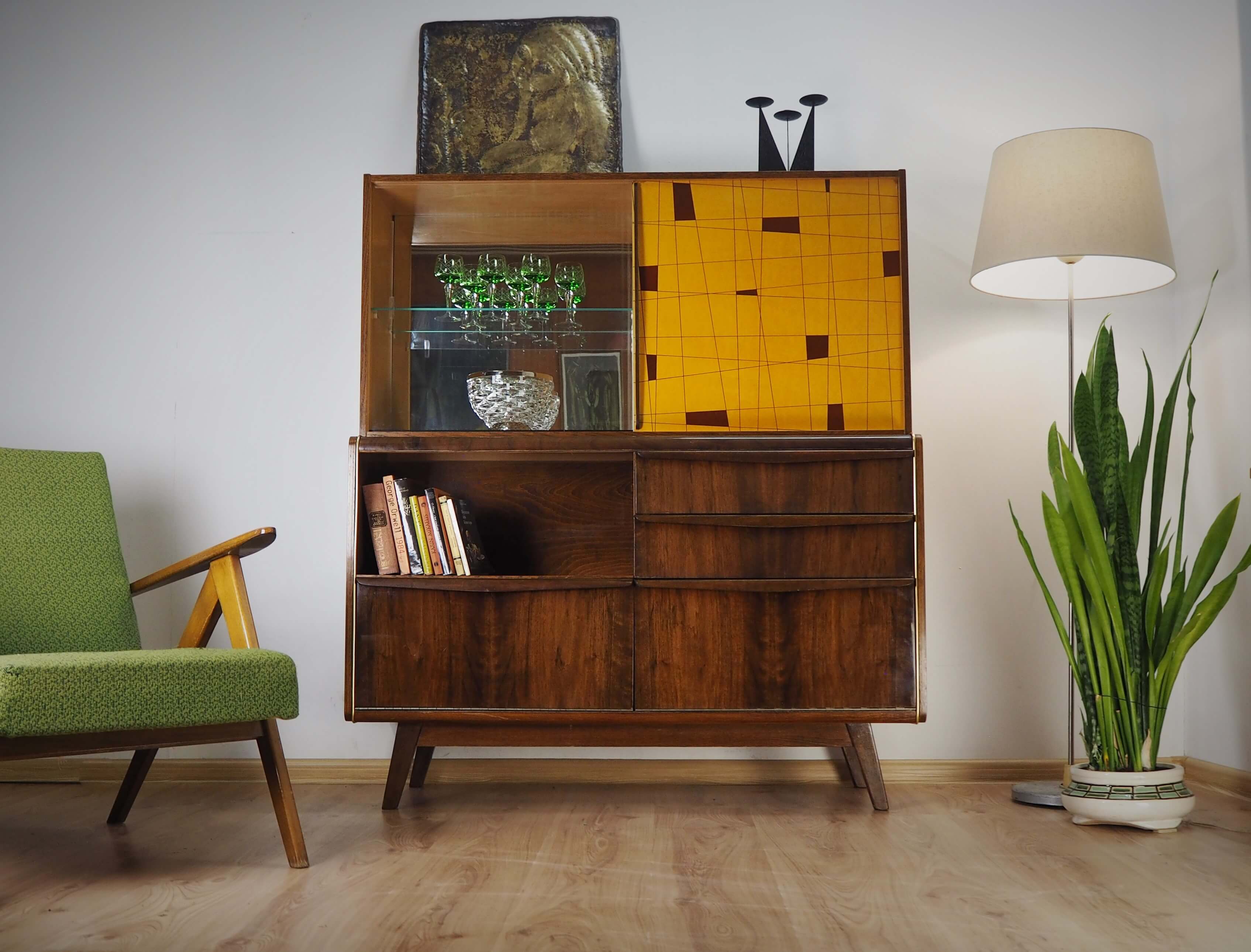 Legendinė "Jitona" retro spintelė su baru. Dėl savo išskirtinių bruožų - lenktų, šiek tiek vabališkų formų, taip pat lengvai atpažįstamų zigzagais ar netvarkingomis stygomis margintų baro durelių šis baldelis niekada neliks nepastebėtas. Slankiojančios baro durelės dažniausiai būna juodos spalvos, o ši spintelė - su geltonomis durelėmis. Jos, kaip ir įspūdingas riešutmedžio lukštas, šiam baldui suteikia dar daugiau unikalumo.