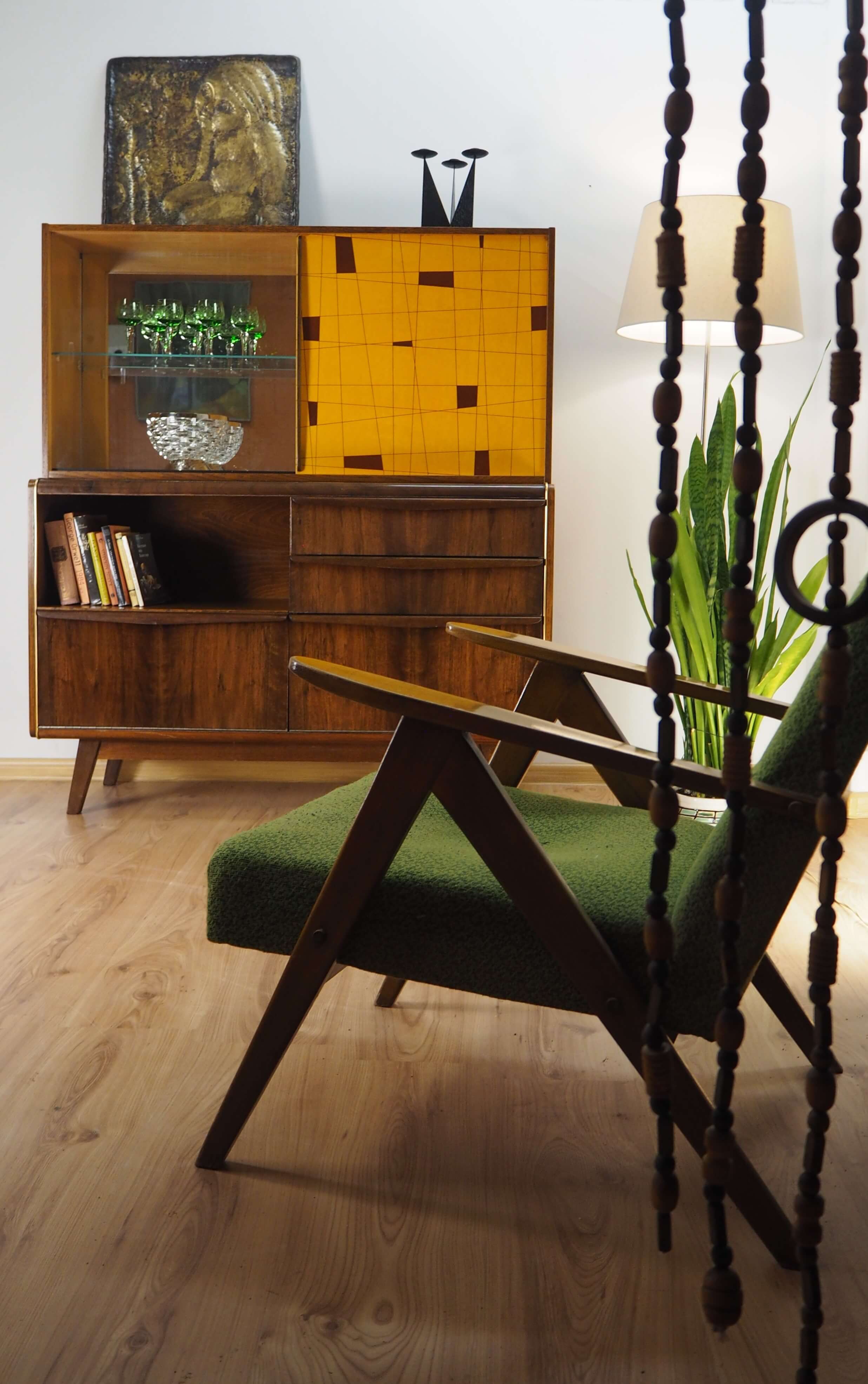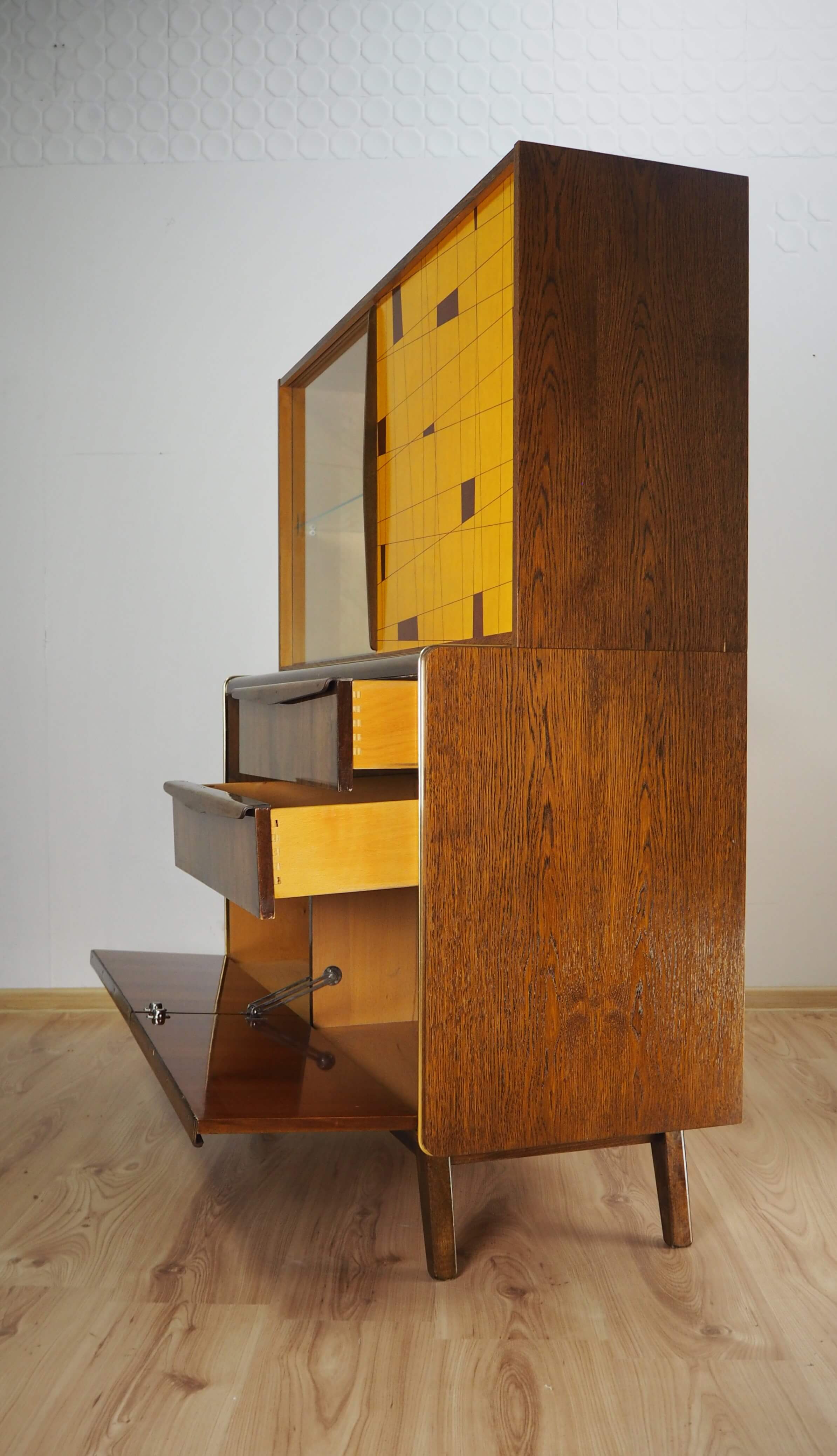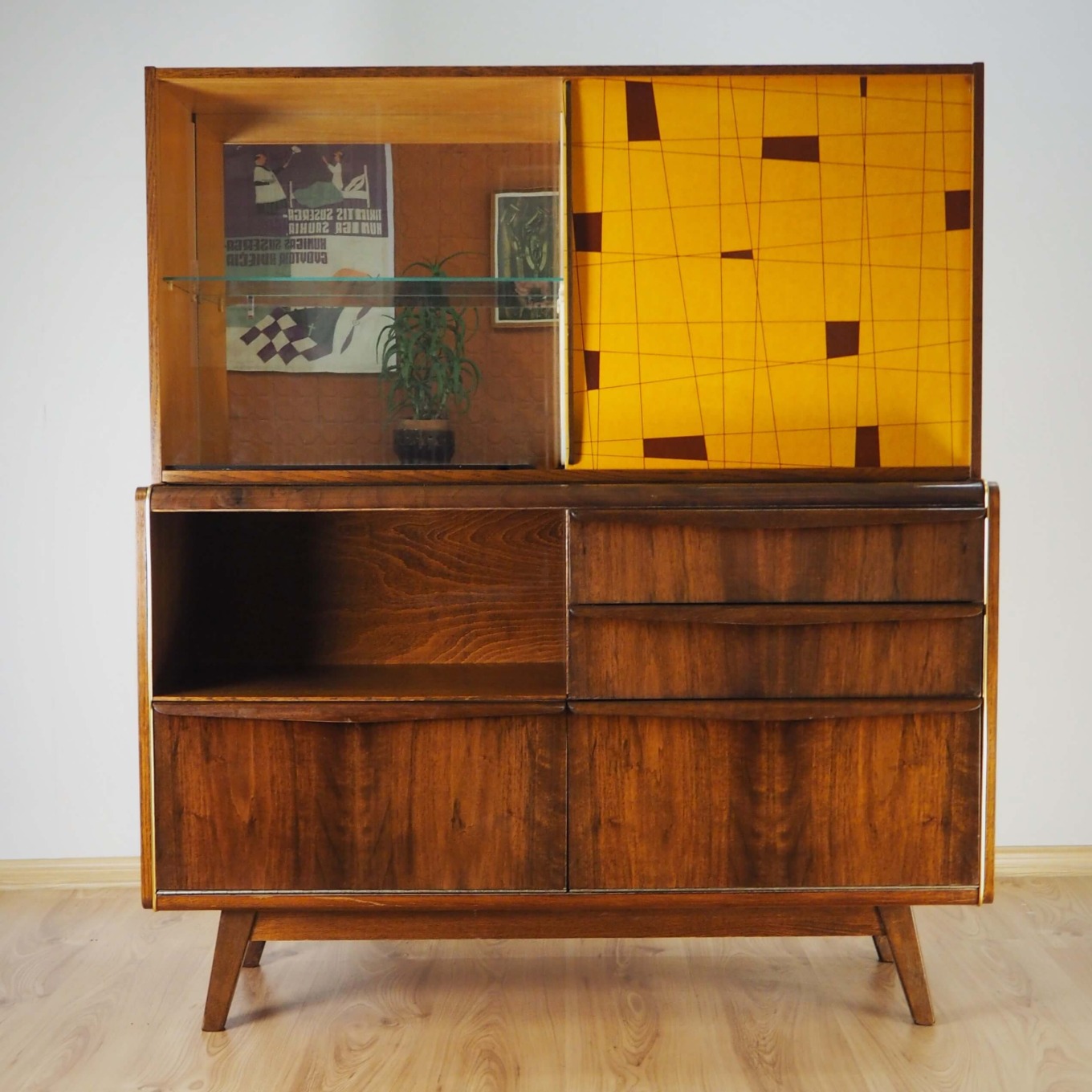 Legendinė "Jitona" retro spintelė su baru. Dėl savo išskirtinių bruožų - lenktų, šiek tiek vabališkų formų, taip pat lengvai atpažįstamų zigzagais ar netvarkingomis stygomis margintų baro durelių šis baldelis niekada neliks nepastebėtas. Slankiojančios baro durelės dažniausiai būna juodos spalvos, o ši spintelė - su geltonomis durelėmis. Jos, kaip ir įspūdingas riešutmedžio lukštas, šiam baldui suteikia dar daugiau unikalumo.