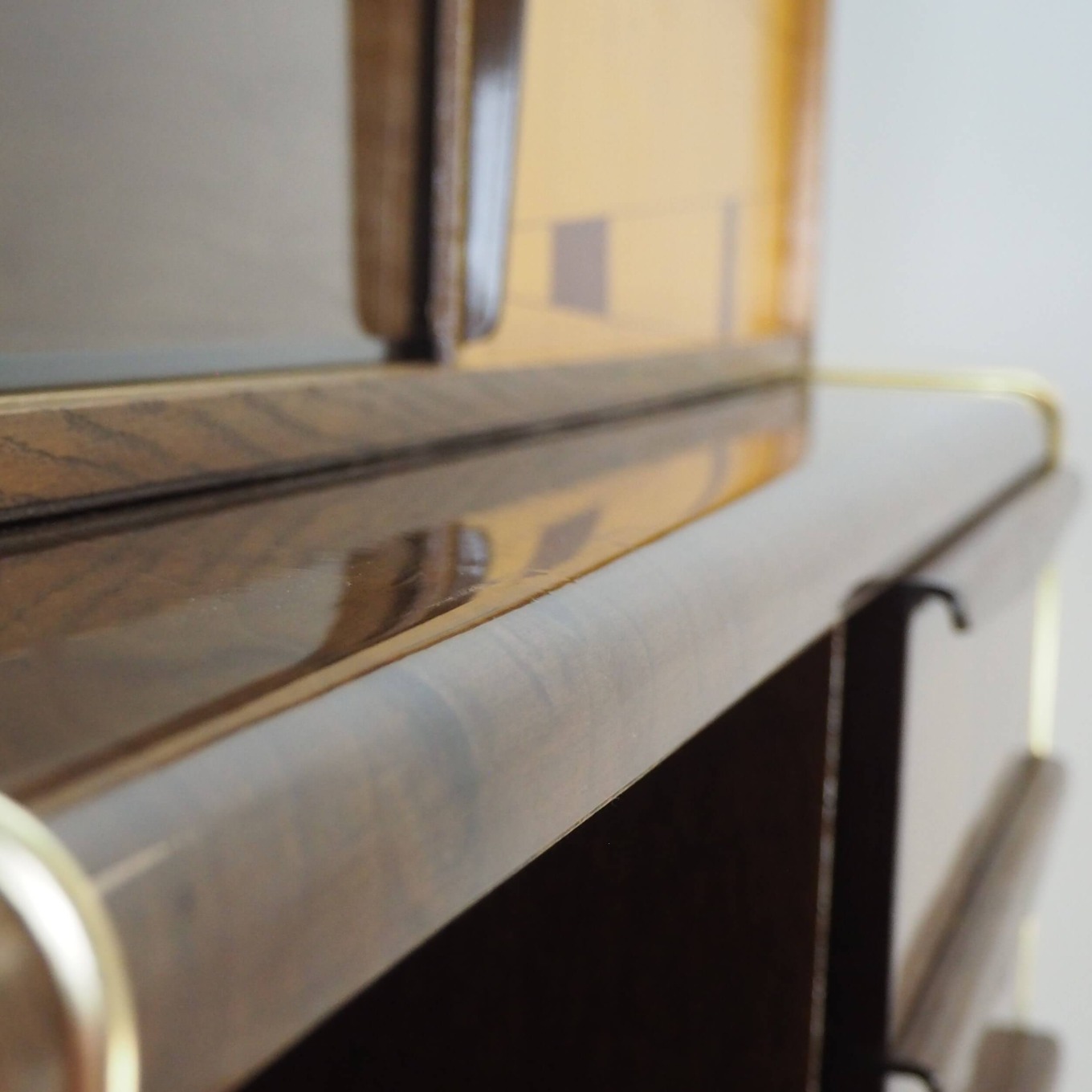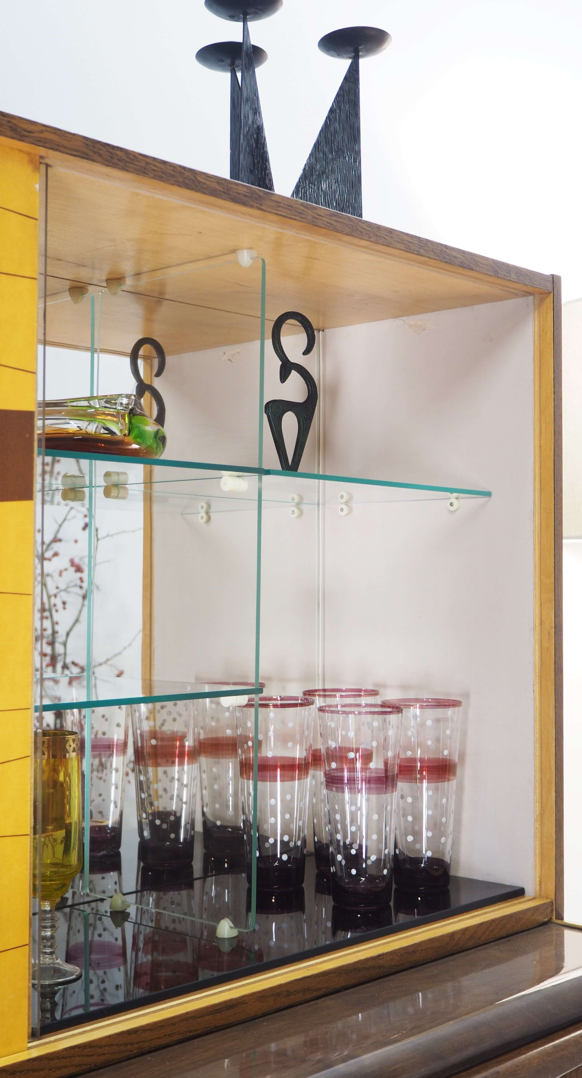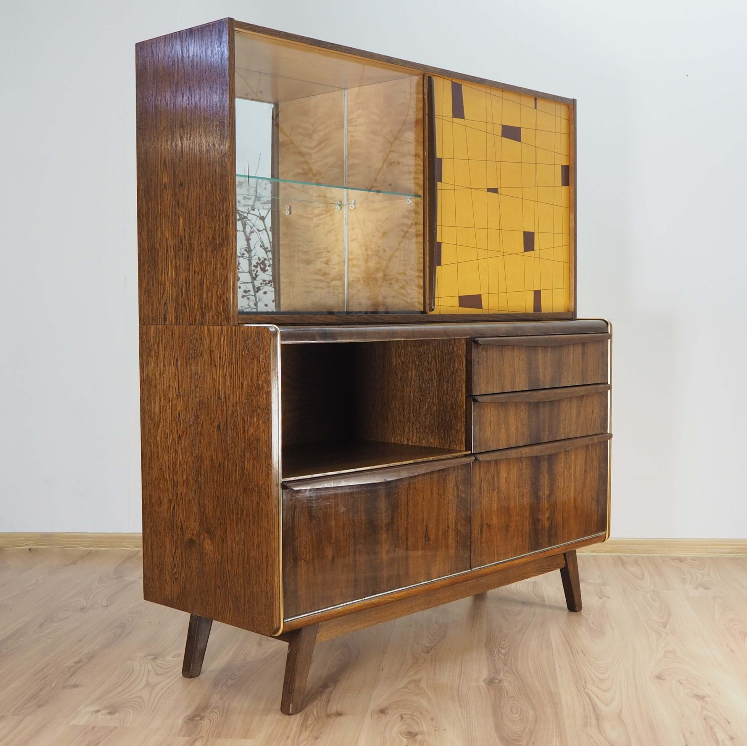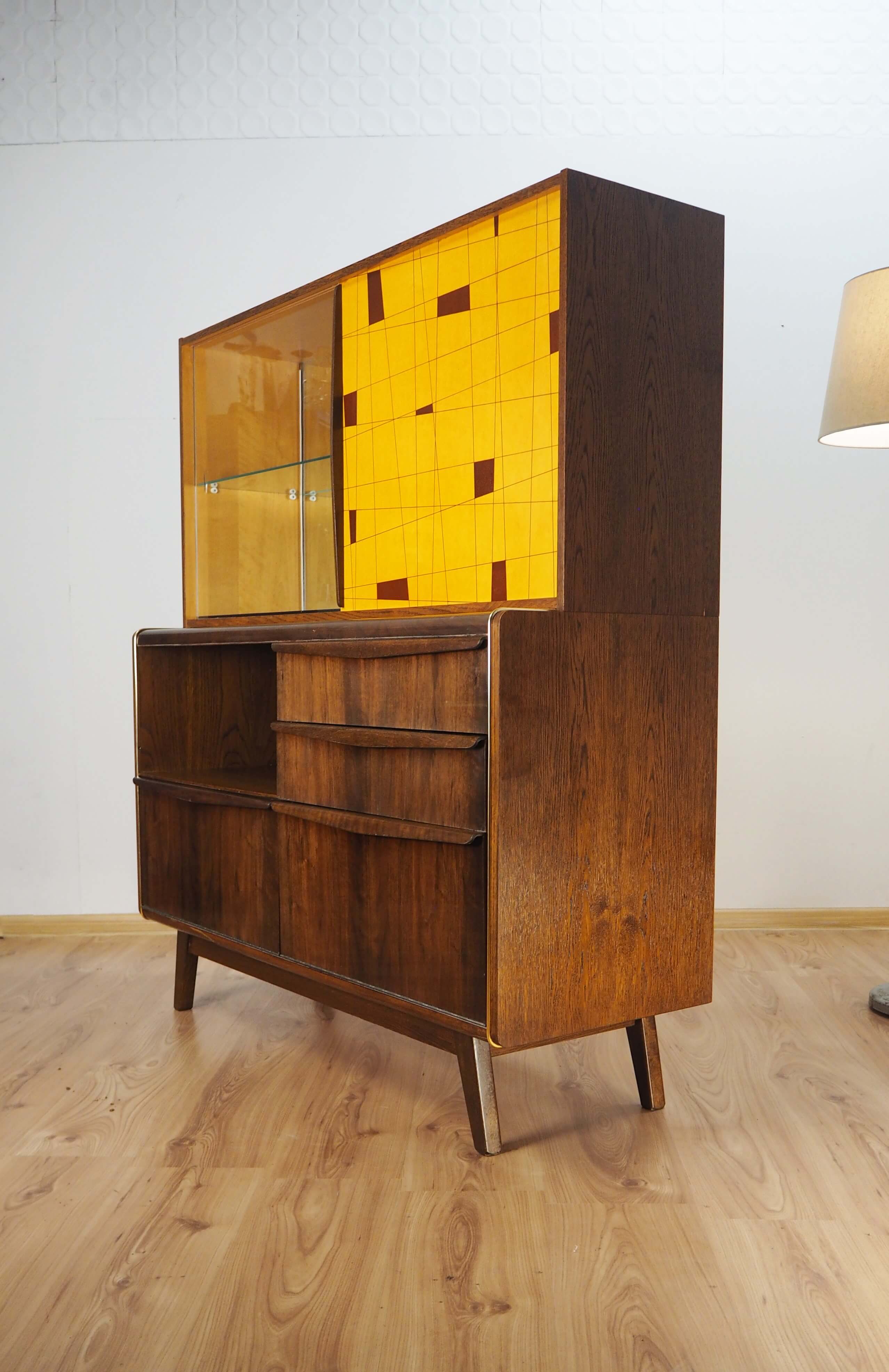 Legendinė "Jitona" retro spintelė su baru. Dėl savo išskirtinių bruožų - lenktų, šiek tiek vabališkų formų, taip pat lengvai atpažįstamų zigzagais ar netvarkingomis stygomis margintų baro durelių šis baldelis niekada neliks nepastebėtas. Slankiojančios baro durelės dažniausiai būna juodos spalvos, o ši spintelė - su geltonomis durelėmis. Jos, kaip ir įspūdingas riešutmedžio lukštas, šiam baldui suteikia dar daugiau unikalumo.