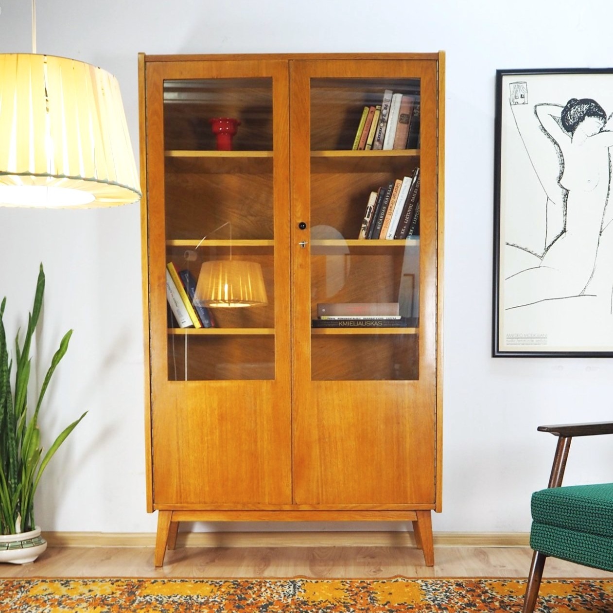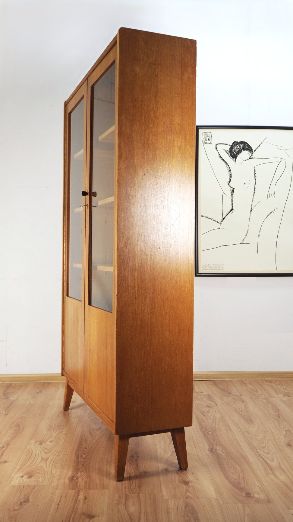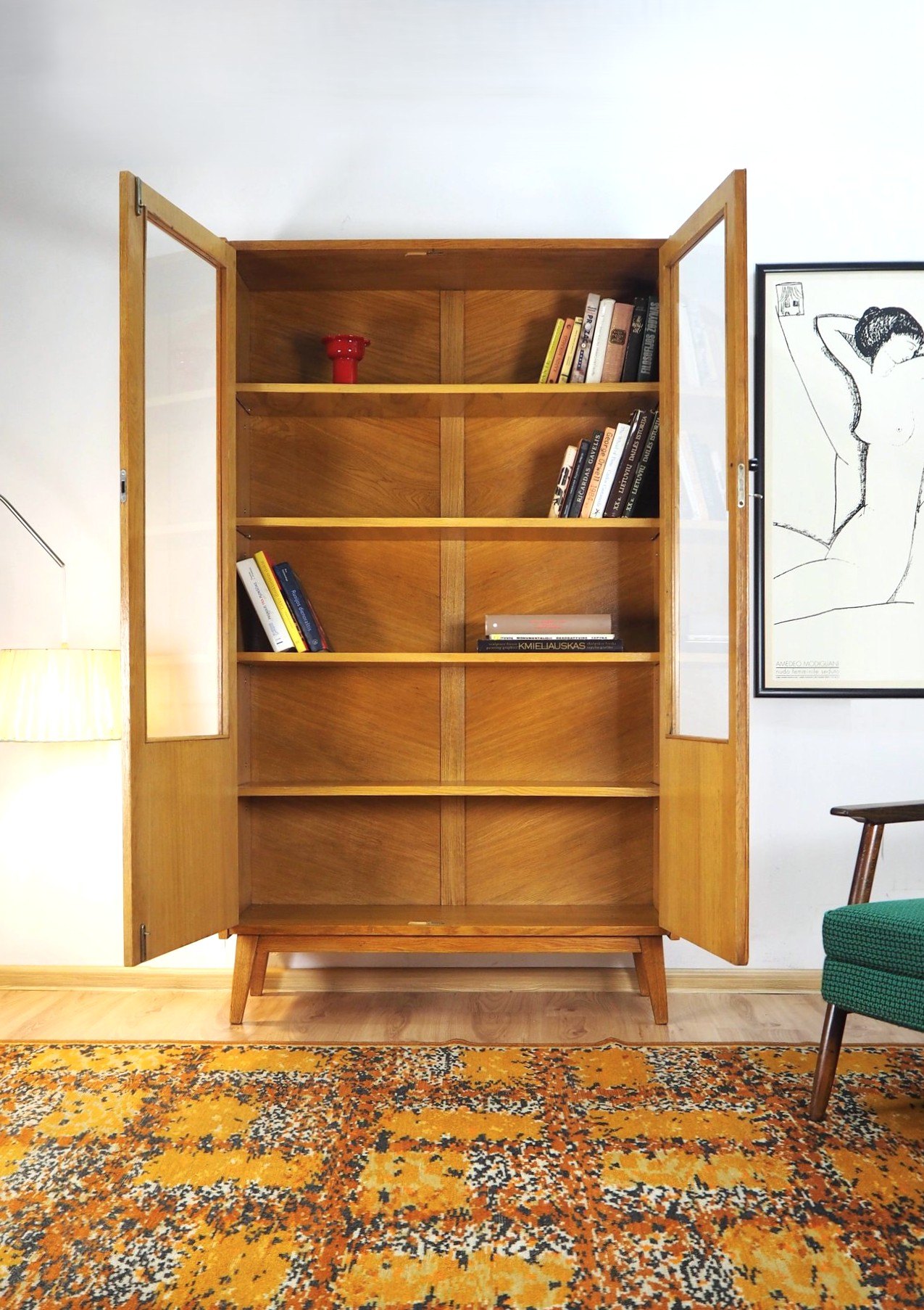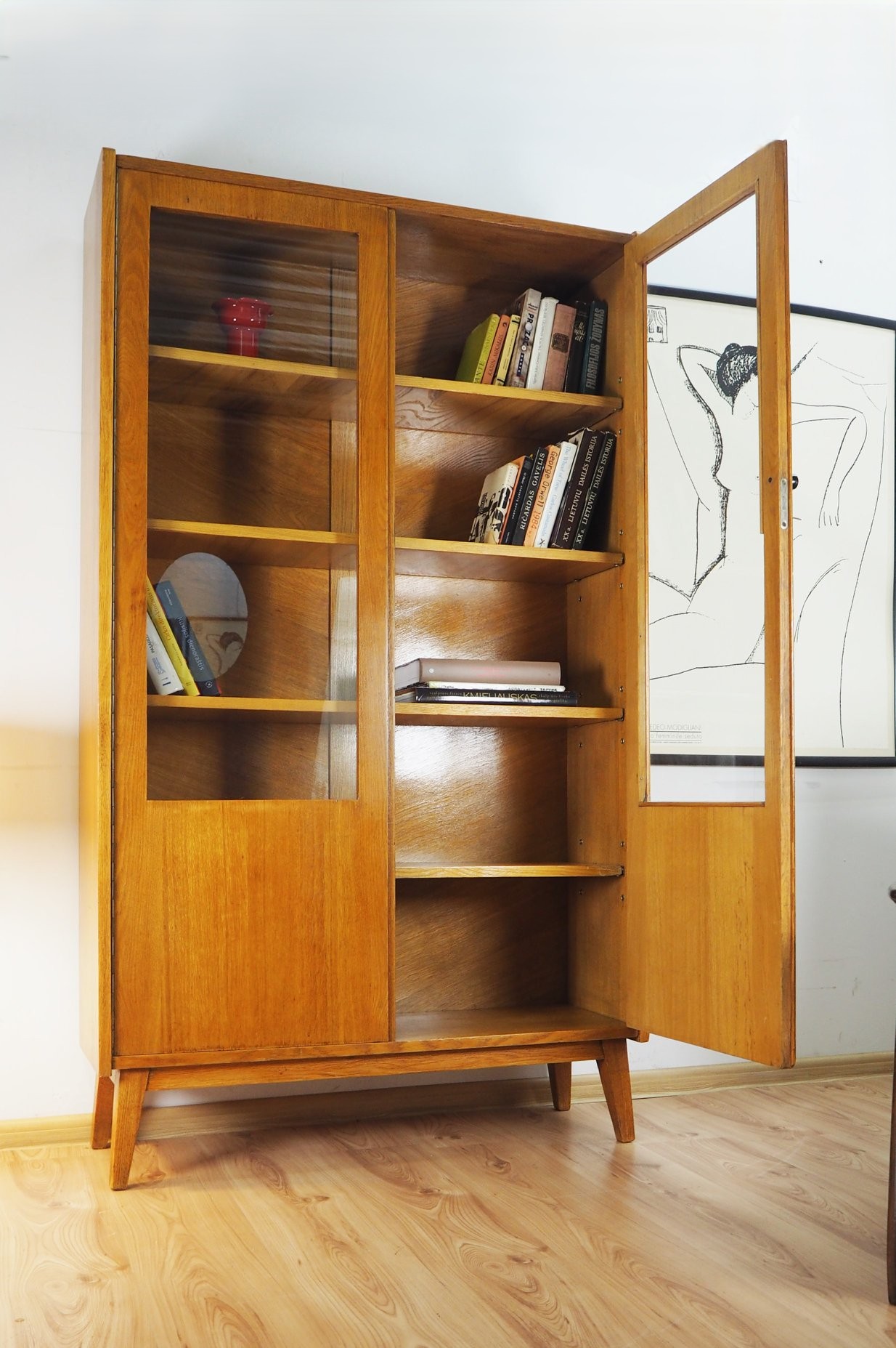 Architekto Vytauto Beigos projektuota knygų lentyna elegantiška dėl siauros formos: žiūrint iš šono spintelė atrodo beveik miniatiūrinė, "petite" - jos gylis vos 32 cm. Nepaisant to, yra tvirta ir stabili. Jokių perteklinių elementų - visos linijos tiesios ir aiškios. Šviesus lukštas. Puiki kokybiško lietuviško paveldo detalė moderniam interjerui.