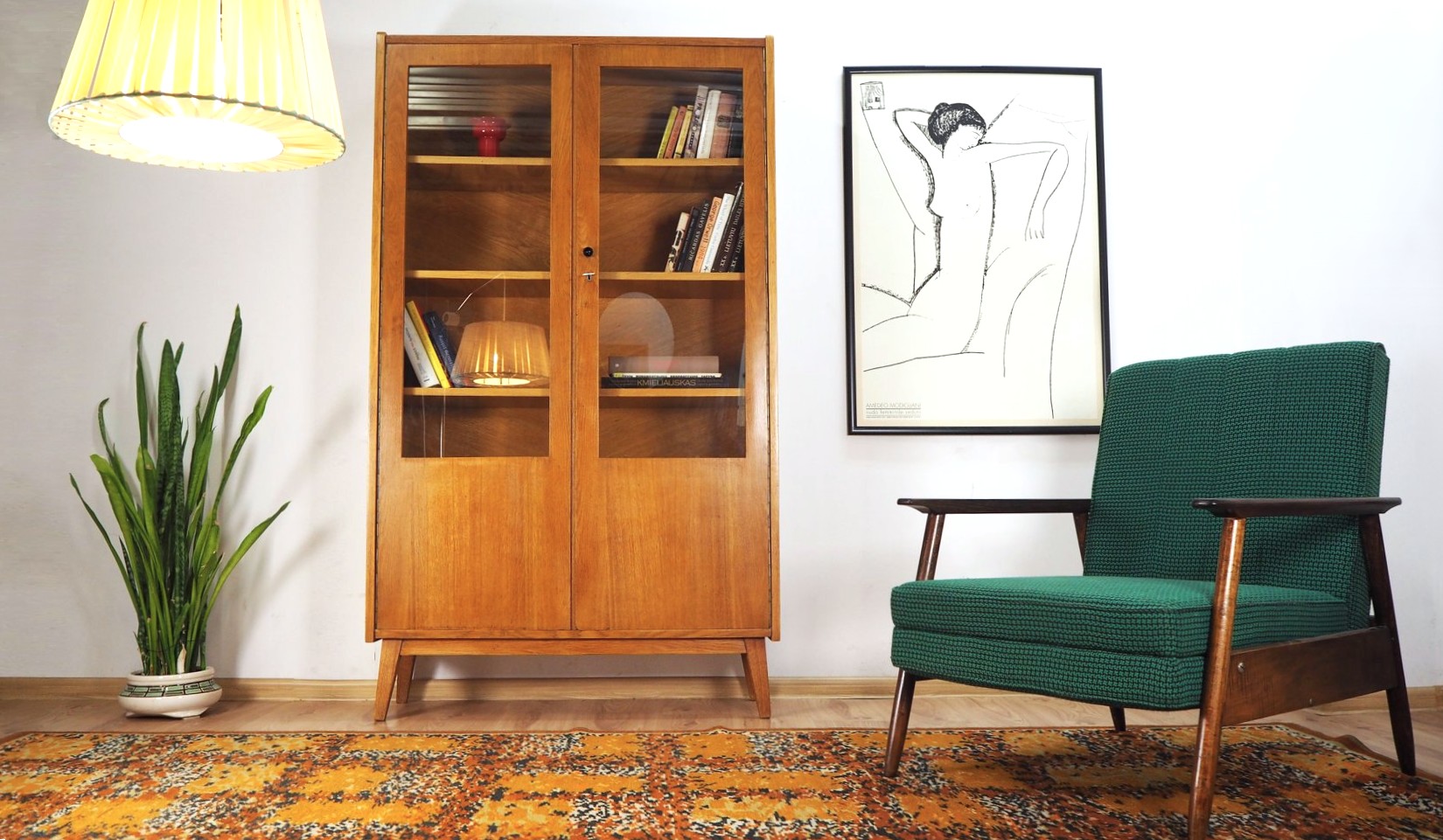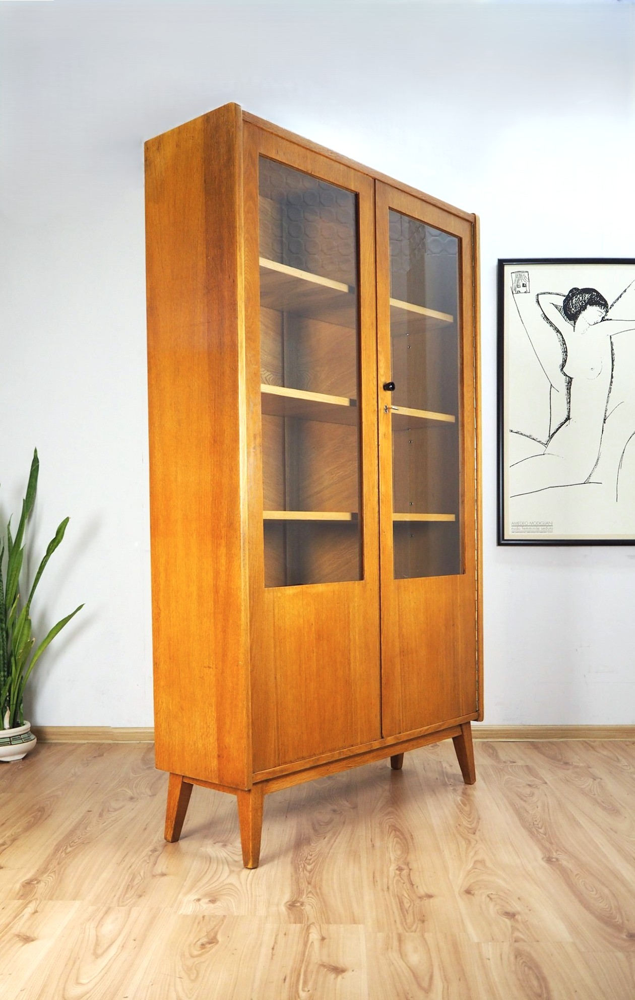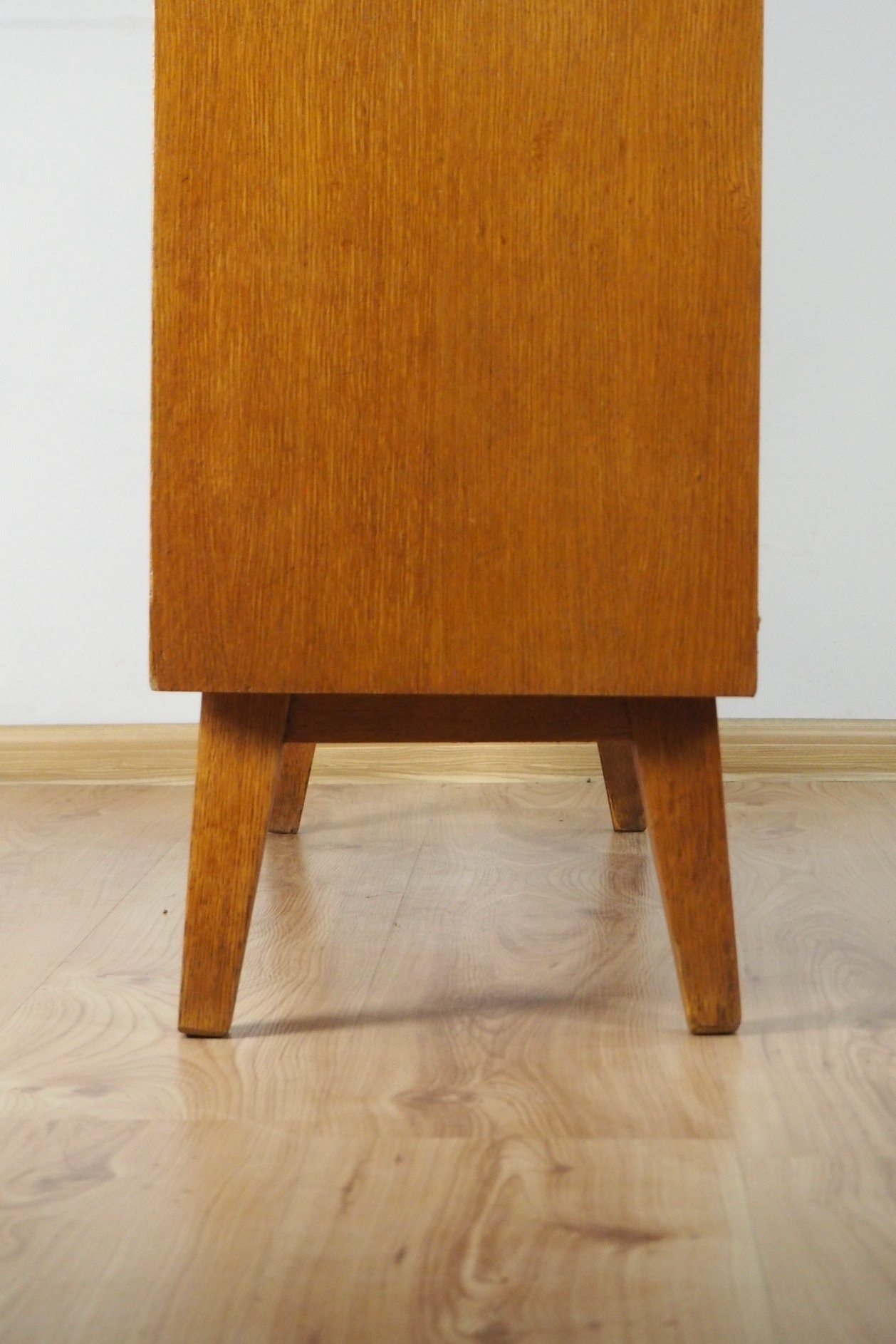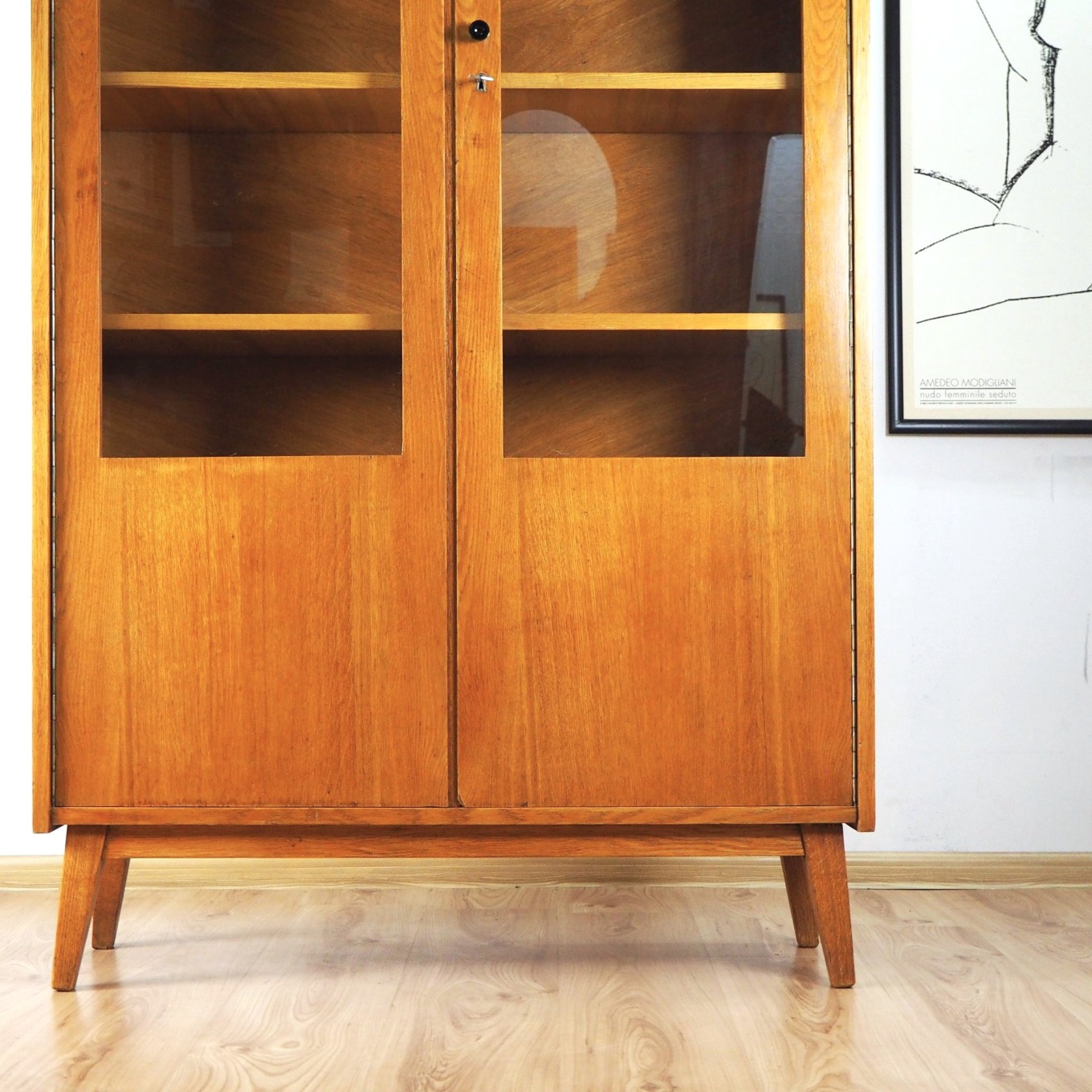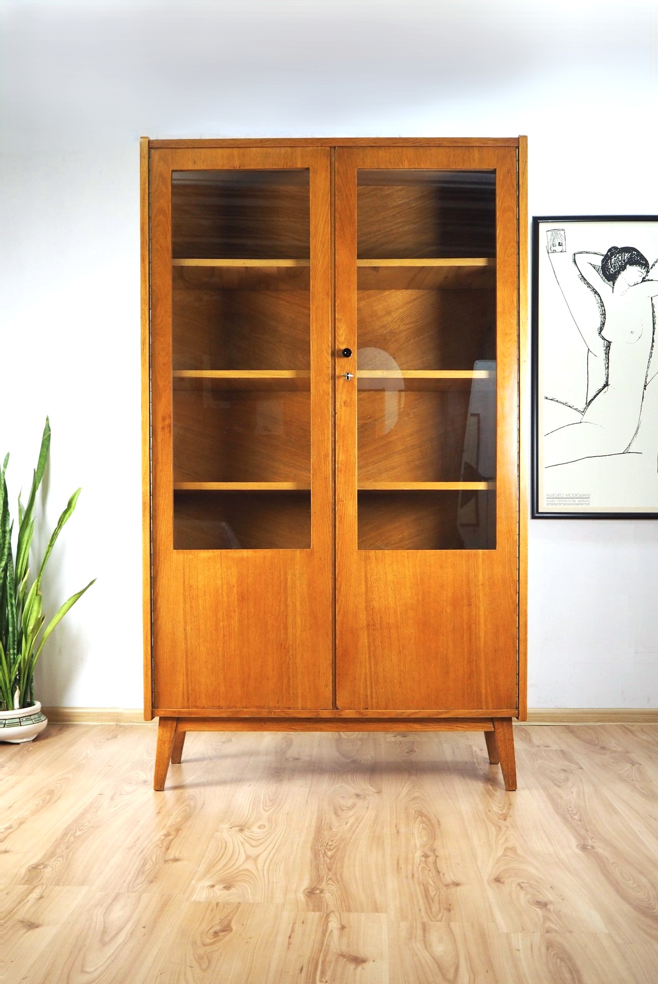 Architekto Vytauto Beigos projektuota knygų lentyna elegantiška dėl siauros formos: žiūrint iš šono spintelė atrodo beveik miniatiūrinė, "petite" - jos gylis vos 32 cm. Nepaisant to, yra tvirta ir stabili. Jokių perteklinių elementų - visos linijos tiesios ir aiškios. Šviesus lukštas. Puiki kokybiško lietuviško paveldo detalė moderniam interjerui.