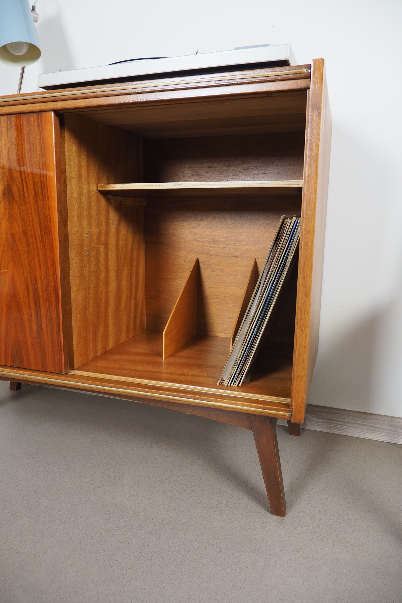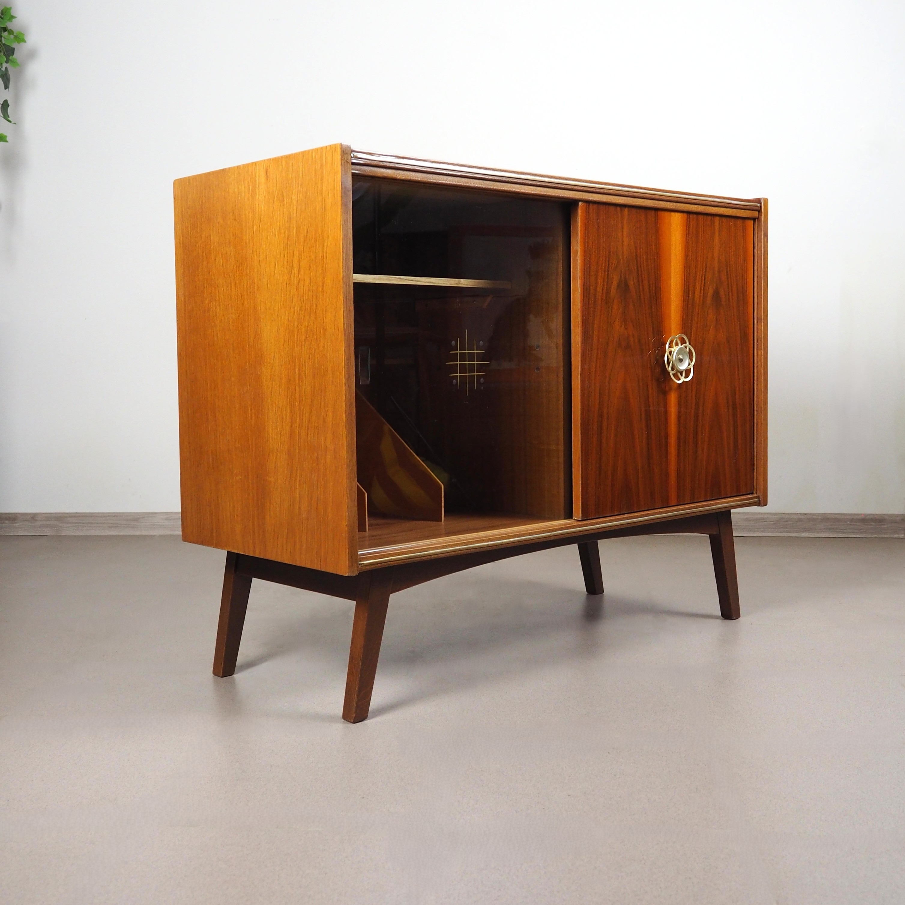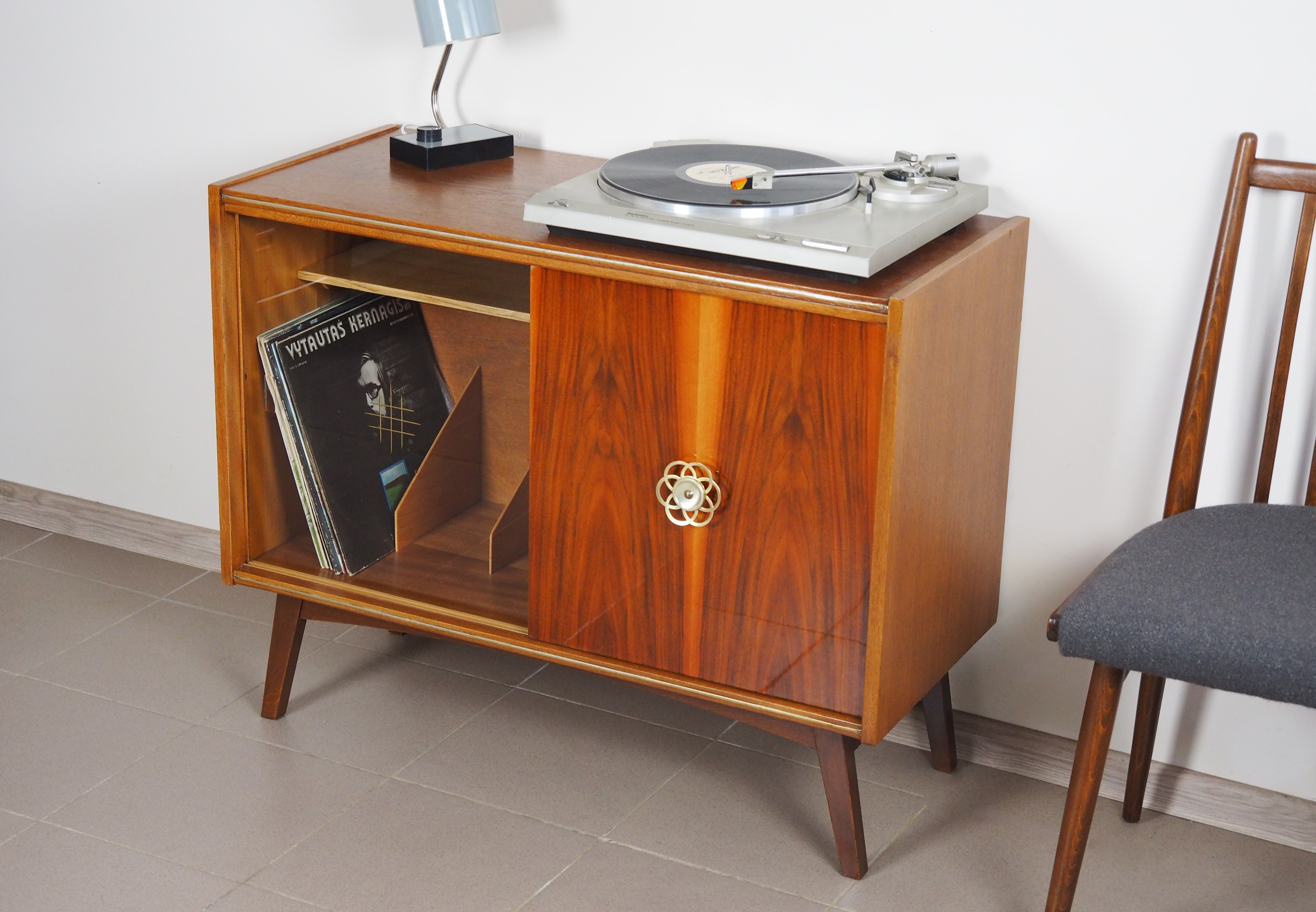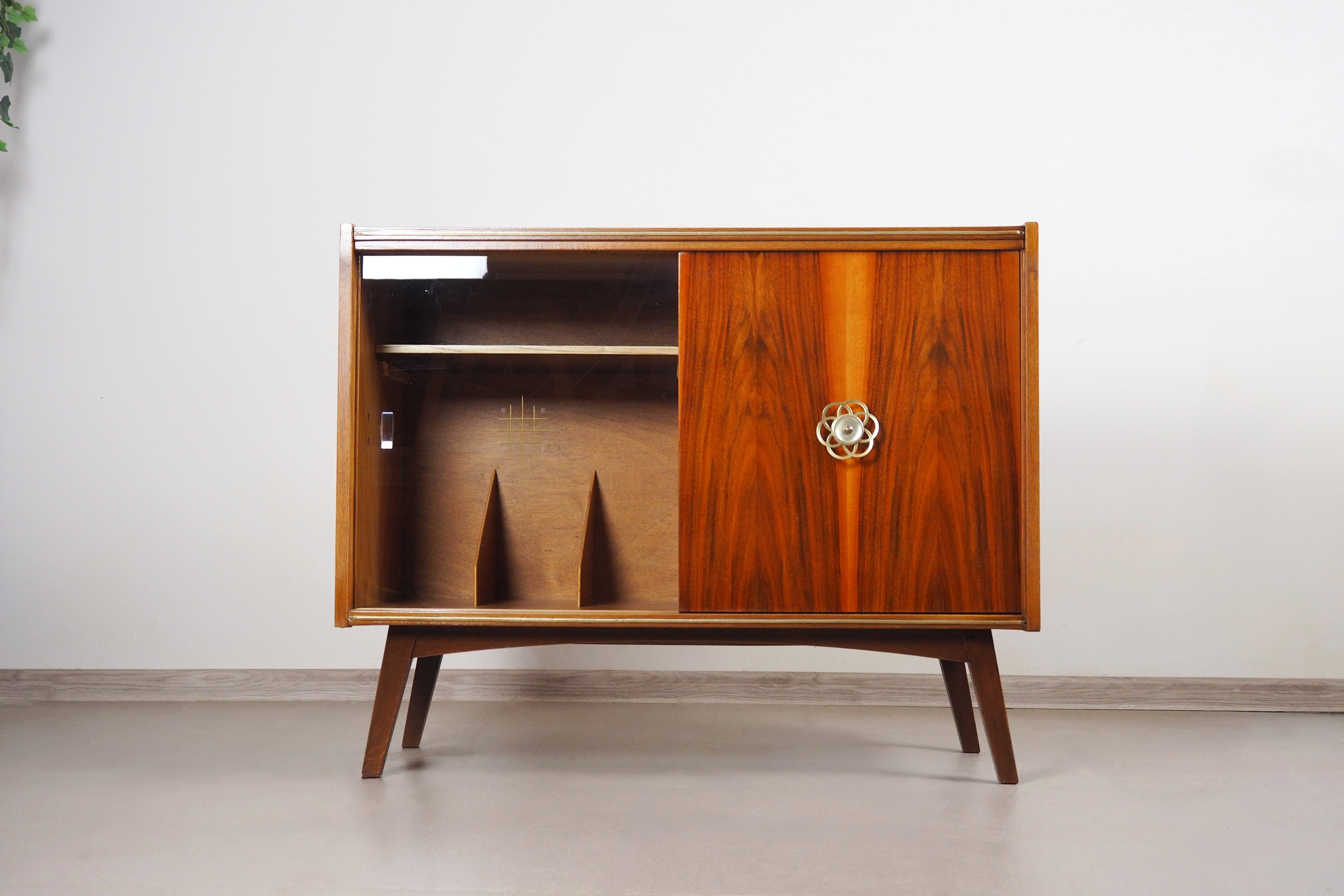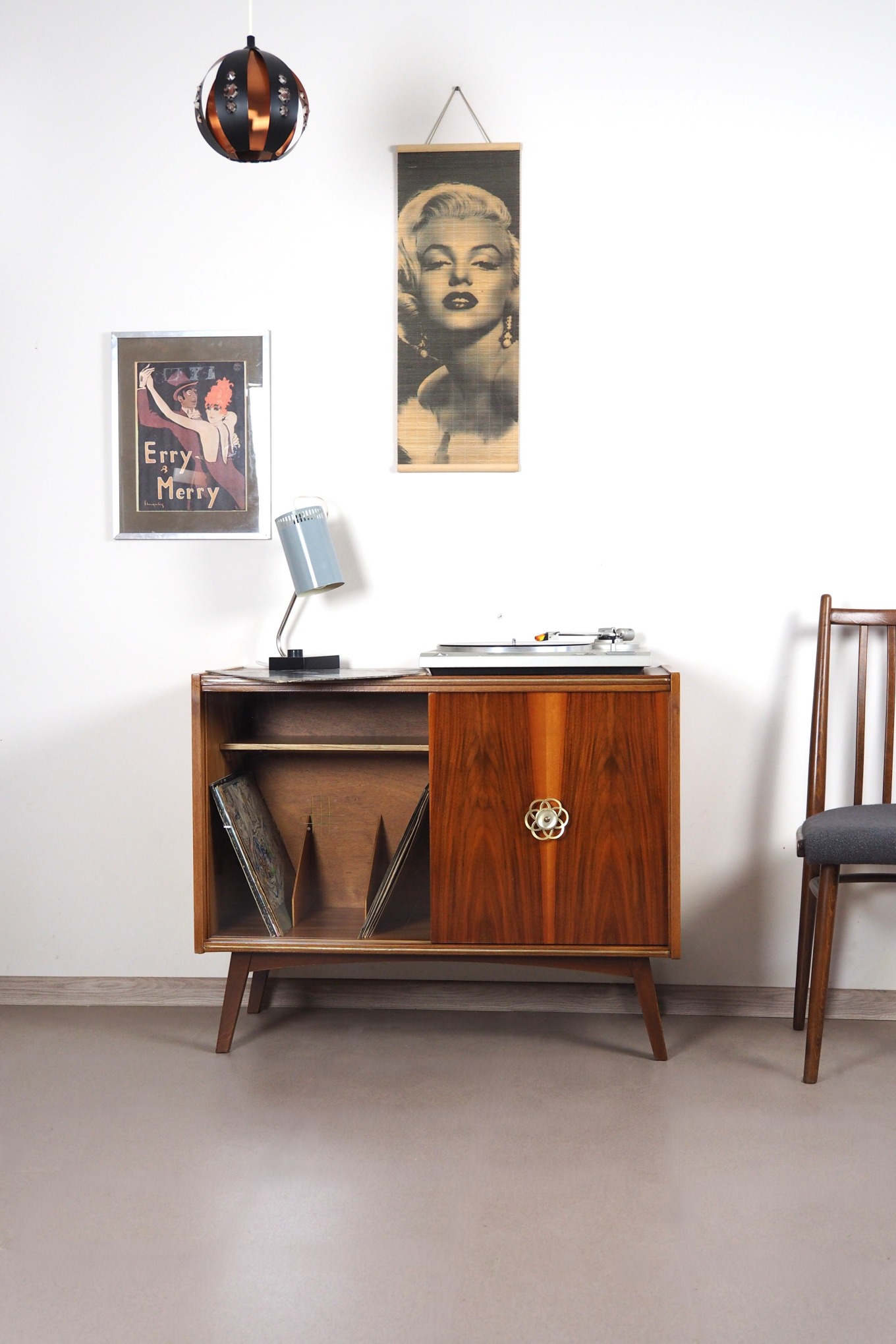 Vokiška Mid Century spintelė iš natūralaus medžio faneruotės, patogiai pritaikyta vinilų laikymui. Viduje įrengtos naujos, tvirtos pertvaros, leidžiančios patogiai rūšiuoti ir laikyti plokšteles. Spintelė vienoje pusėje turi slankiojančias dureles su originalia metaline rankenėle ir stiklą kitoje, kas apsaugo įrašus nuo dulkėjimo. Baldas kokybiškas, stabilus, restauruotas. Spintelė žema, kompaktiška, lengvai pastatoma net mažoje svetainės zonoje.