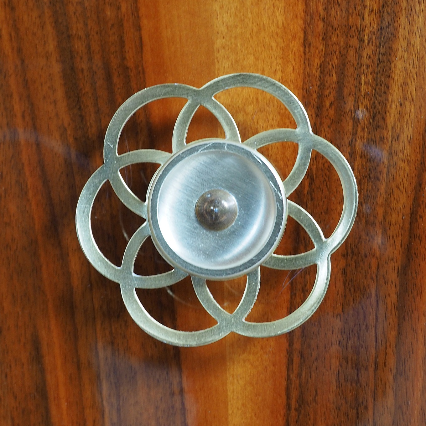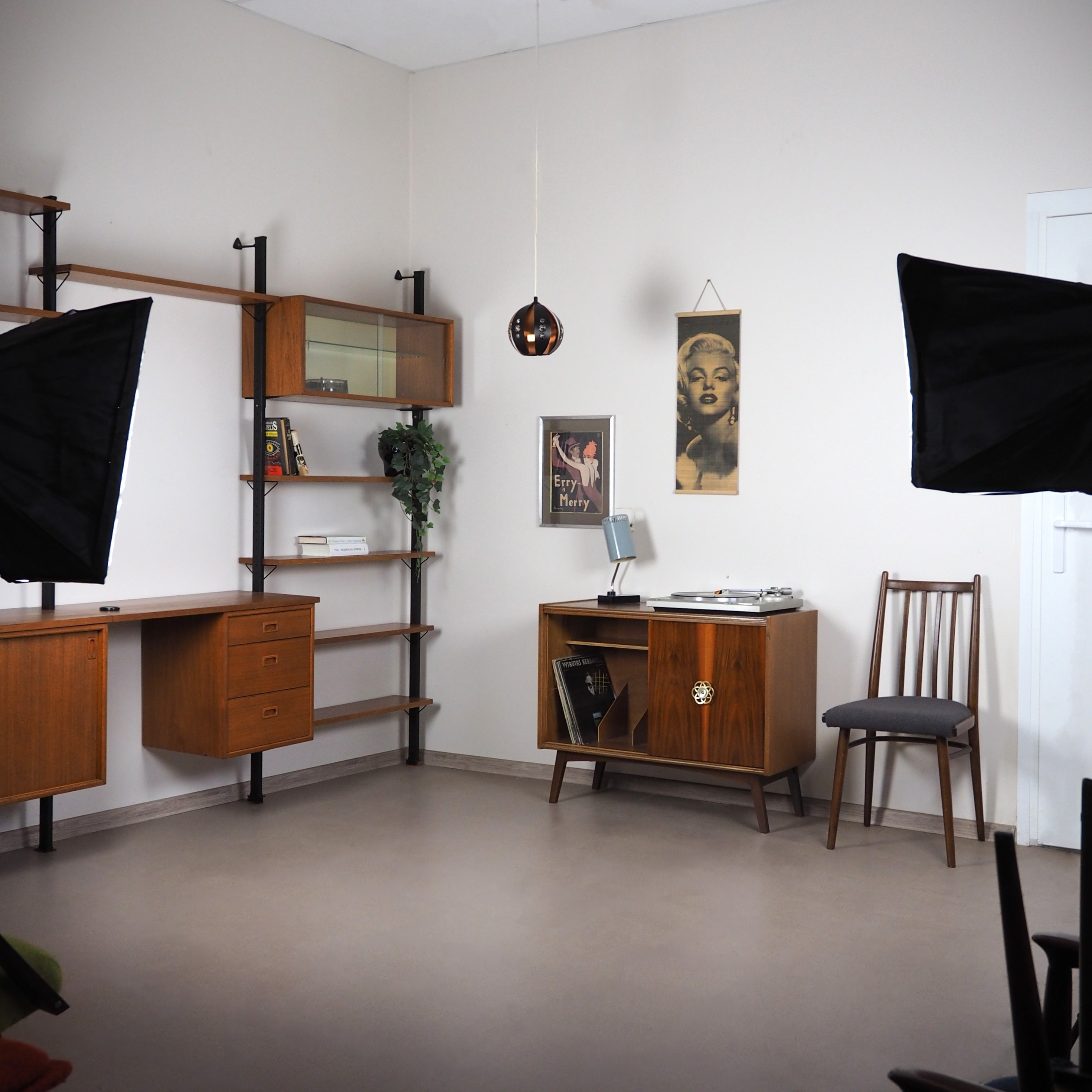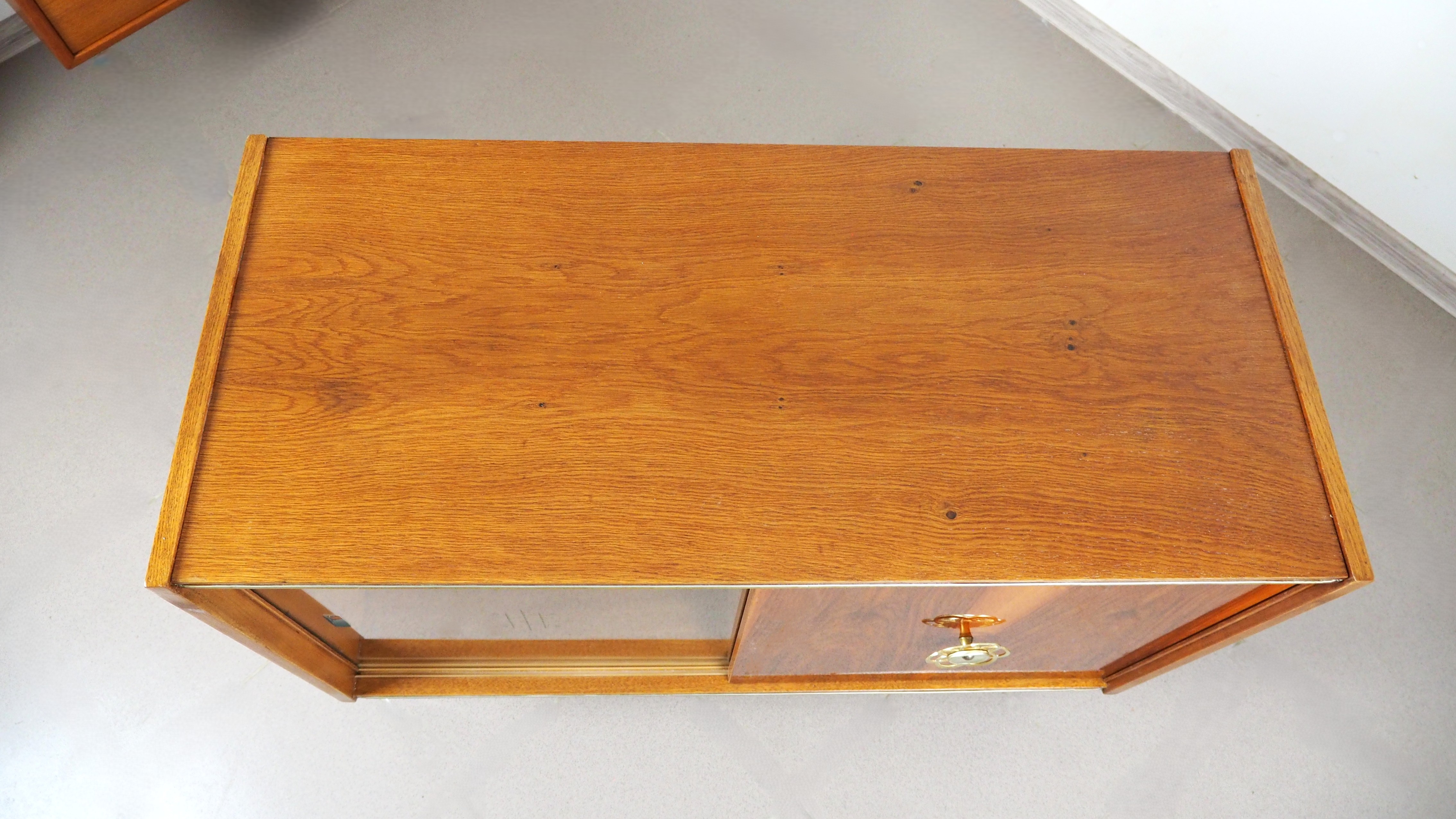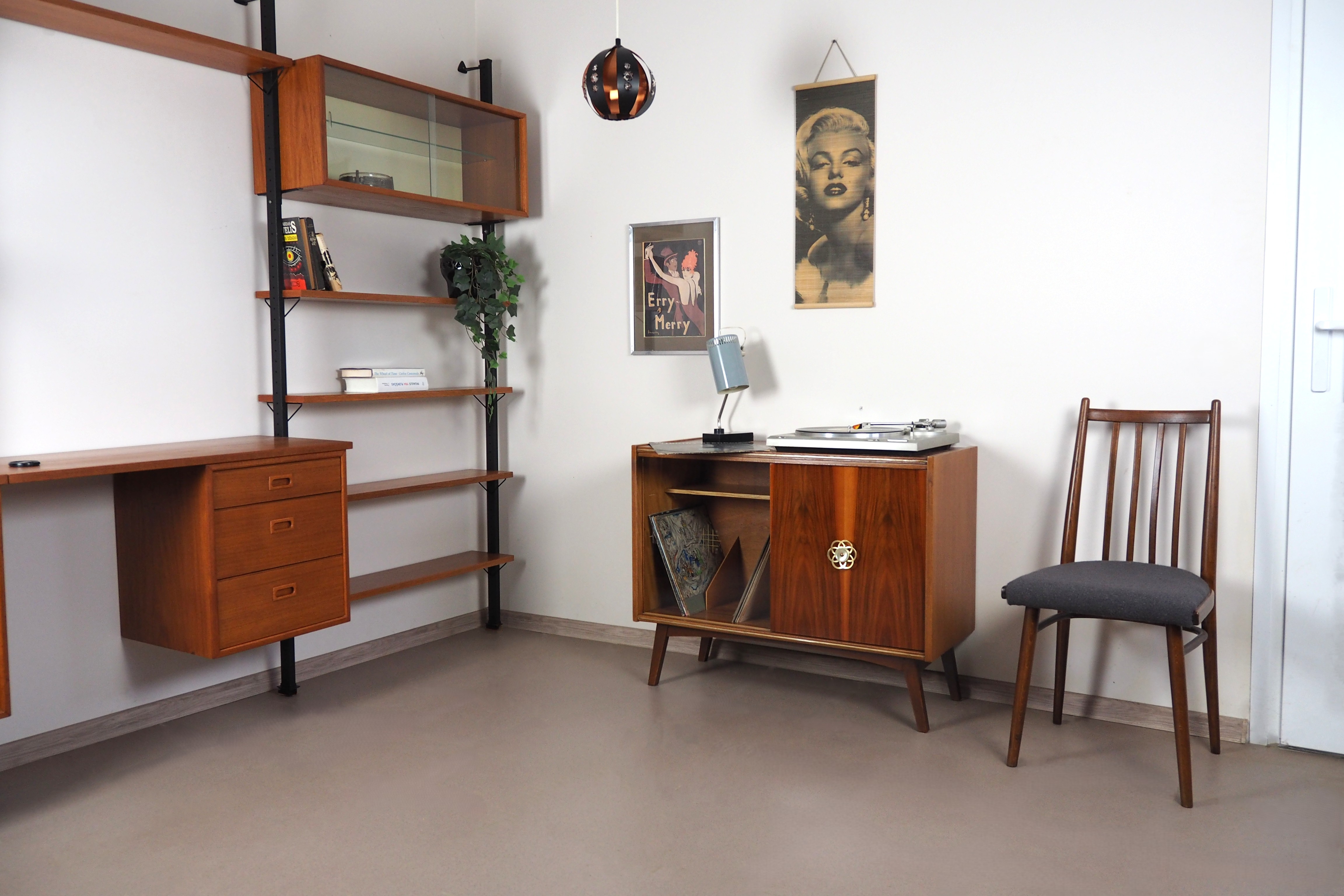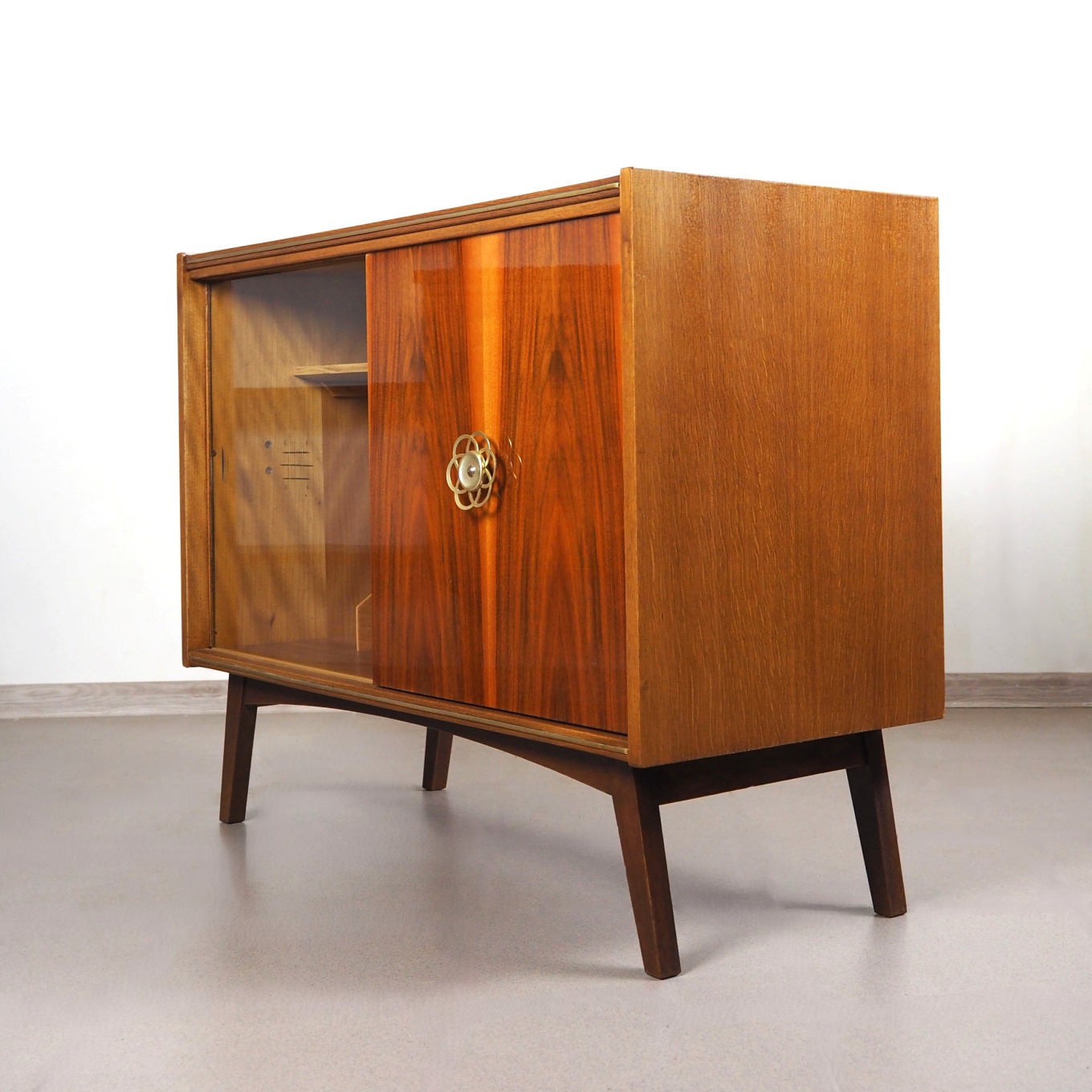 Vokiška Mid Century spintelė iš natūralaus medžio faneruotės, patogiai pritaikyta vinilų laikymui. Viduje įrengtos naujos, tvirtos pertvaros, leidžiančios patogiai rūšiuoti ir laikyti plokšteles. Spintelė vienoje pusėje turi slankiojančias dureles su originalia metaline rankenėle ir stiklą kitoje, kas apsaugo įrašus nuo dulkėjimo. Baldas kokybiškas, stabilus, restauruotas. Spintelė žema, kompaktiška, lengvai pastatoma net mažoje svetainės zonoje.