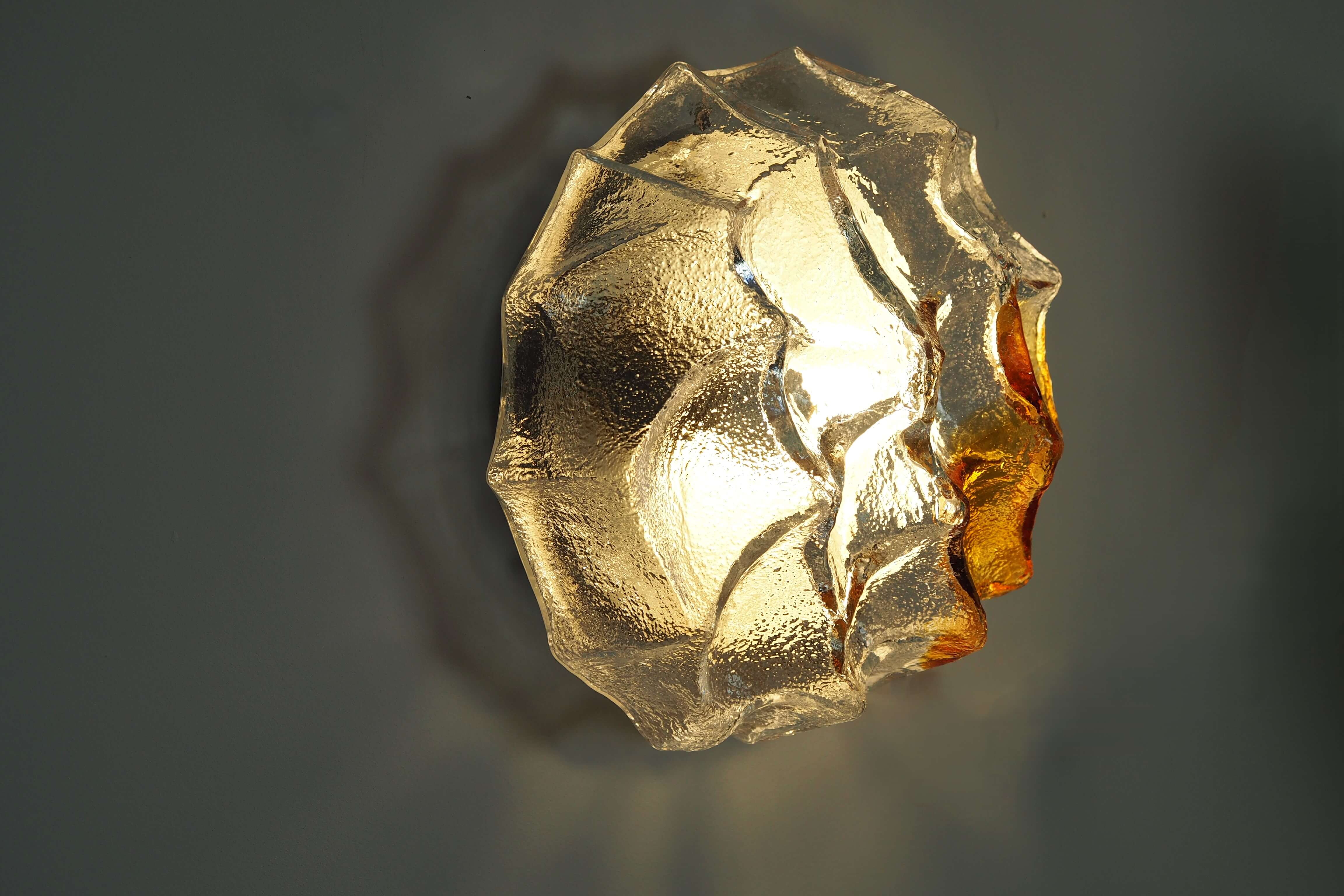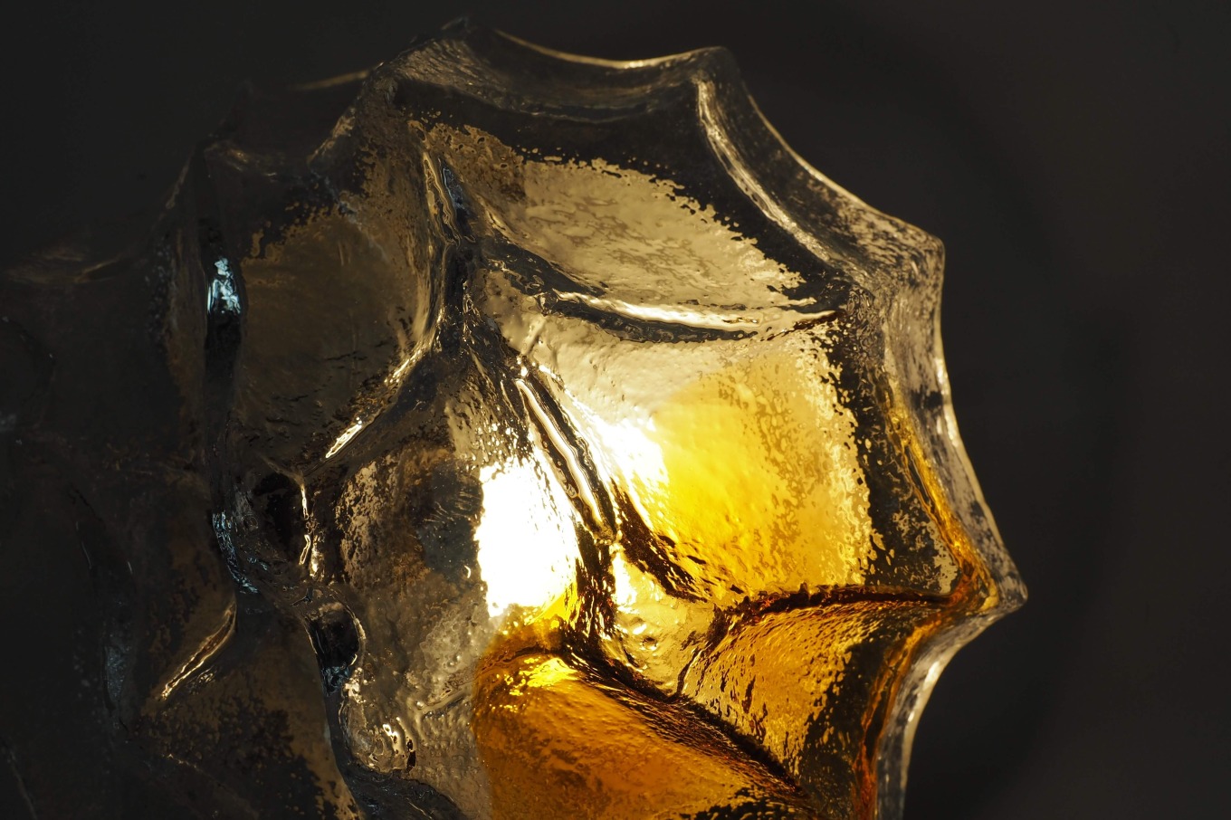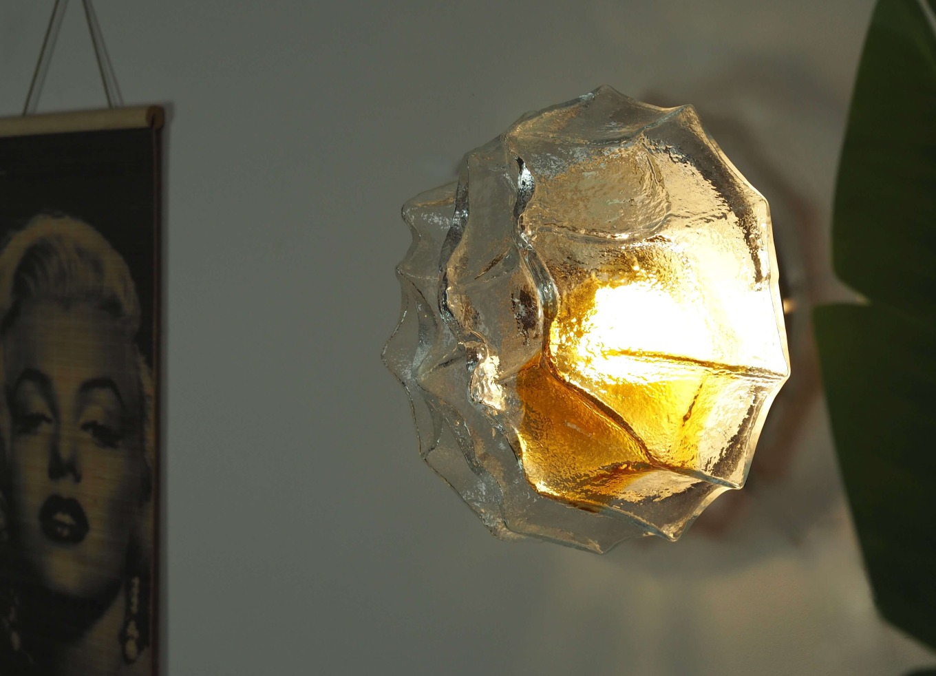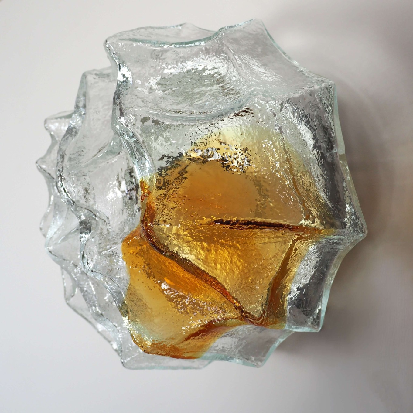 Šis mid-century Murano stiklo* šviestuvas - tai ne tik šviesos šaltinis, bet ir meno kūrinys, išsiskiriantis dramatiška skulptūriška forma, kuri primena ledinius kalnus. Šį įspūdį sukuria pūstas, tekstūruotas „ledo stiklas“ (ice glass). Gintaro spalvos akcentas ir krištolo tekstūra sukuria unikalų šviesos lūžimą.