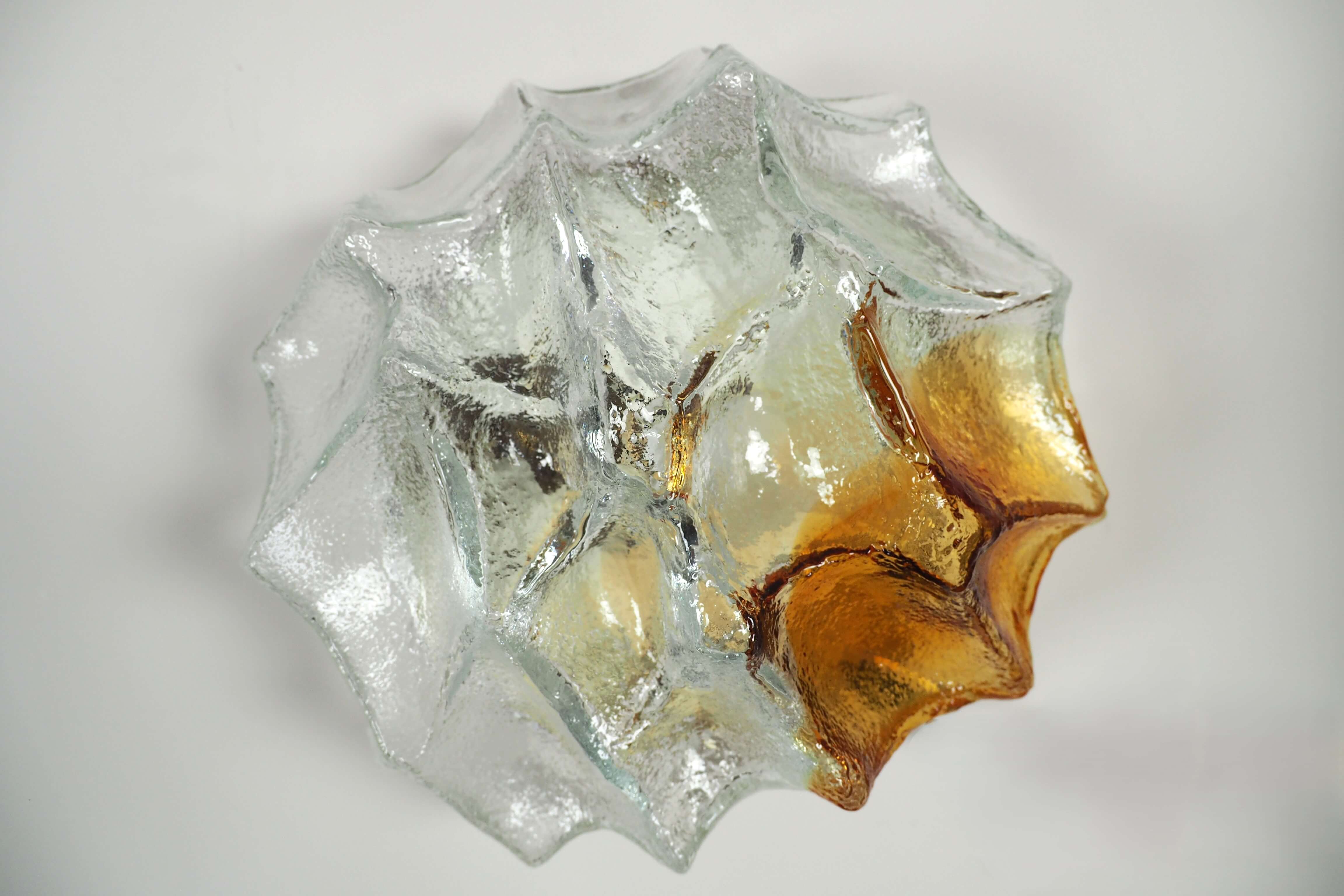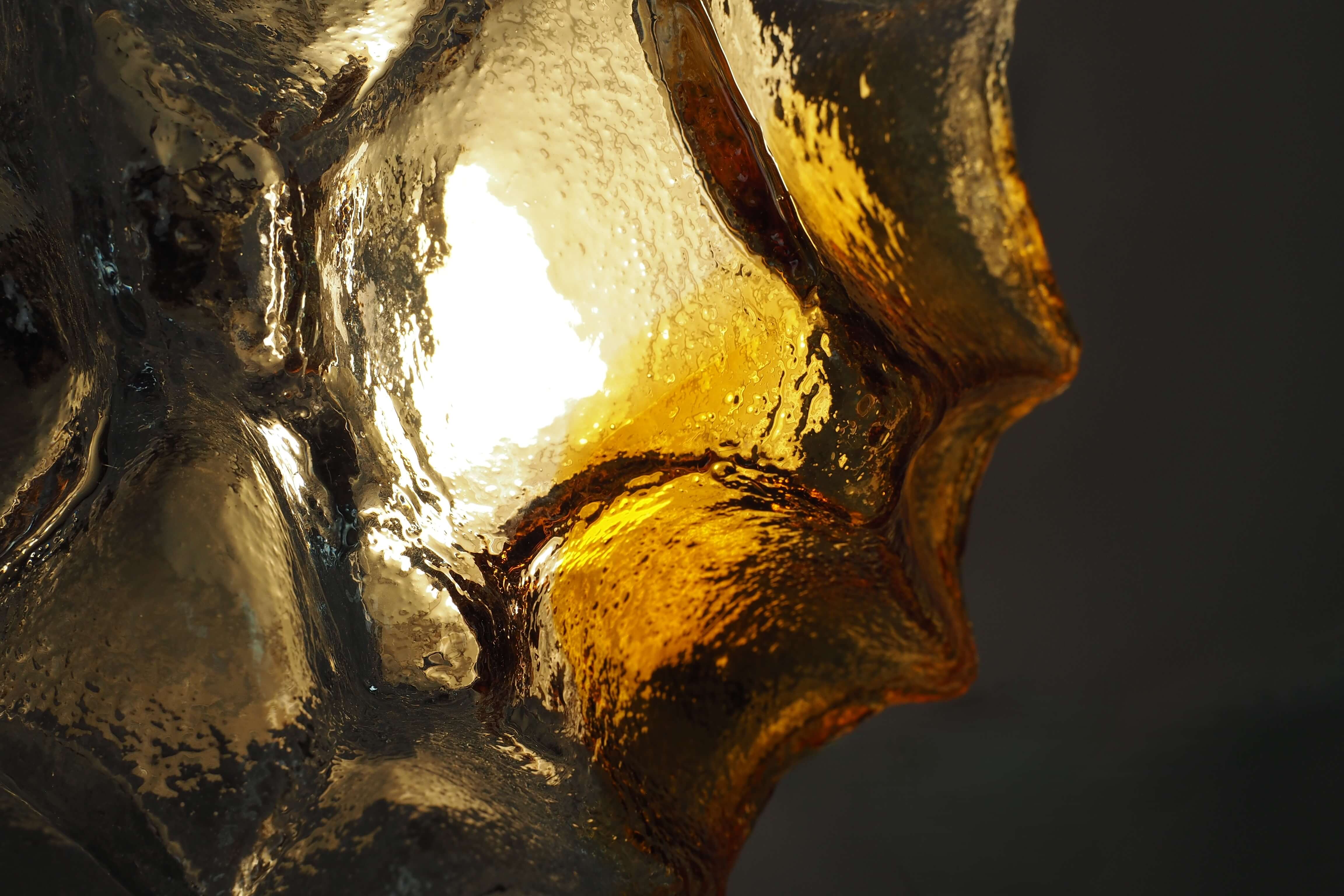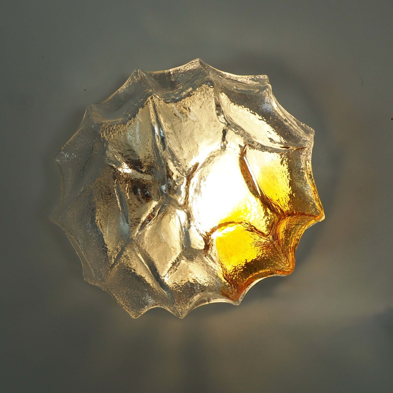 Šis mid-century Murano stiklo* šviestuvas - tai ne tik šviesos šaltinis, bet ir meno kūrinys, išsiskiriantis dramatiška skulptūriška forma, kuri primena ledinius kalnus. Šį įspūdį sukuria pūstas, tekstūruotas „ledo stiklas“ (ice glass). Gintaro spalvos akcentas ir krištolo tekstūra sukuria unikalų šviesos lūžimą.