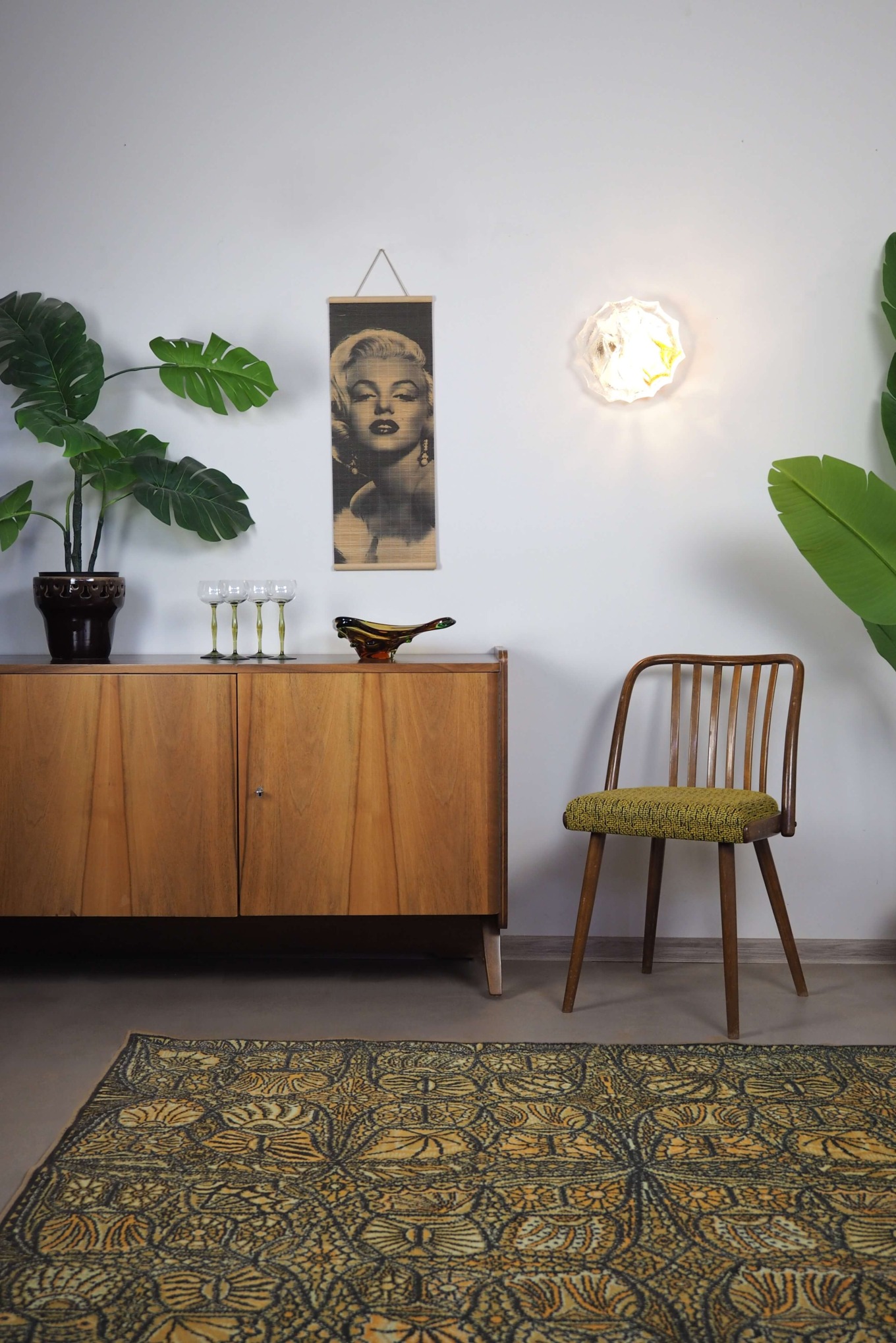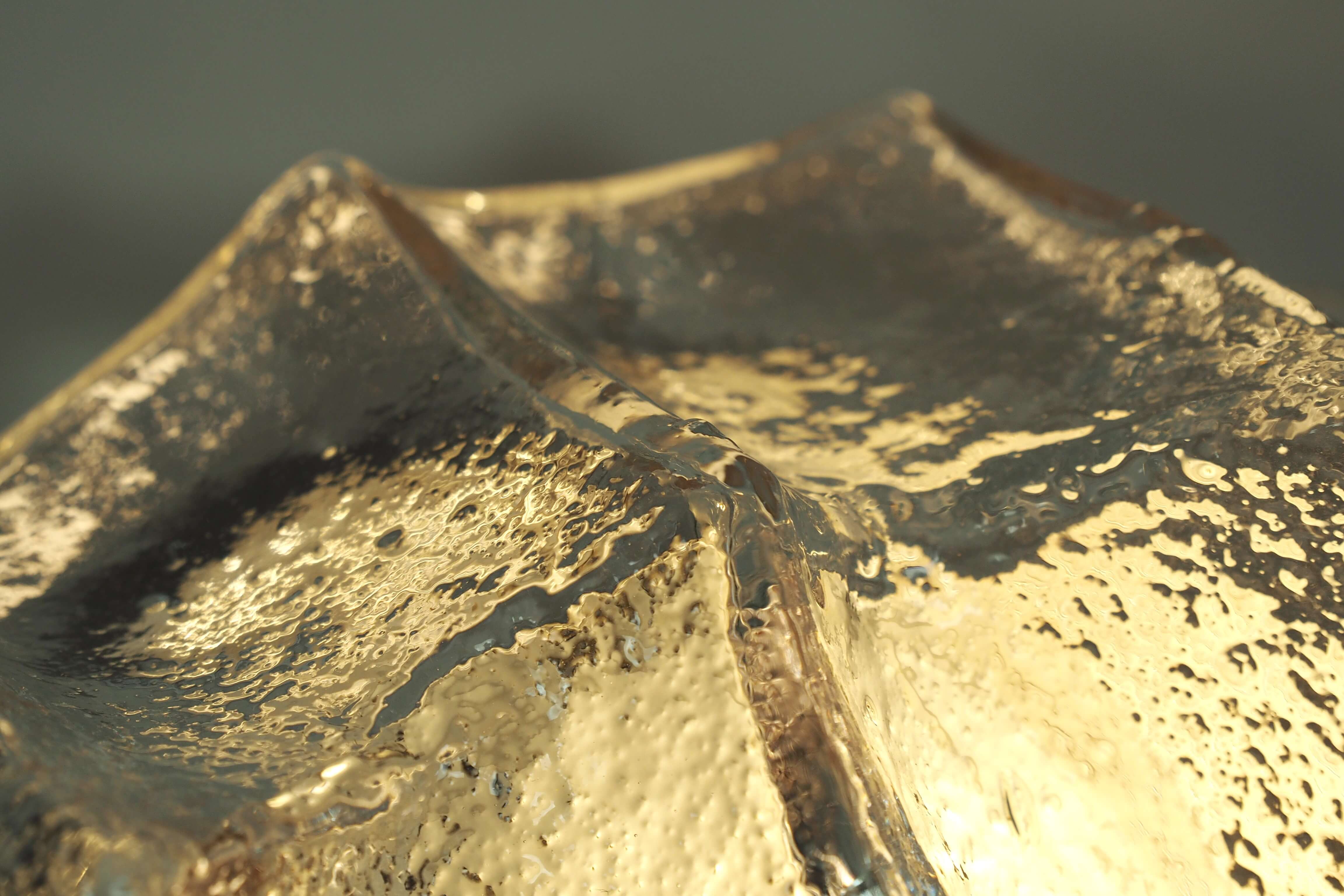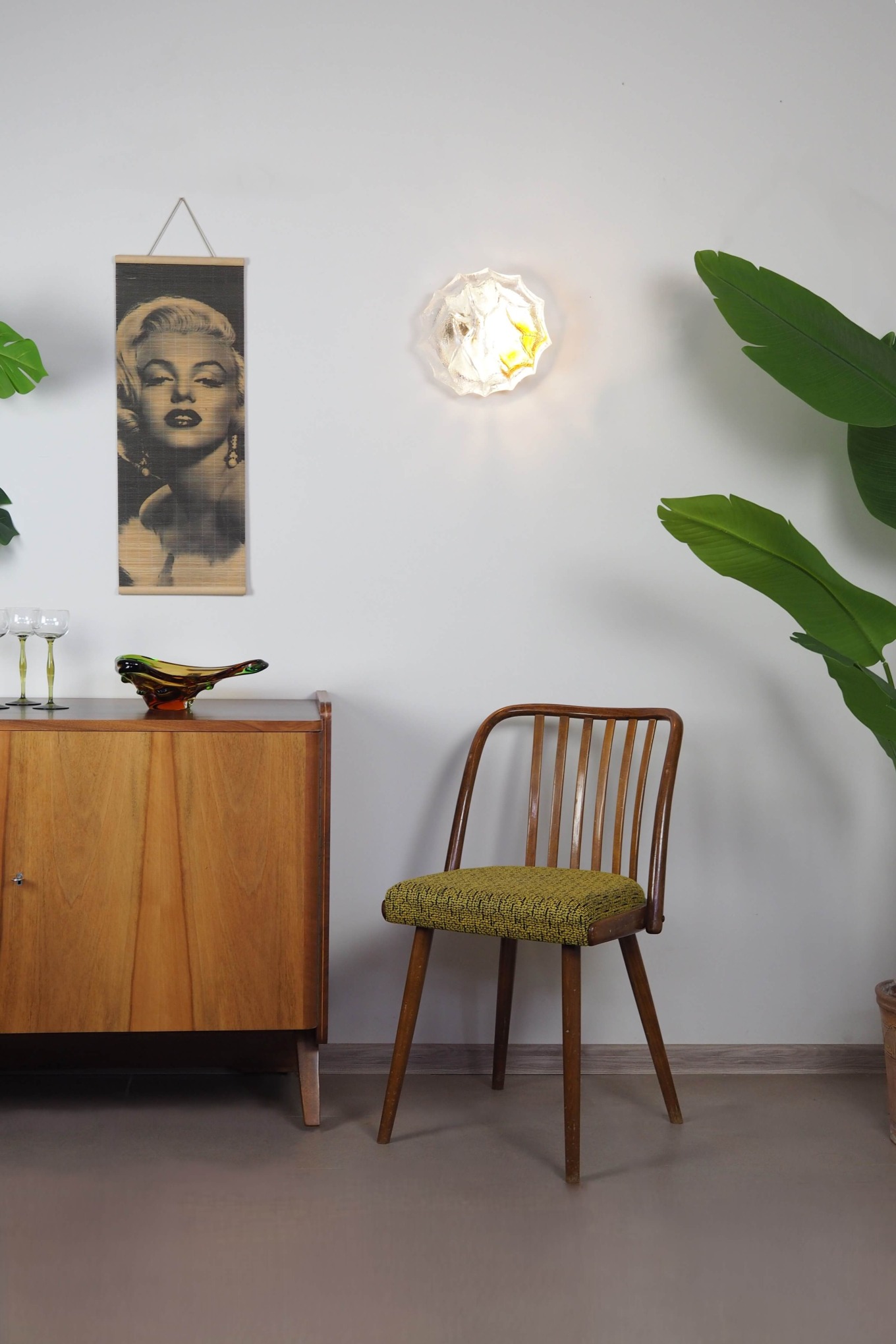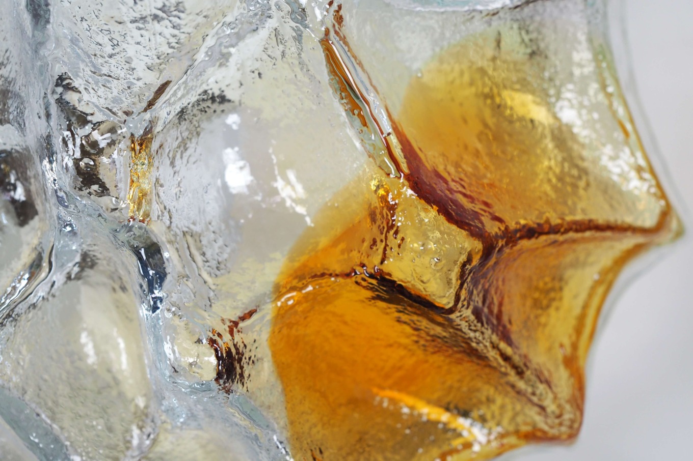 Šis mid-century Murano stiklo* šviestuvas - tai ne tik šviesos šaltinis, bet ir meno kūrinys, išsiskiriantis dramatiška skulptūriška forma, kuri primena ledinius kalnus. Šį įspūdį sukuria pūstas, tekstūruotas „ledo stiklas“ (ice glass). Gintaro spalvos akcentas ir krištolo tekstūra sukuria unikalų šviesos lūžimą.