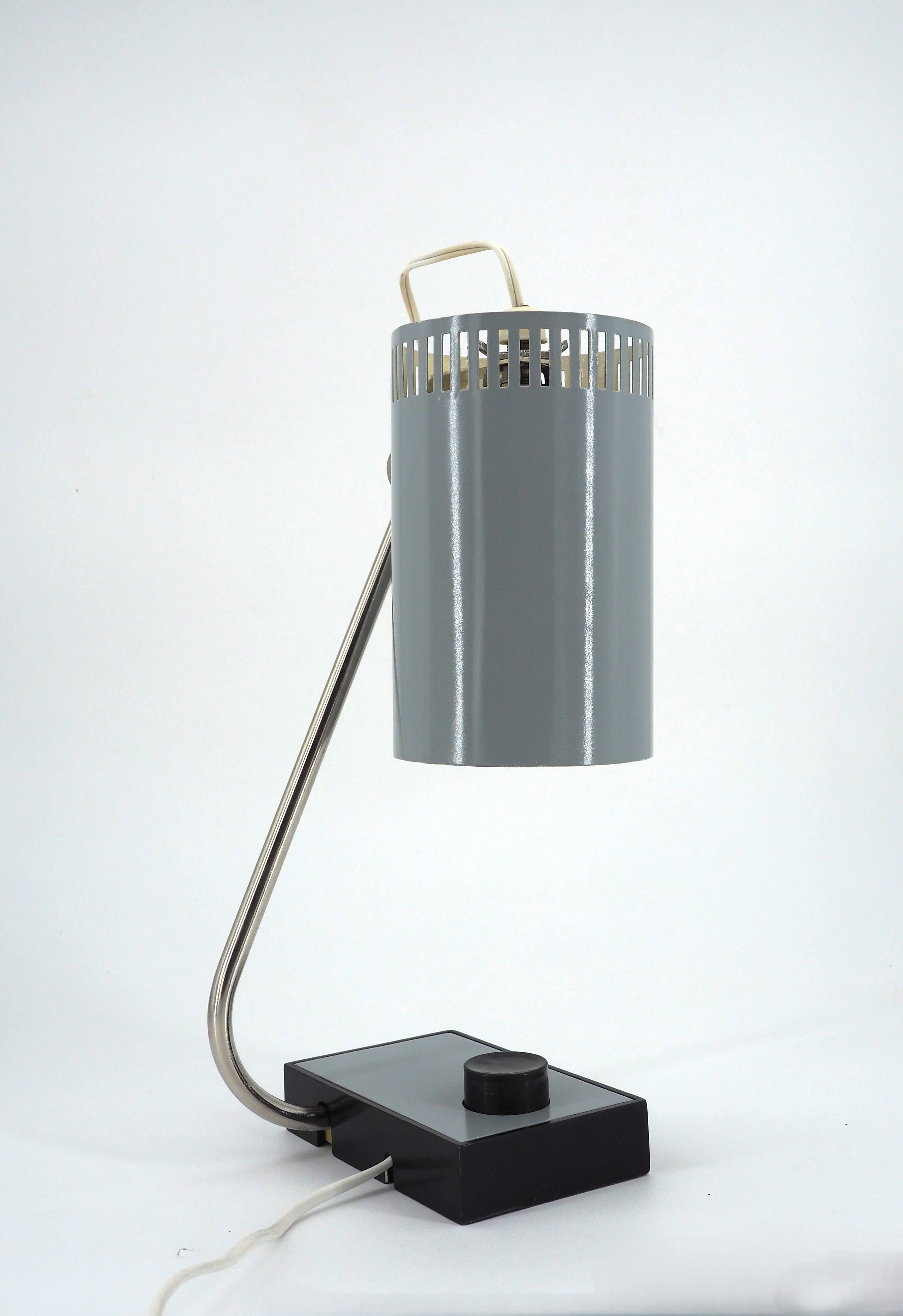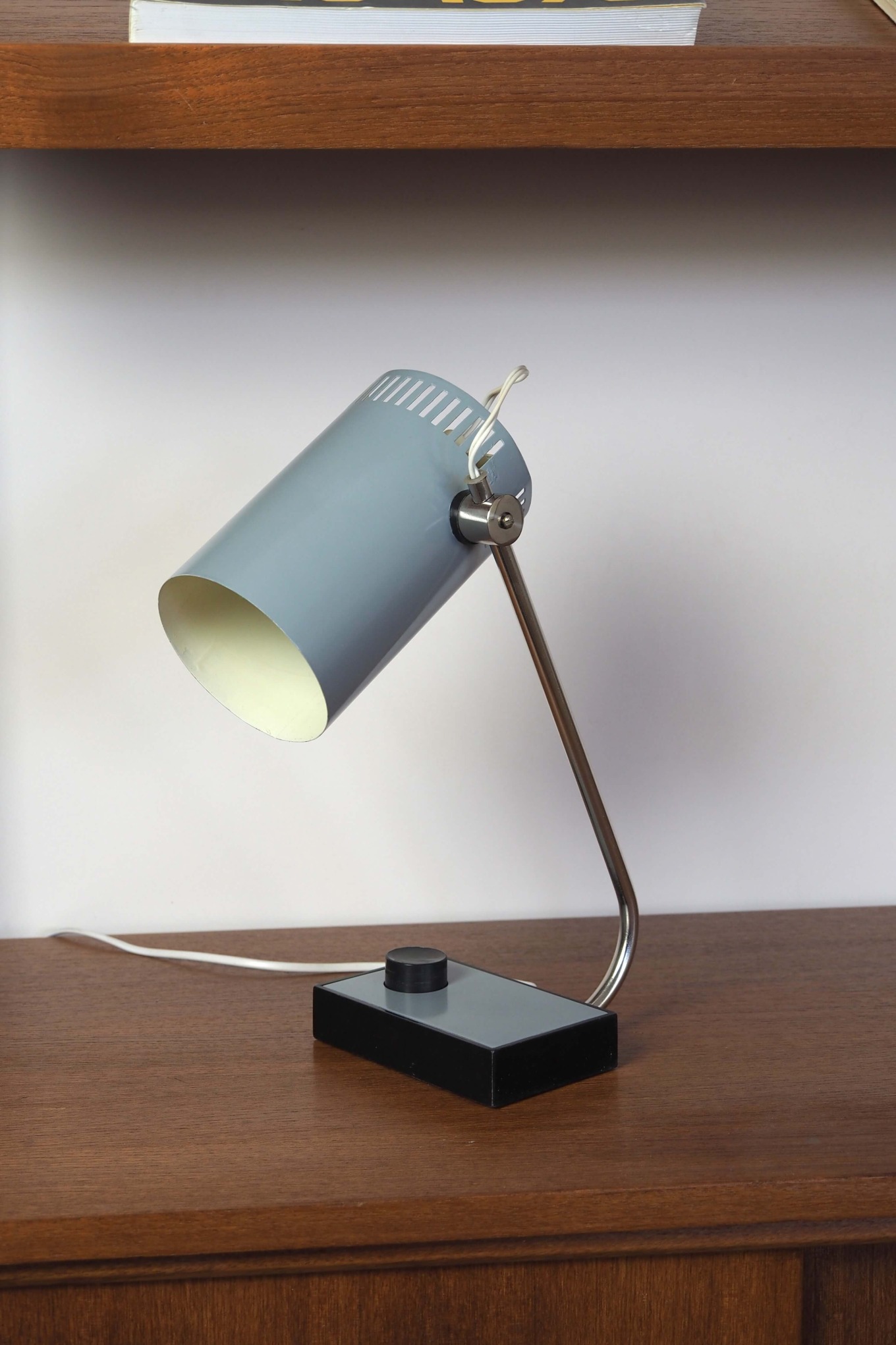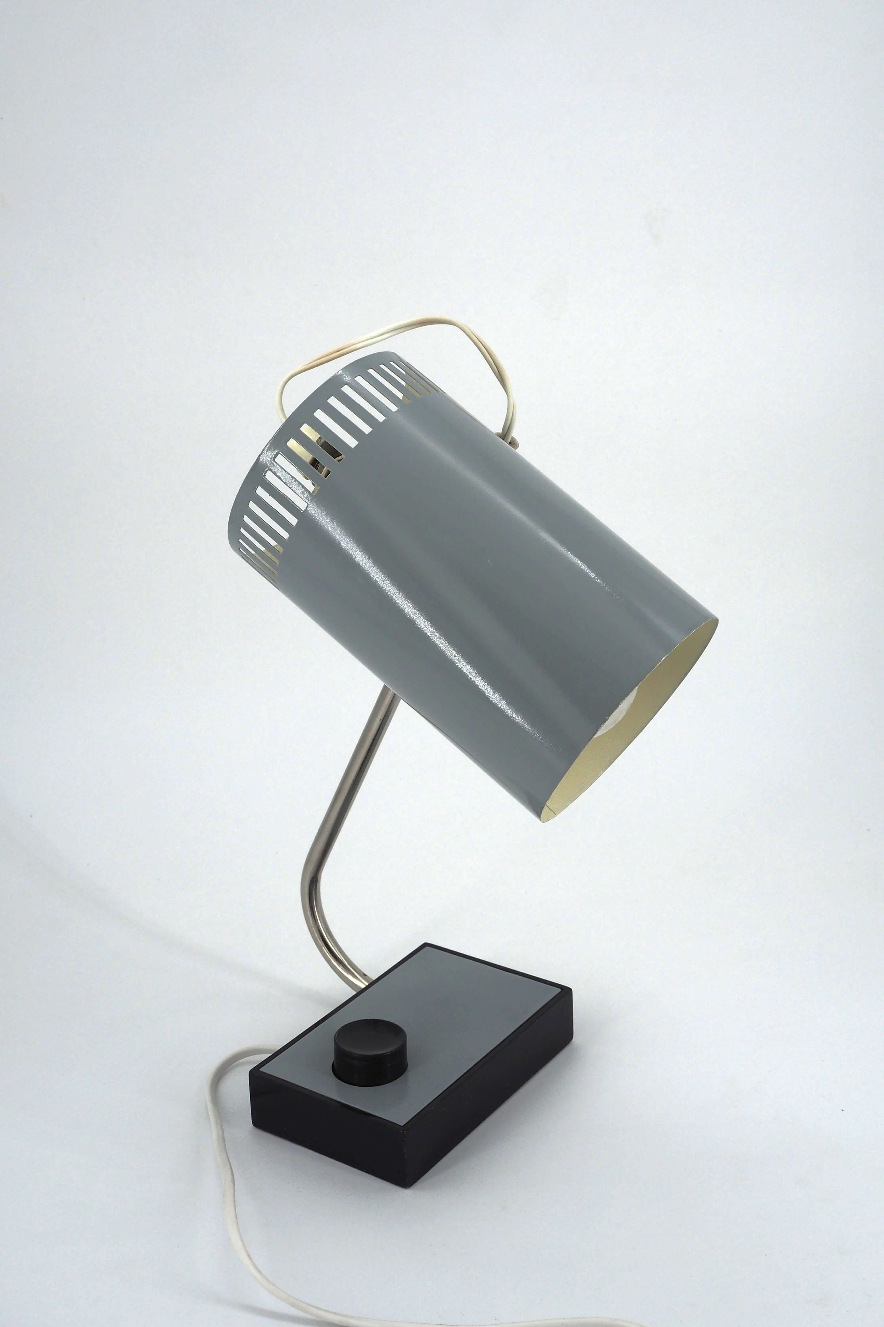 Restauruota vintažinė Mid Century Modern stalinė lempa, pagaminta buvusioje Čekoslovakijoje 7-ajame dešimtmetyje. Ji turi bakelitinį pagrindą su jungikliu, reguliuojamo kampo metalinį gaubtą ir chromuotą atraminę kojelę. Dėl švarių linijų ir cilindrinio gaubto šviestuvas atrodo moderniai ir tvarkingai. Puikus pasirinkimas darbo stalo apšvietimui.