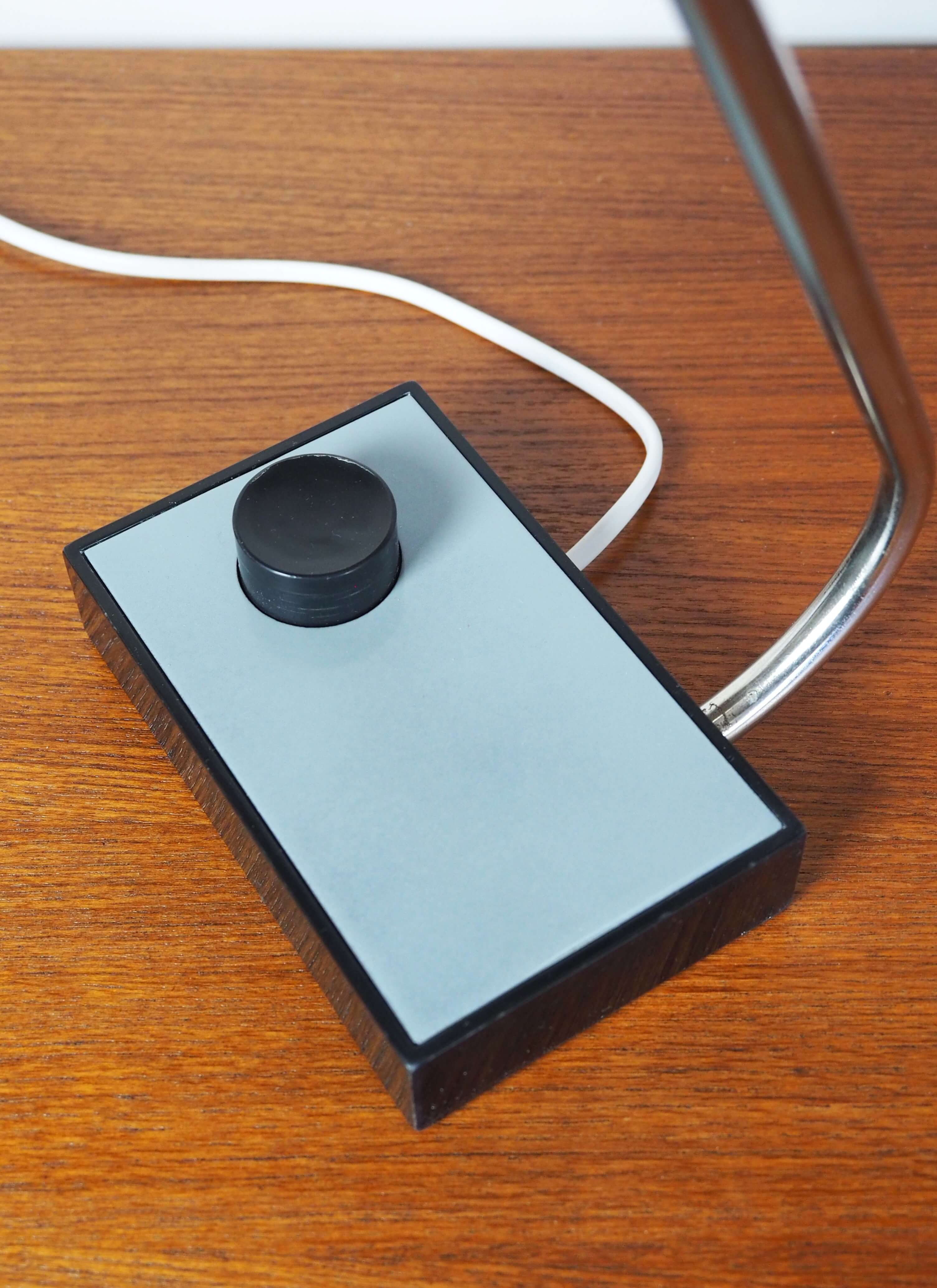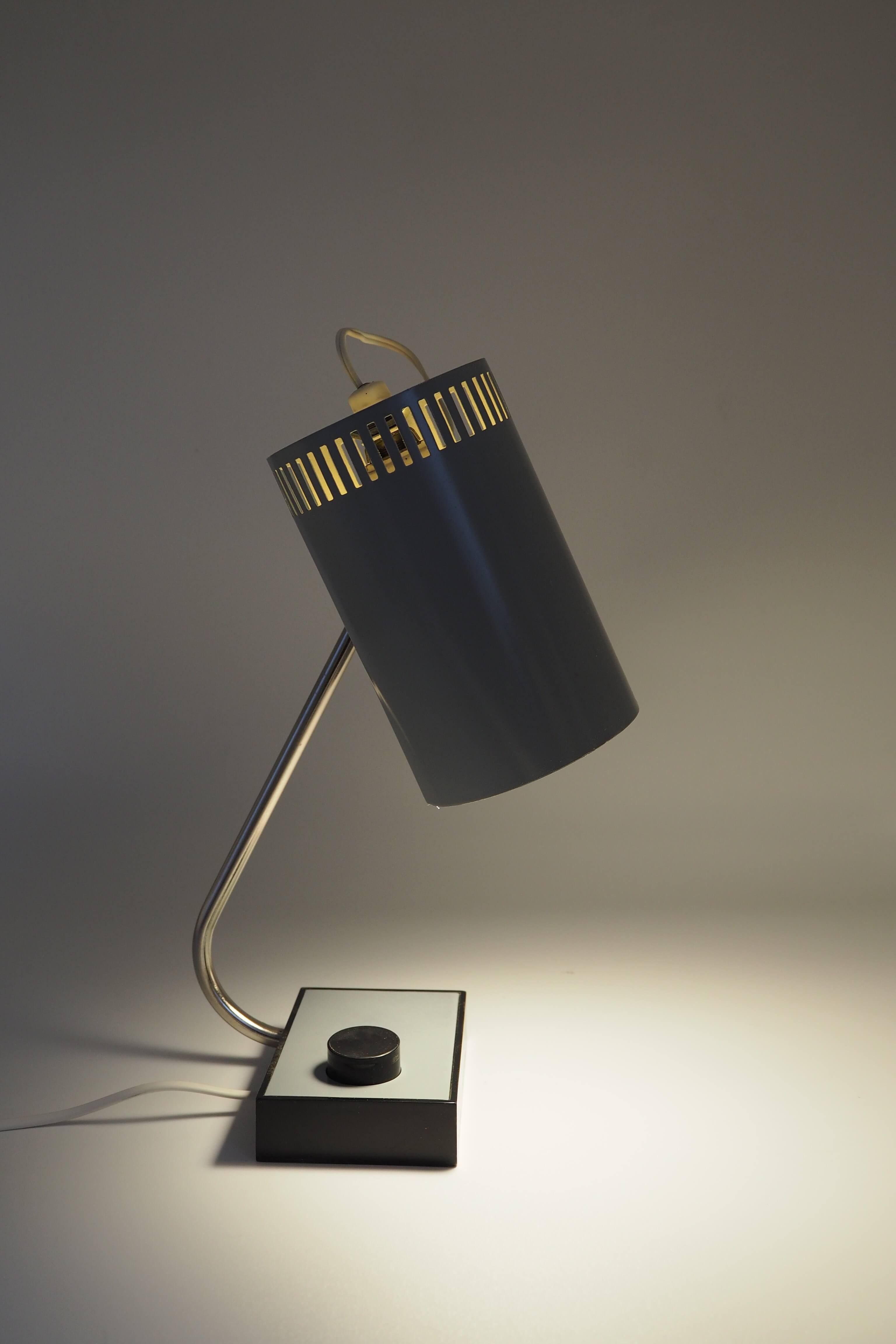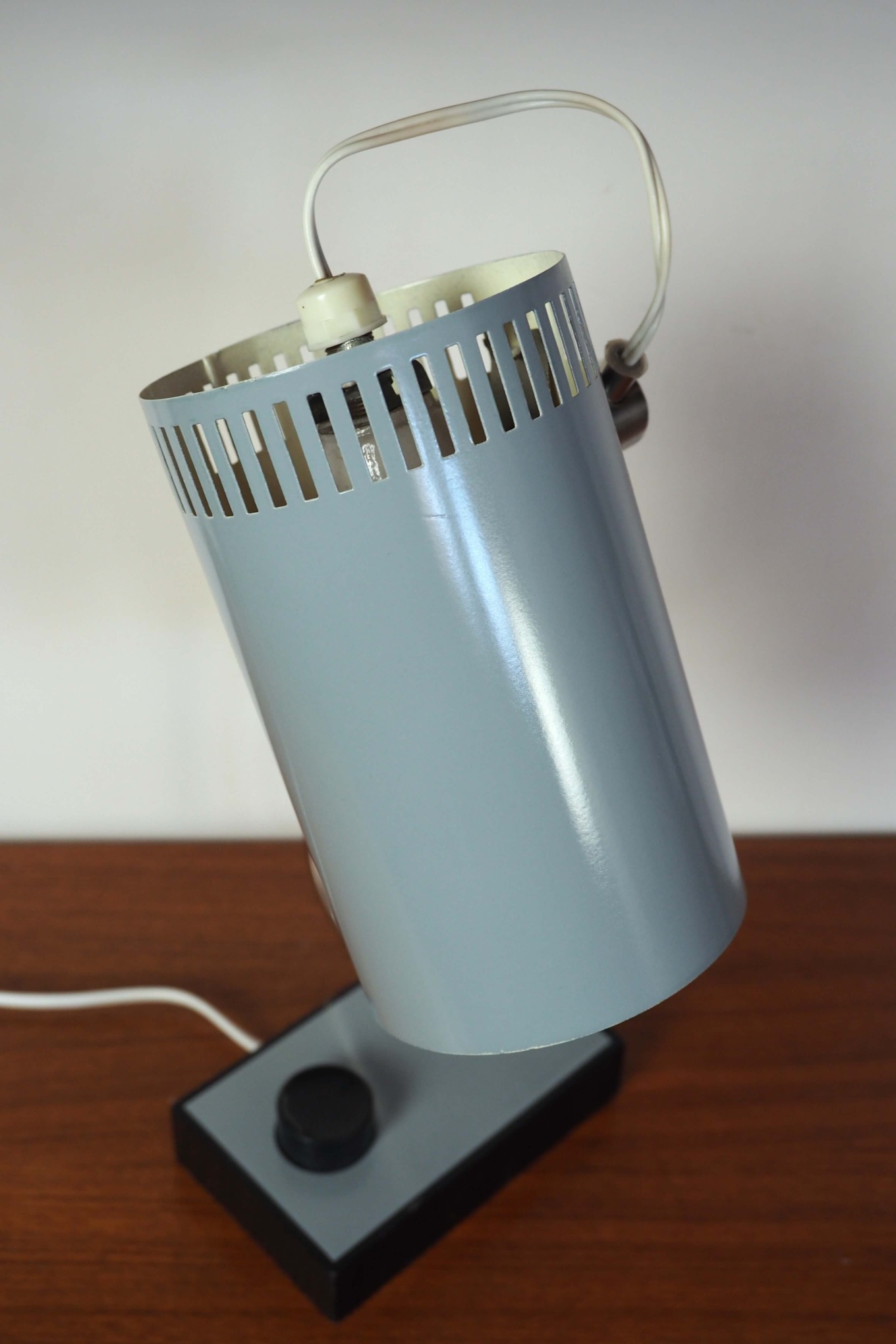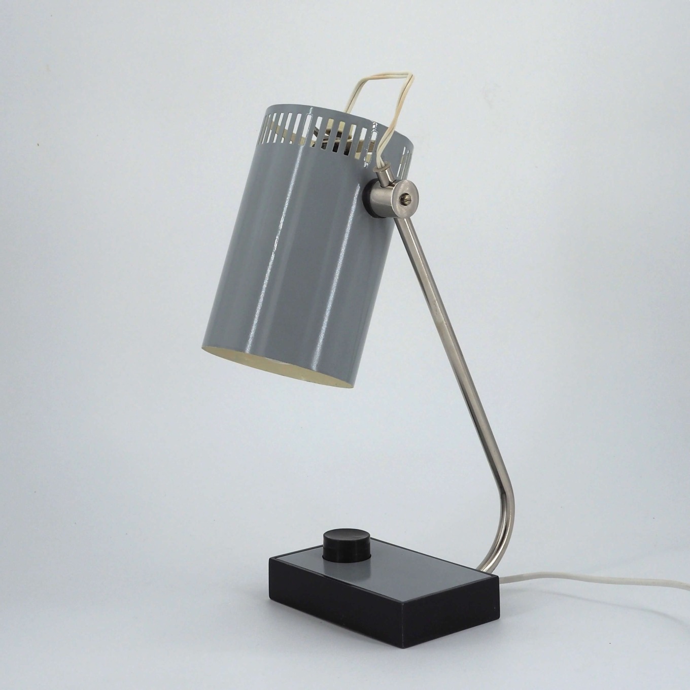 Restauruota vintažinė Mid Century Modern stalinė lempa, pagaminta buvusioje Čekoslovakijoje 7-ajame dešimtmetyje. Ji turi bakelitinį pagrindą su jungikliu, reguliuojamo kampo metalinį gaubtą ir chromuotą atraminę kojelę. Dėl švarių linijų ir cilindrinio gaubto šviestuvas atrodo moderniai ir tvarkingai. Puikus pasirinkimas darbo stalo apšvietimui.