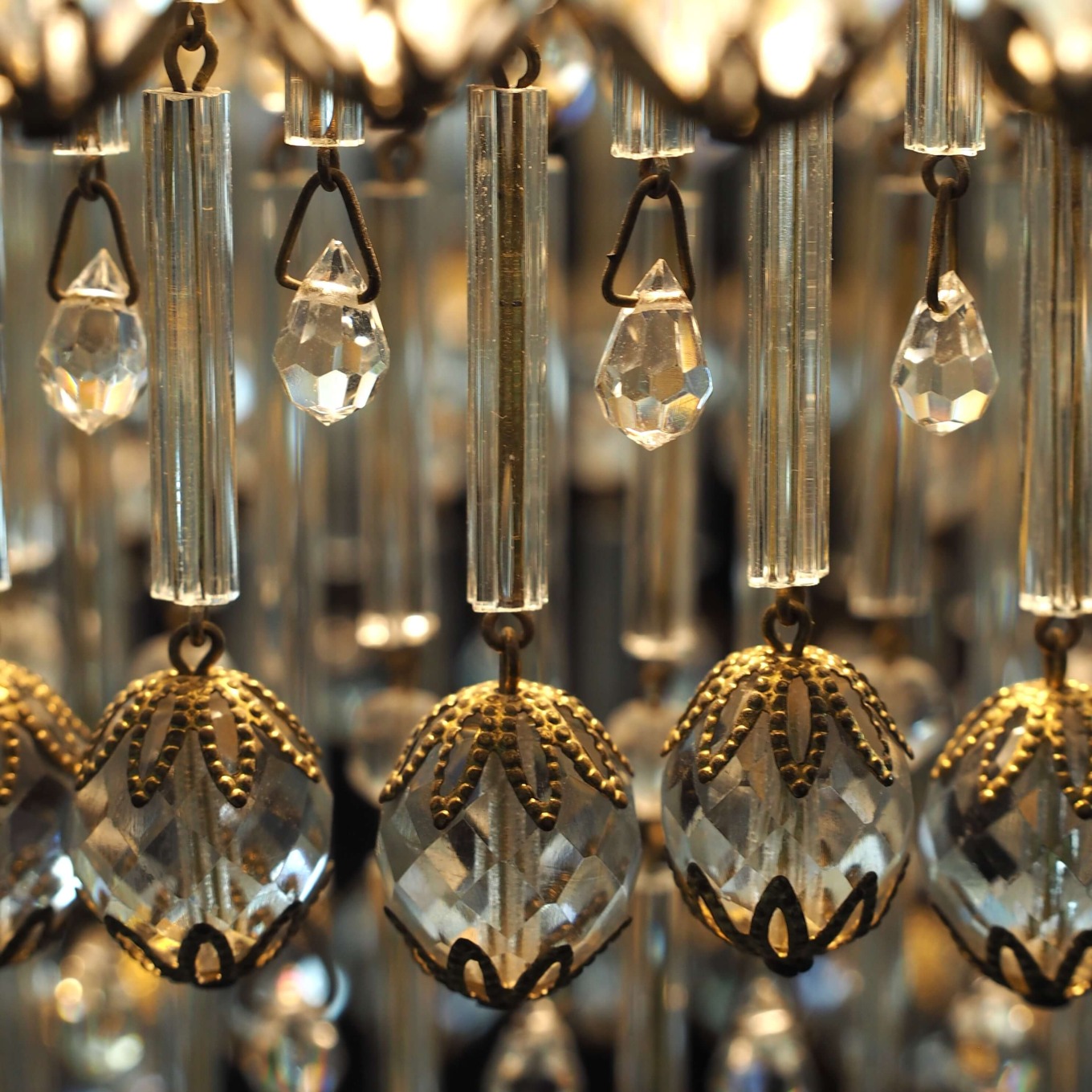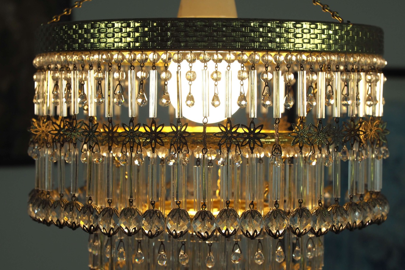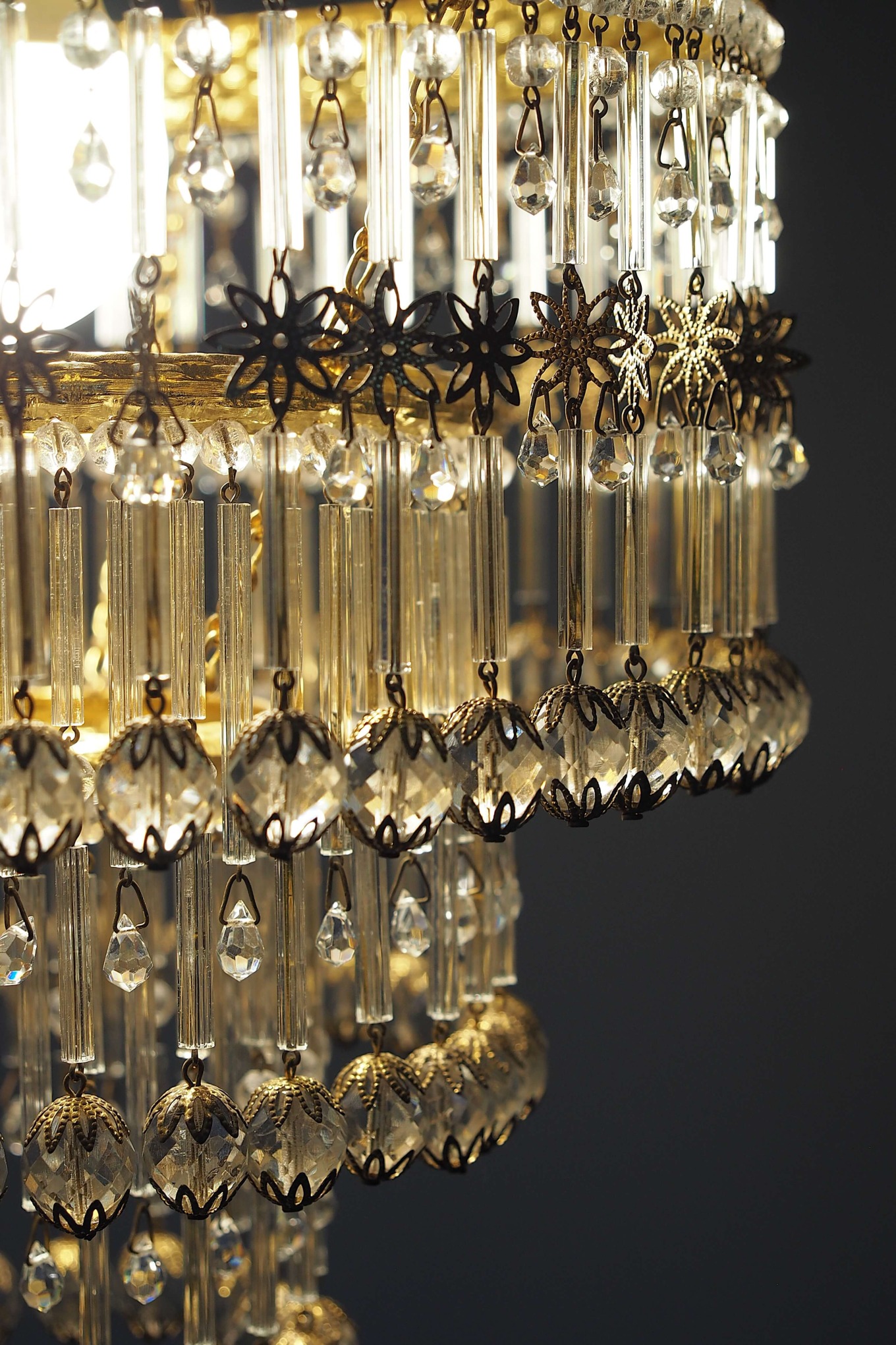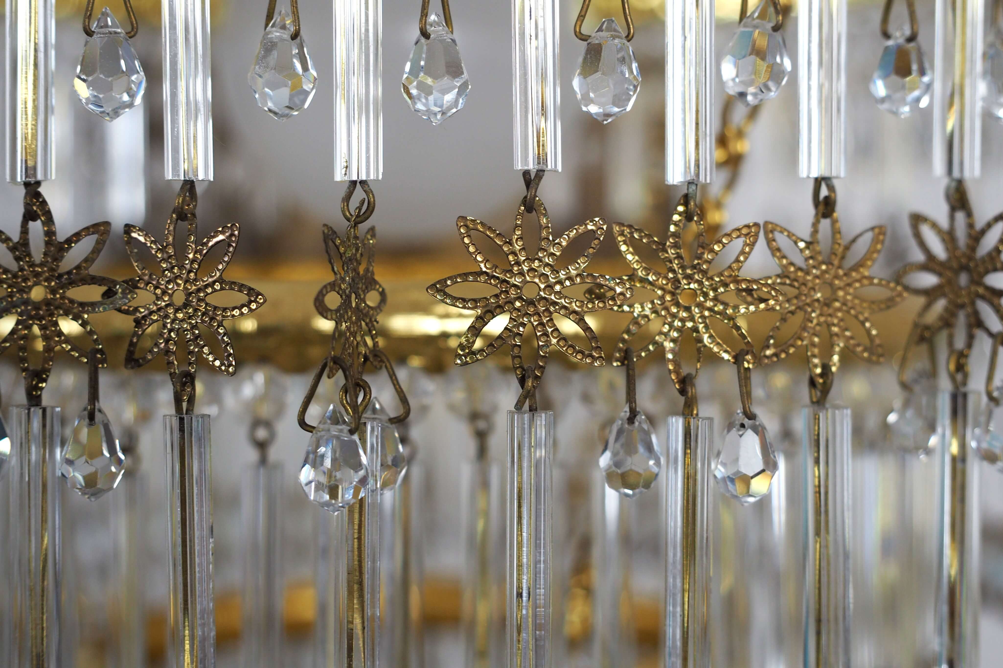 Lengva bronzinio rėmo geometrija, proporcingas dizainas šviestuvui suteikia švarios estetikos, o ažūriškos detalės ir krištoliniai elementai įneša šviesos žaismės bei struktūrinio gylio.