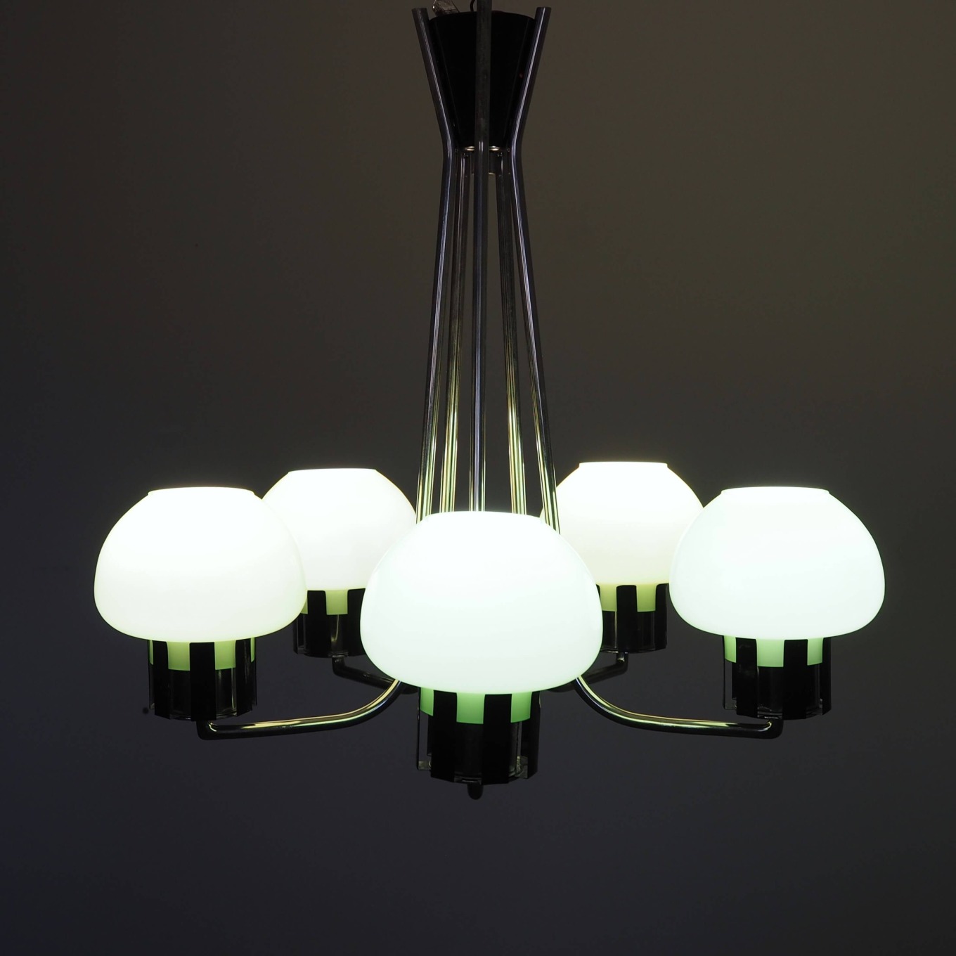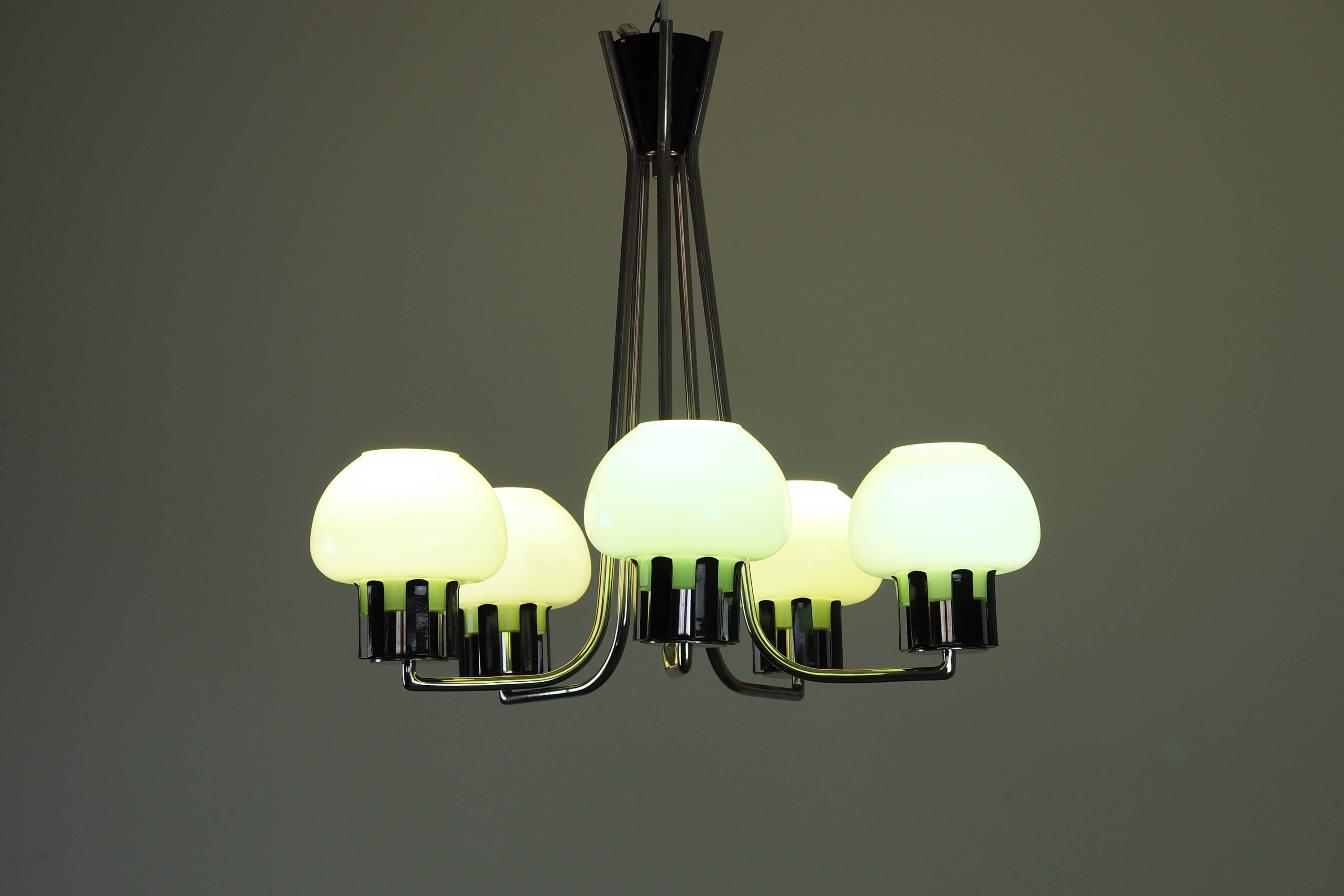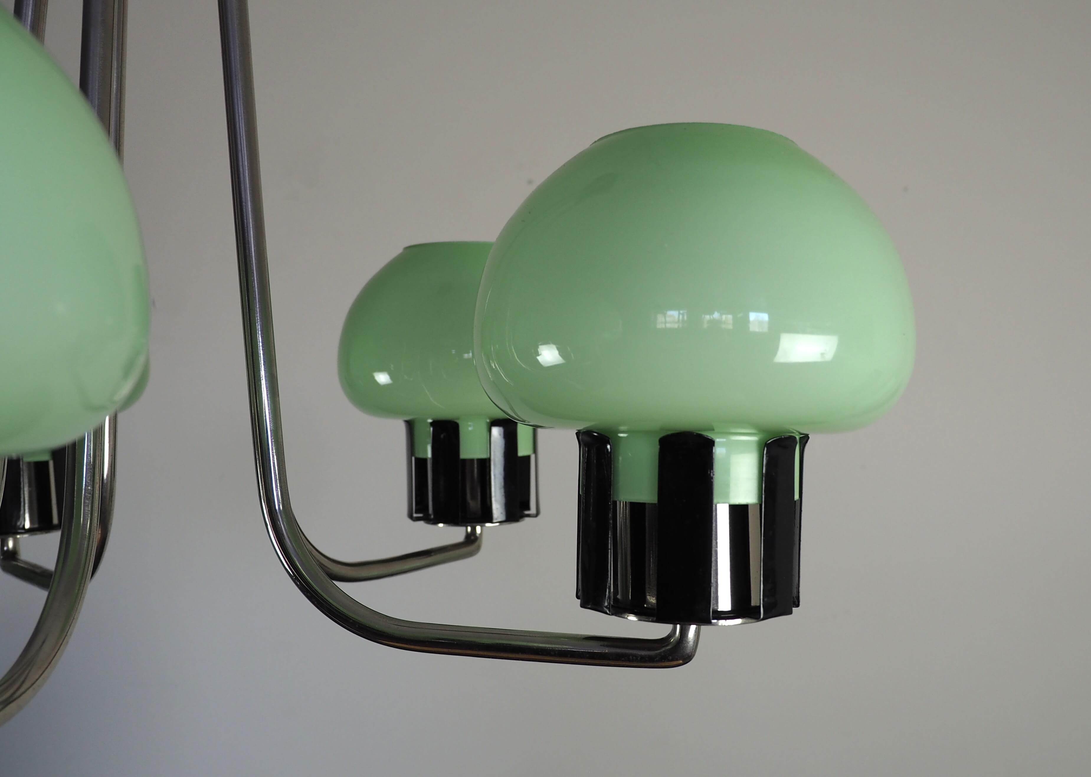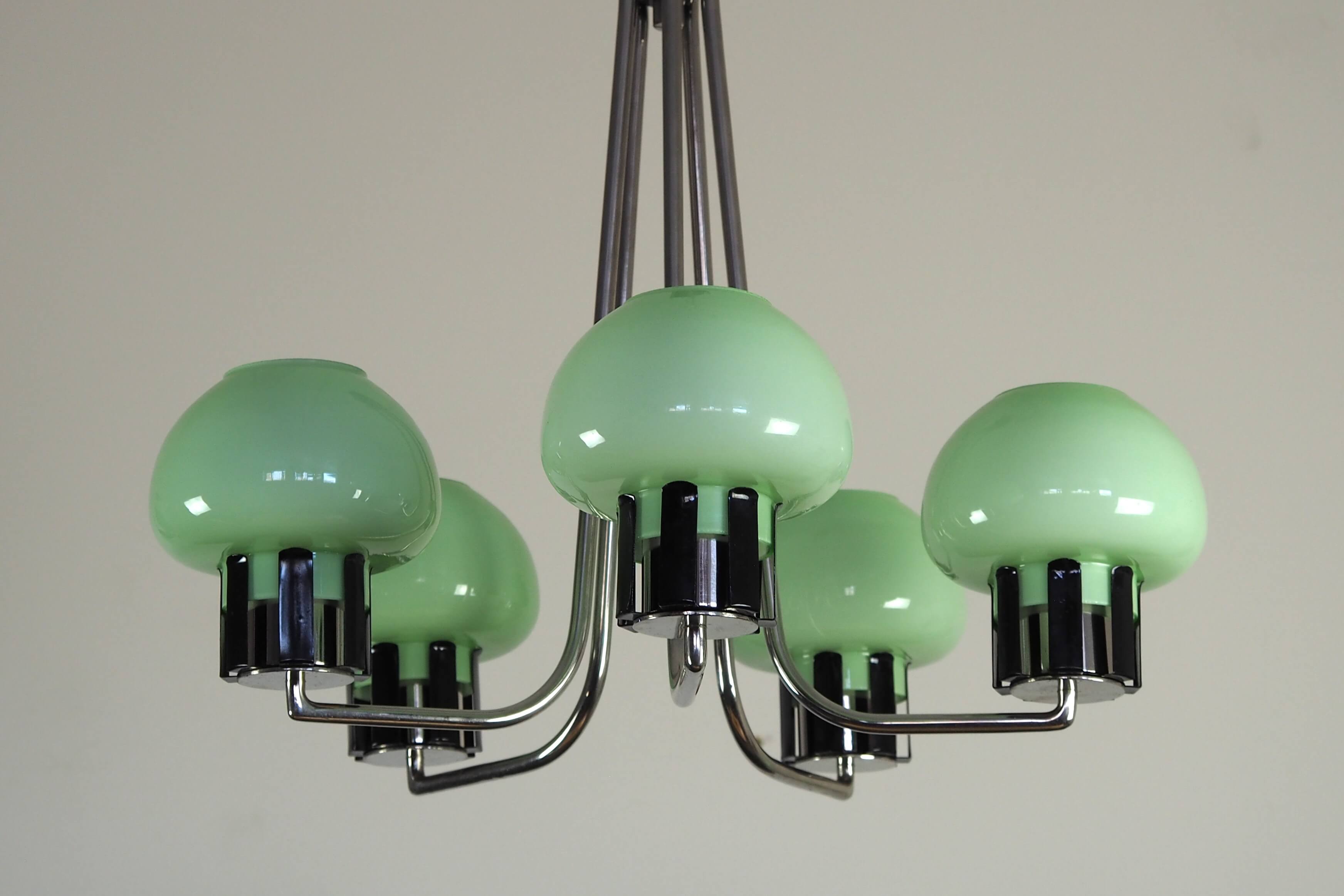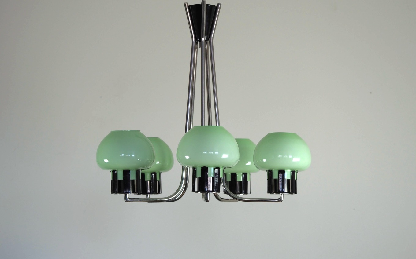 Autentiškas lenkiškas Mid Century Modern šviestuvas su penkiais mėtinės spalvos stiklo gaubtais ir grakščiu chromuotu karkasu. Šviestuvas į patalpą įneša linksmą pop art nuotaiką - gaubtai nedidukai, tarsi žaisliniai, primena mažas ledų porcijas, todėl šviestuvas atrodo lengvas, žaismingas ir iš karto sukuria jaukią retro atmosferą. Puikus pasirinkimas ieškantiems išskirtinio 1960–1970-ųjų vintažinio akcento.