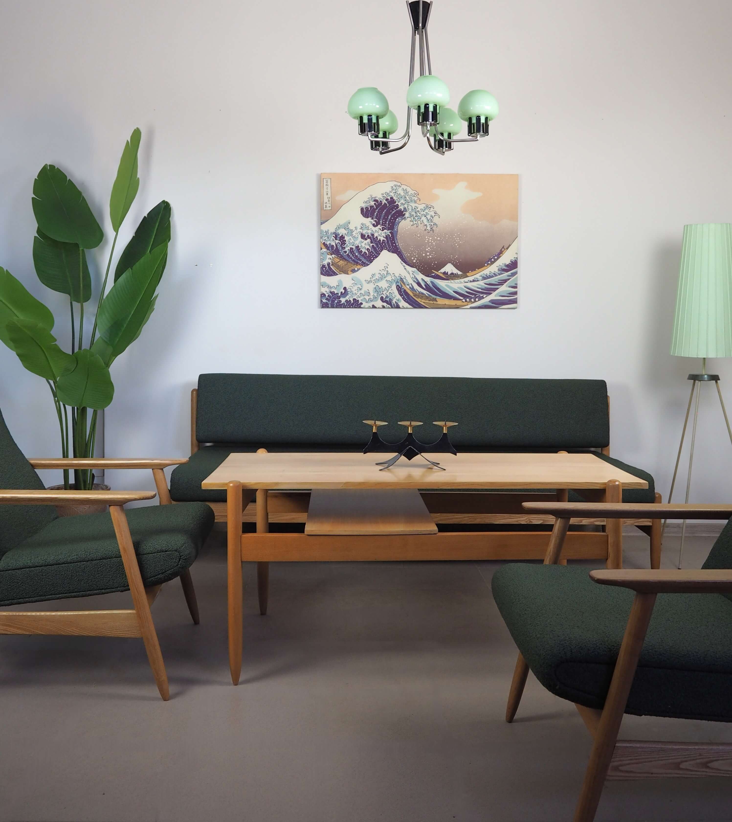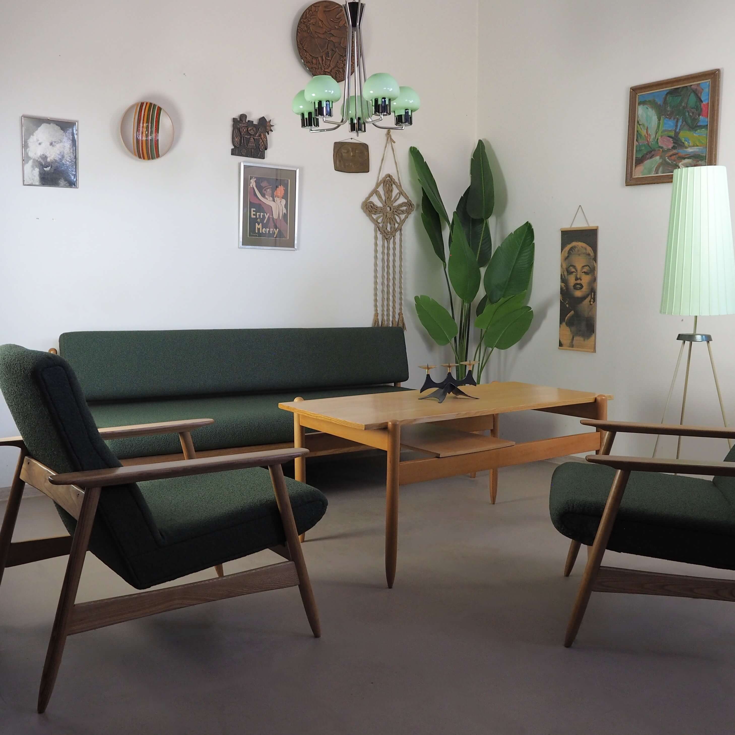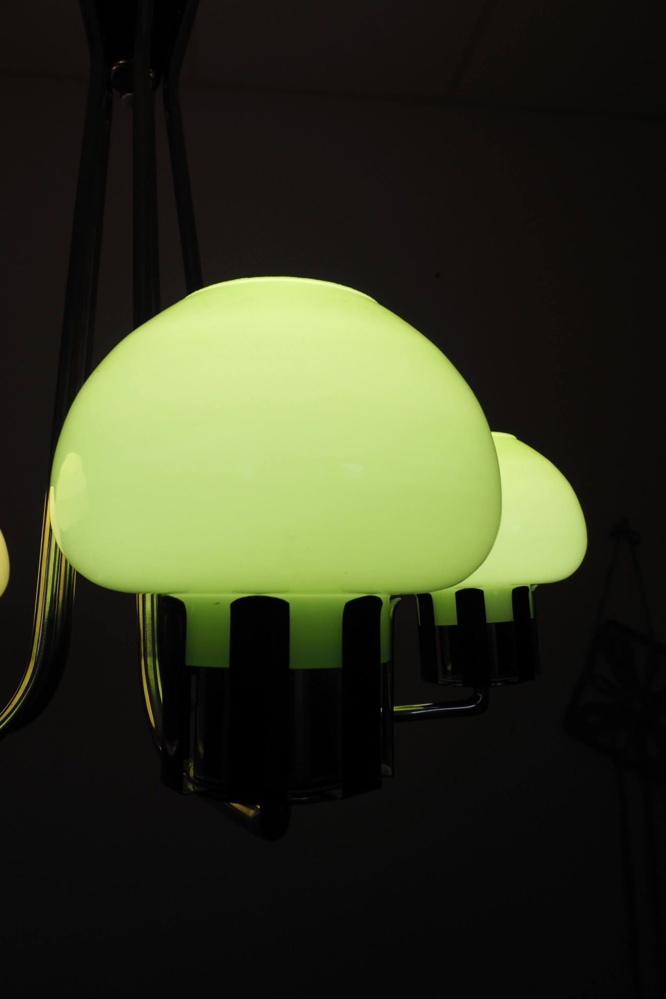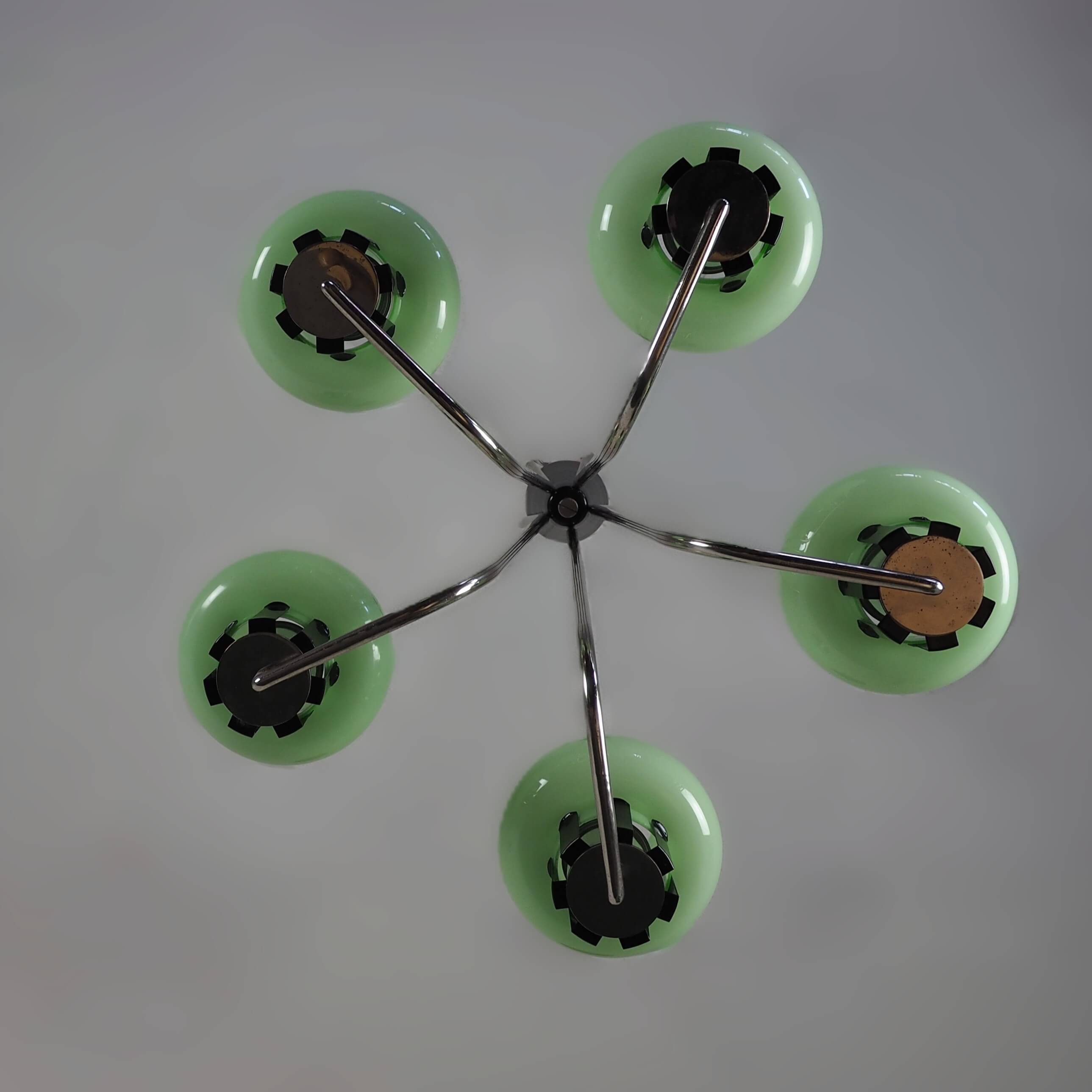 Autentiškas lenkiškas Mid Century Modern šviestuvas su penkiais mėtinės spalvos stiklo gaubtais ir grakščiu chromuotu karkasu. Šviestuvas į patalpą įneša linksmą pop art nuotaiką - gaubtai nedidukai, tarsi žaisliniai, primena mažas ledų porcijas, todėl šviestuvas atrodo lengvas, žaismingas ir iš karto sukuria jaukią retro atmosferą. Puikus pasirinkimas ieškantiems išskirtinio 1960–1970-ųjų vintažinio akcento.