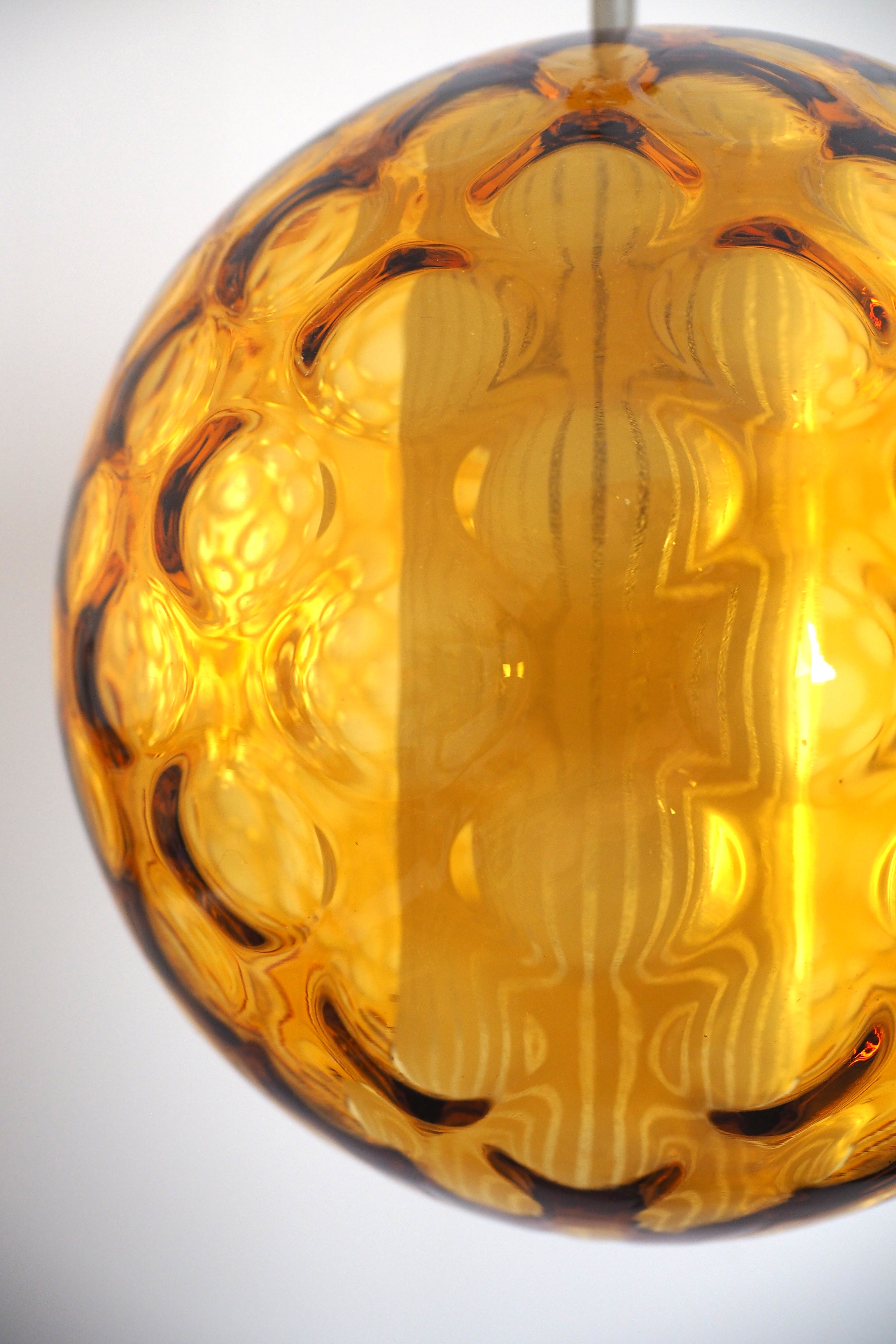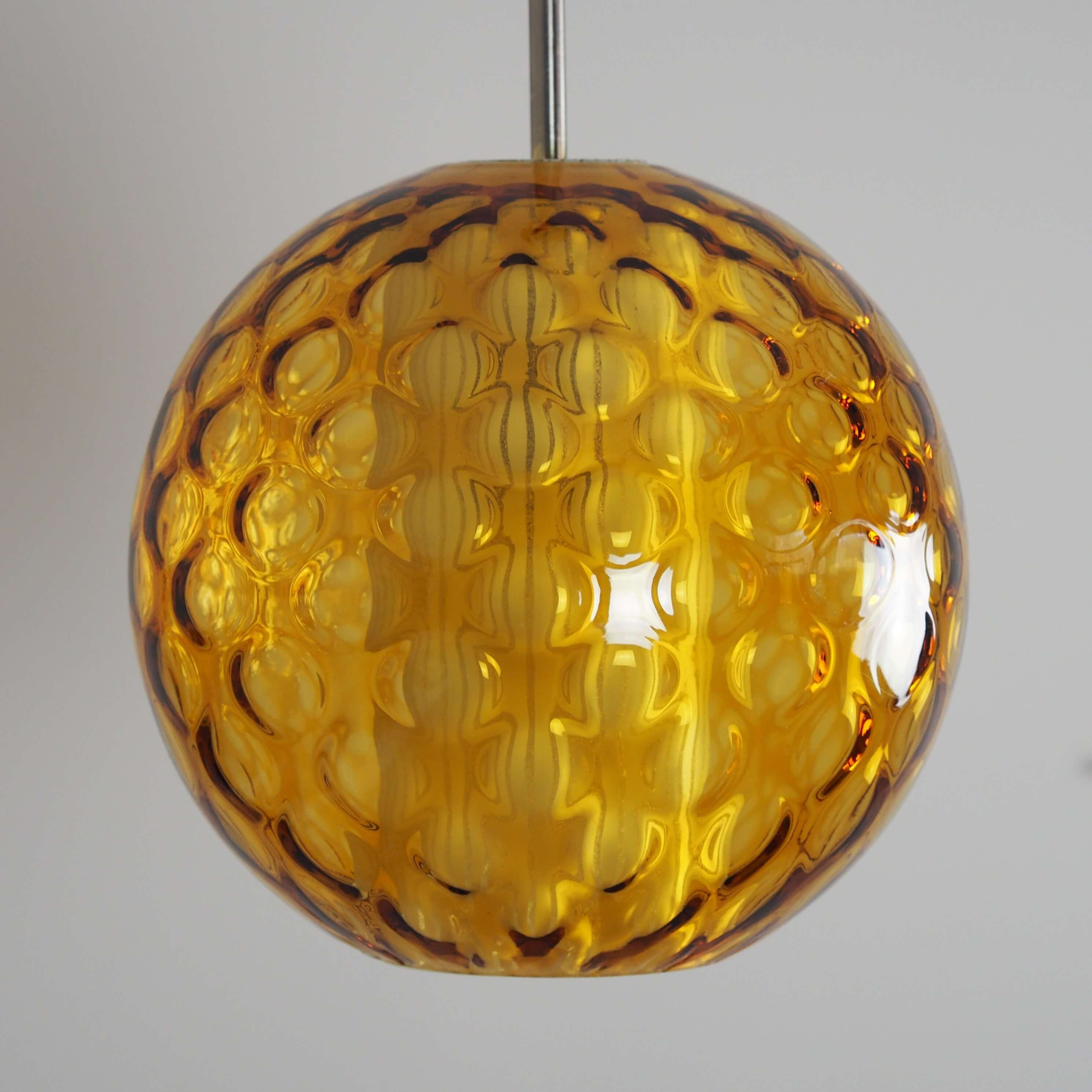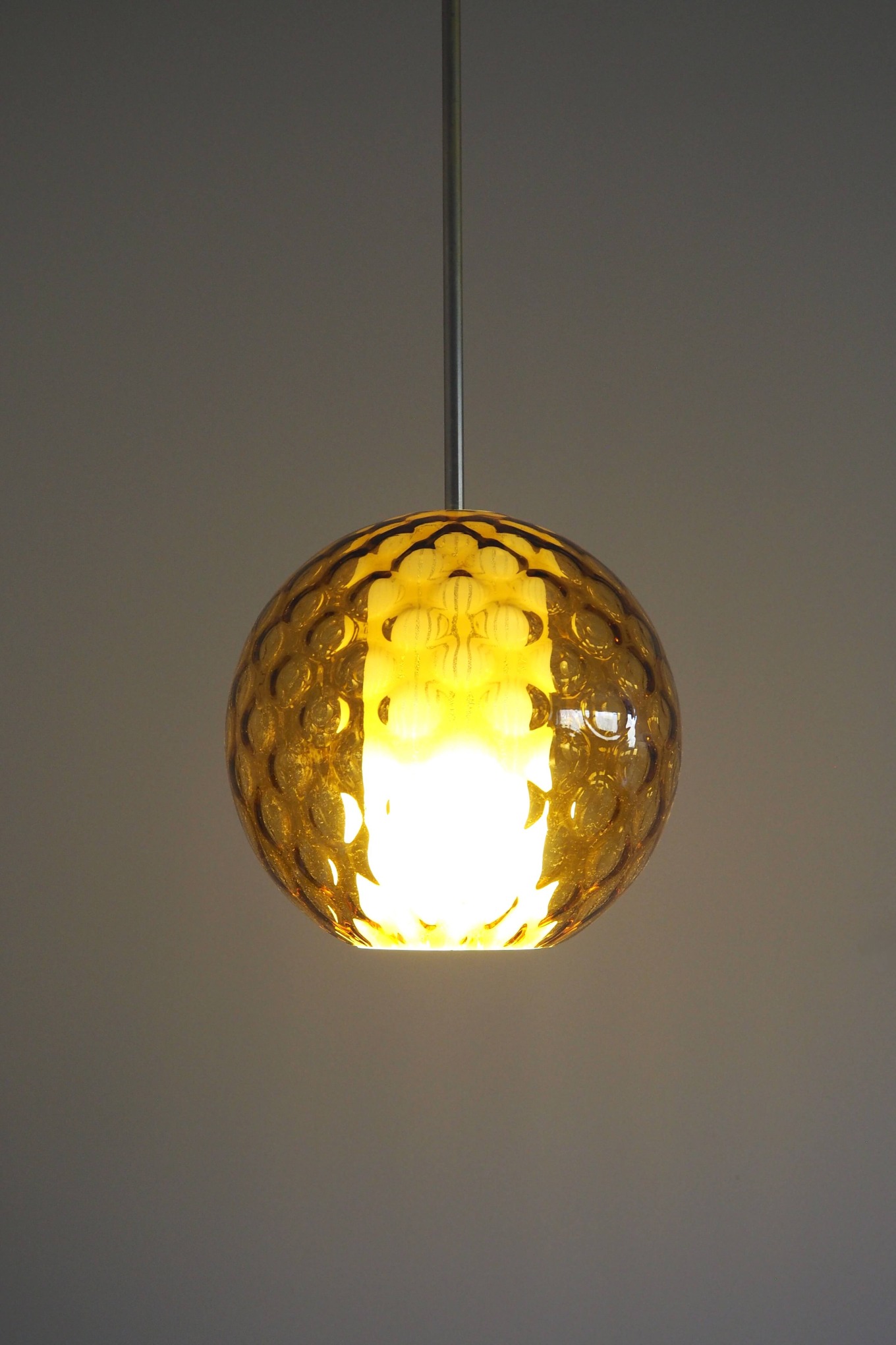 Akcentinis Mid Century Modern šviestuvas su dvigubu gaubtu. Gintaro spalvos burbuliuotas išorinis stiklas ir vidinis cilindrinis difuzorius su vertikaliomis linijomis sukuria šiltą, grafišką šviesos ornamentą. Šviestuvas skleidžia tolygią, jaukią šviesą ir tampa išraiškinga detale bet kuriame interjere.