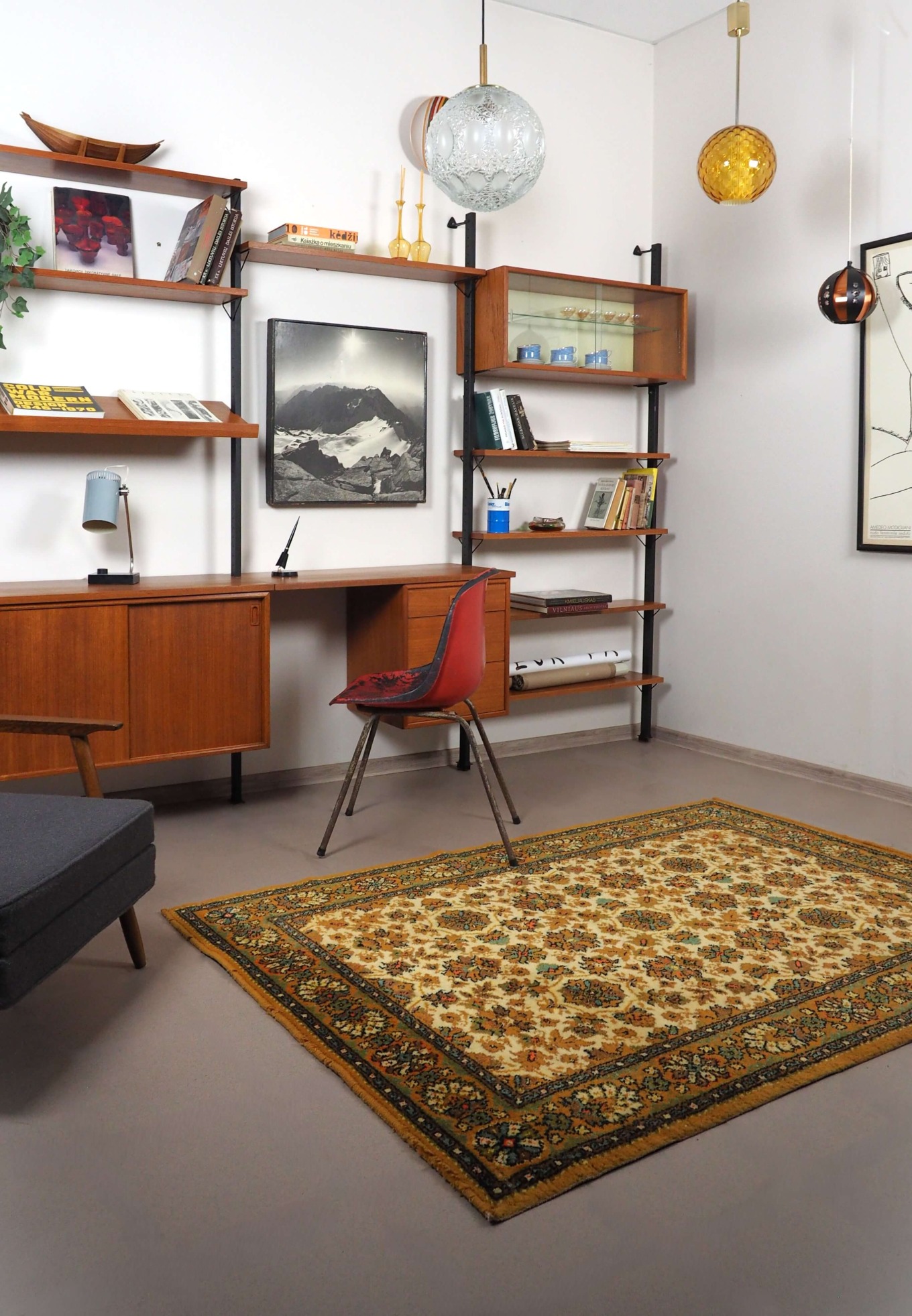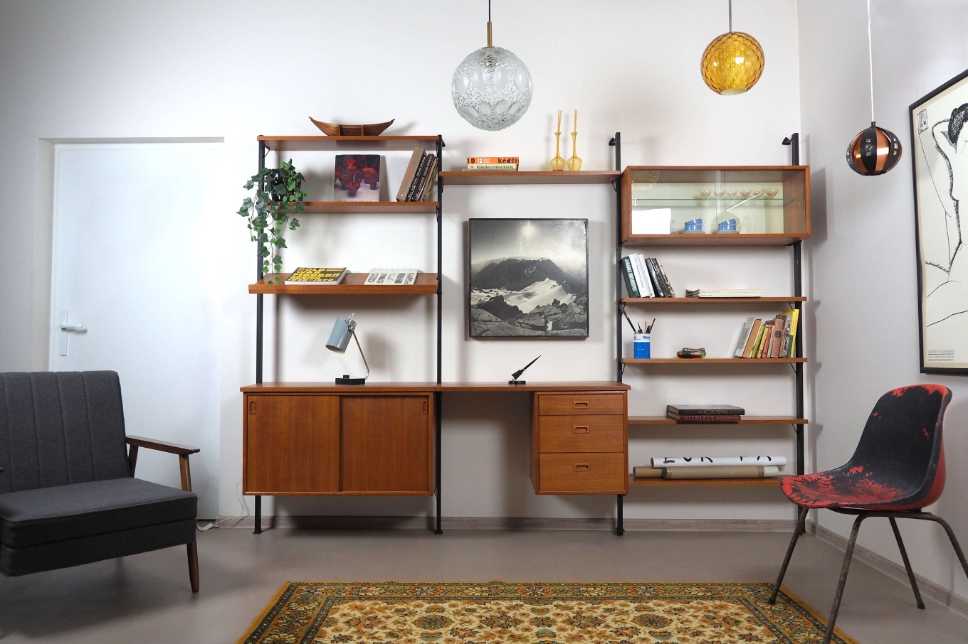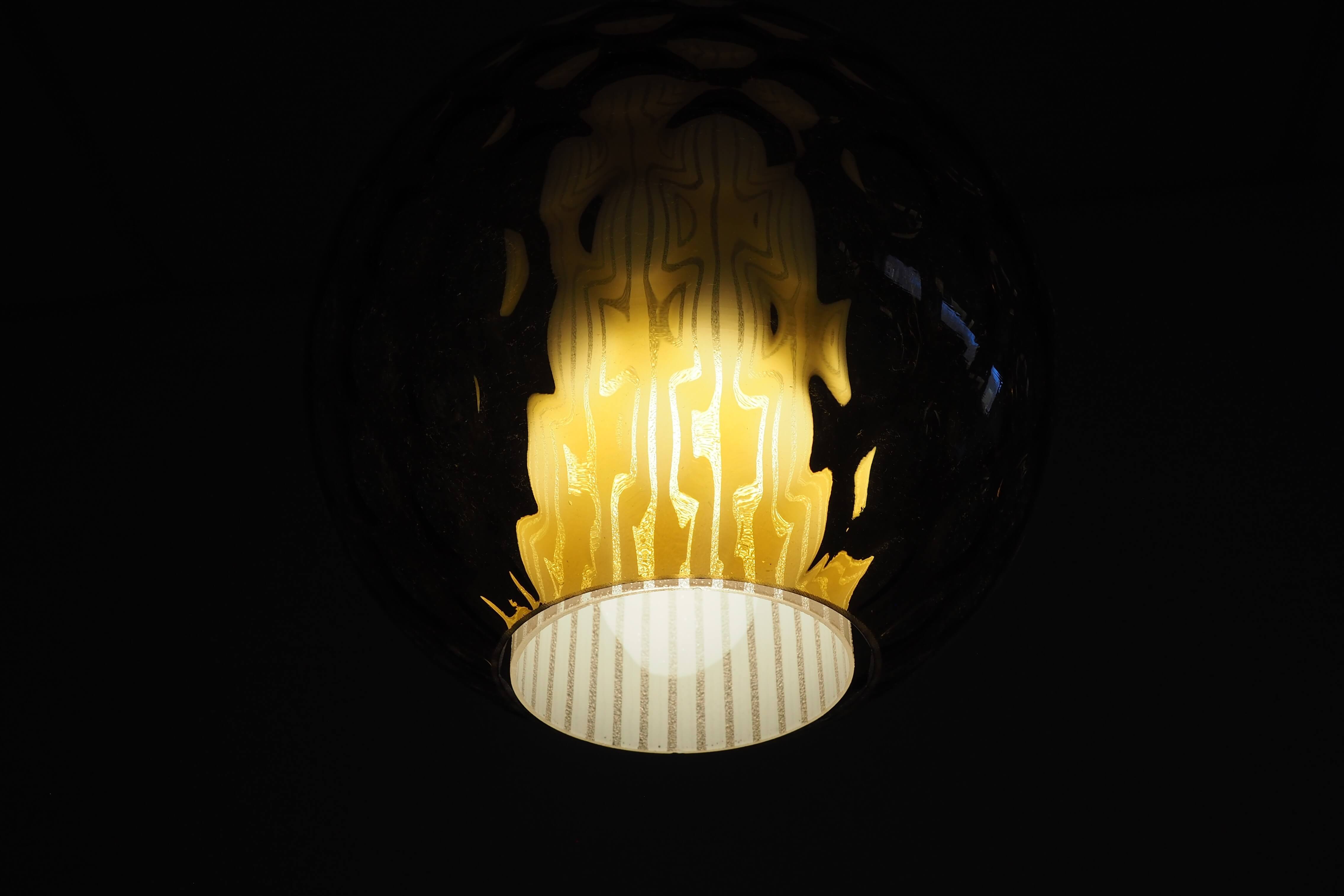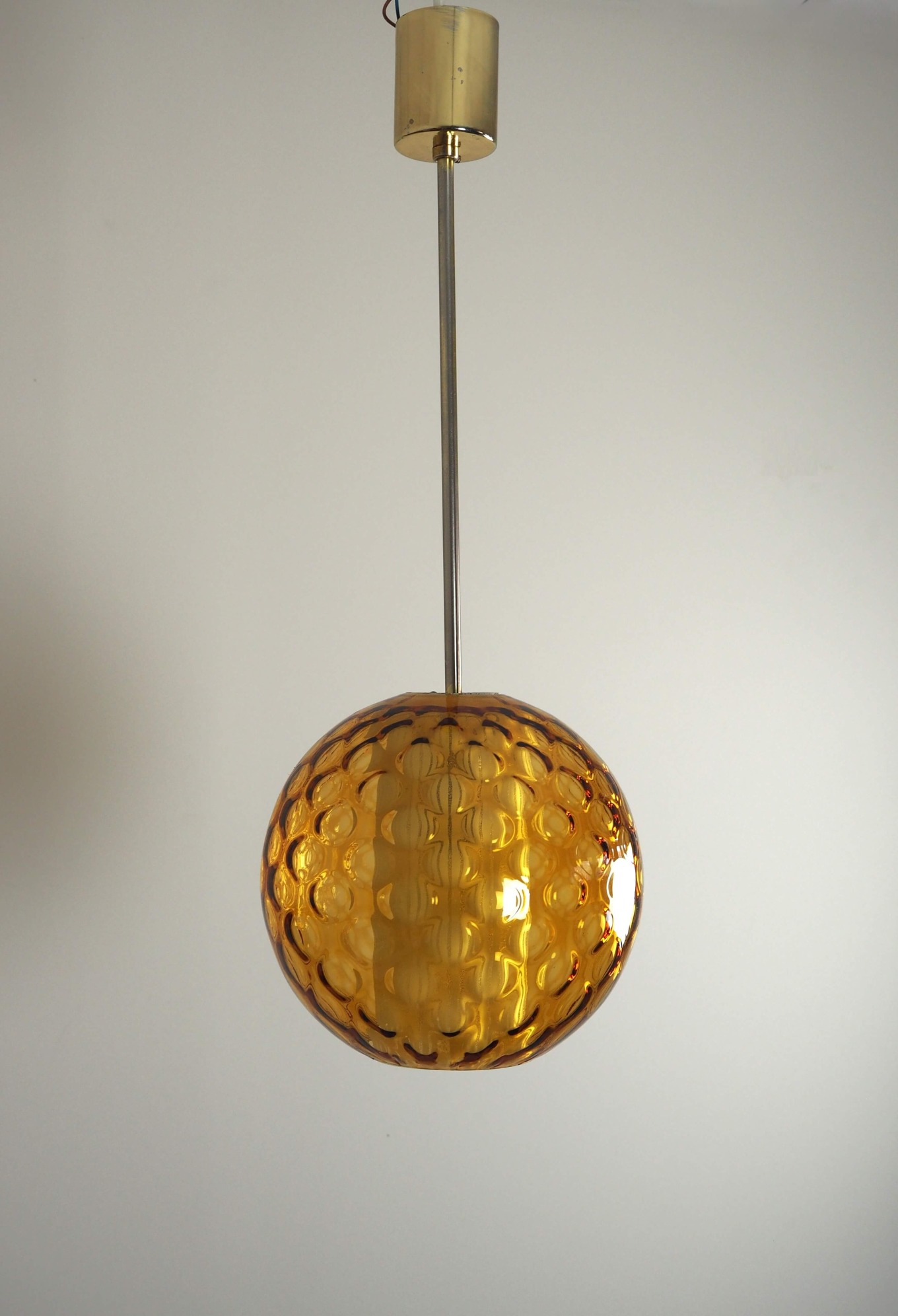 Akcentinis Mid Century Modern šviestuvas su dvigubu gaubtu. Gintaro spalvos burbuliuotas išorinis stiklas ir vidinis cilindrinis difuzorius su vertikaliomis linijomis sukuria šiltą, grafišką šviesos ornamentą. Šviestuvas skleidžia tolygią, jaukią šviesą ir tampa išraiškinga detale bet kuriame interjere.