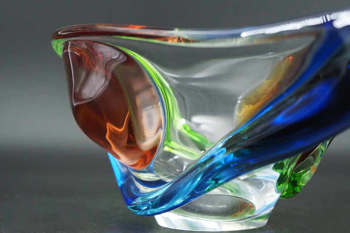 Didelė sunki krištolinė vaza vaisiams iš garsios čekoslovakiškos vazų kolekcijos "Rapsodija", kuri buvo gaminama Mstišovo stiklo fabrike 1956-1963 m. Kolekcijos autorius - Františekas Zemekas, vienas garsiausių to laikmečio stiklo dizainerių. Vaza ant dugno turi nežymių naudojimo pėdsakų, bendrai būklė labai gera.